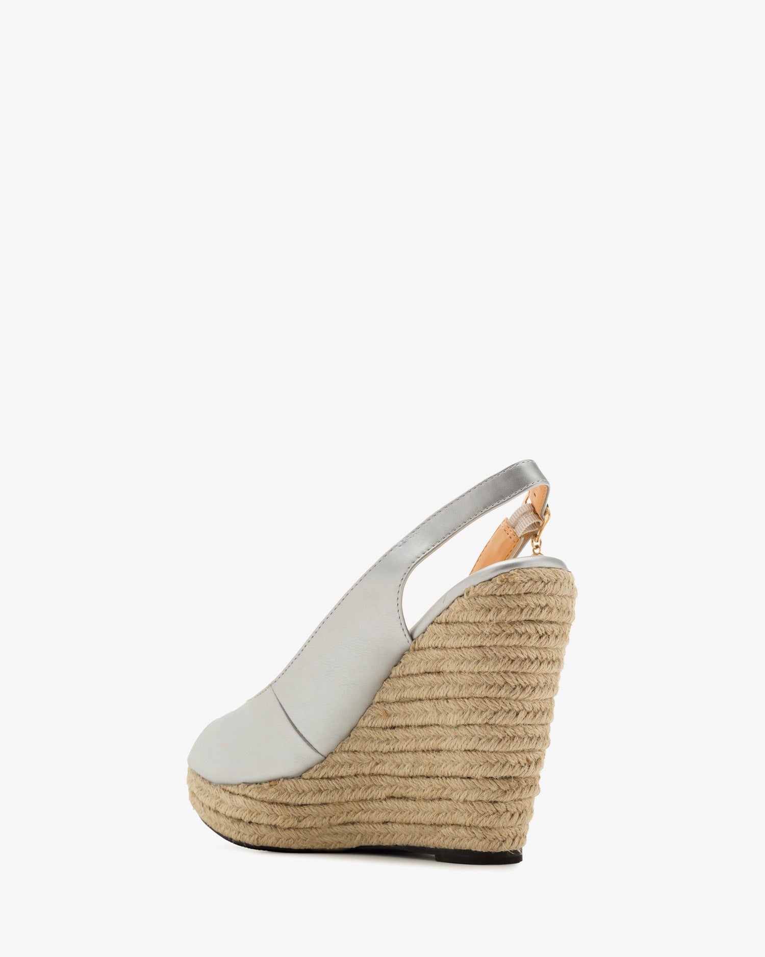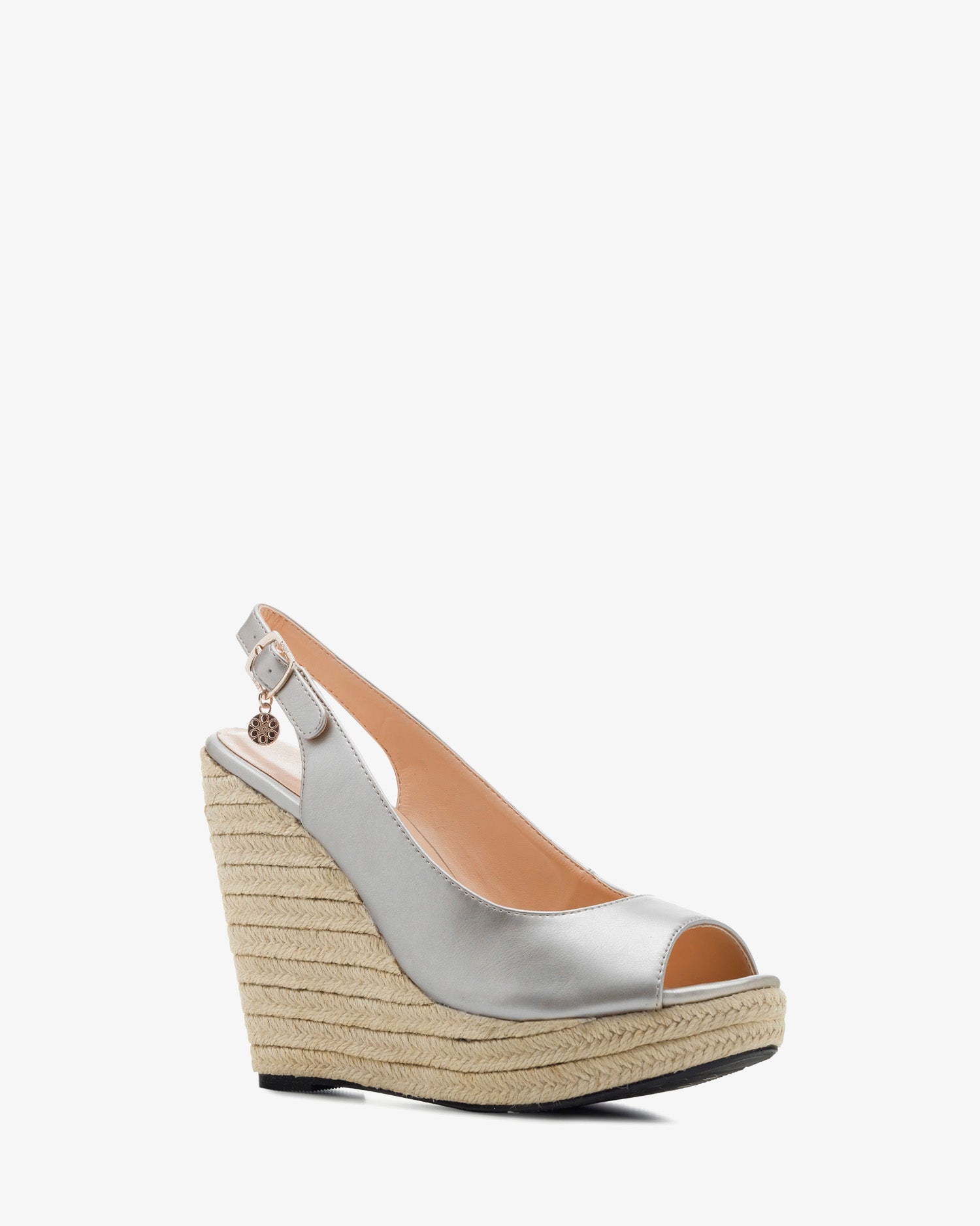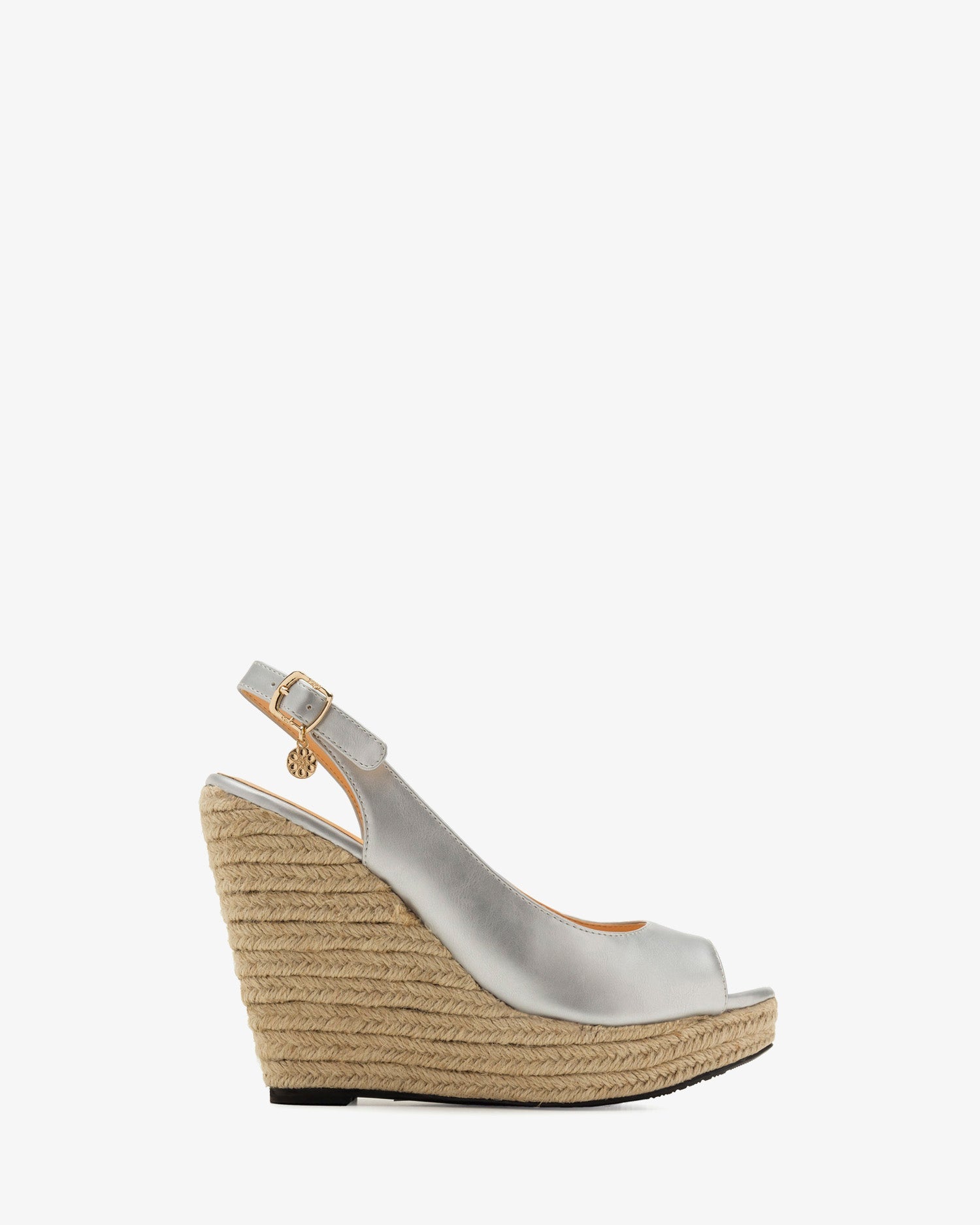 Cuñas en Soft de Color Plata y cierre de hebilla en el lateral. Suela de Yute trenzado de 11 cm y plataforma delantera de 2 cm para las tallas pequeñas de la 32 a la 35 y de 14 cm con plataforma delantera de 3 cm para las tallas grandes de la 42 a la 45.