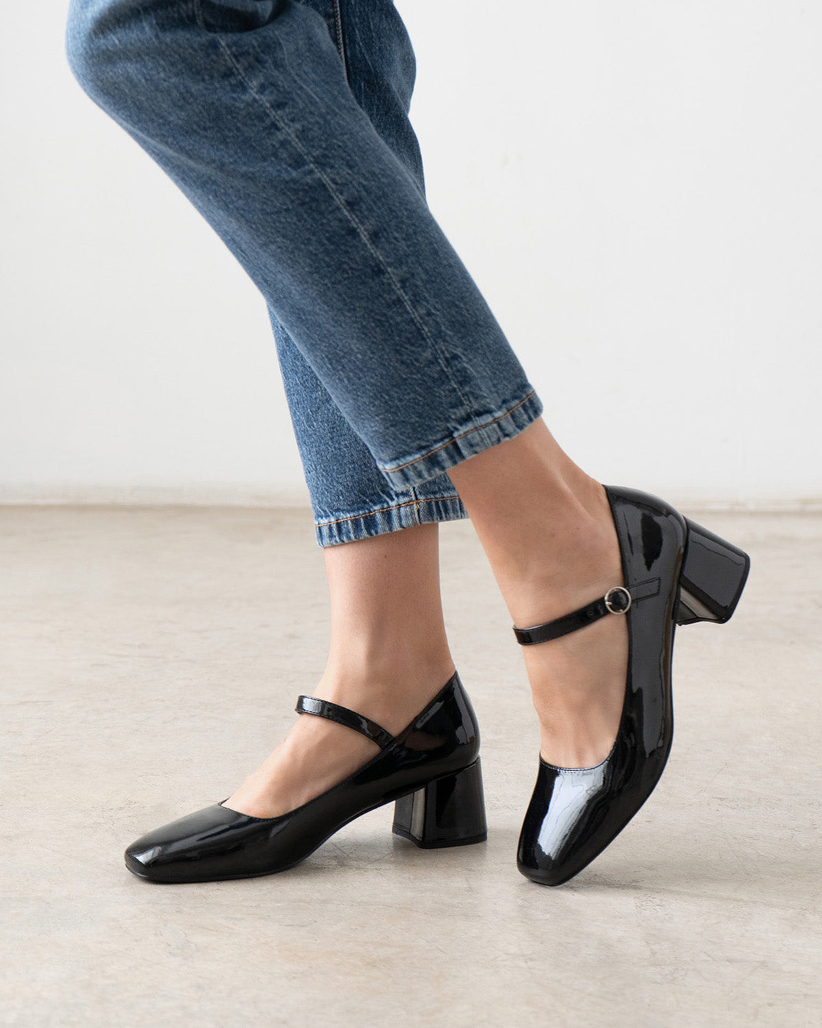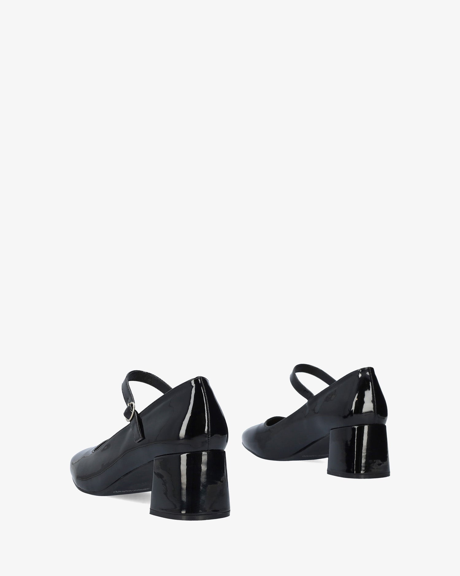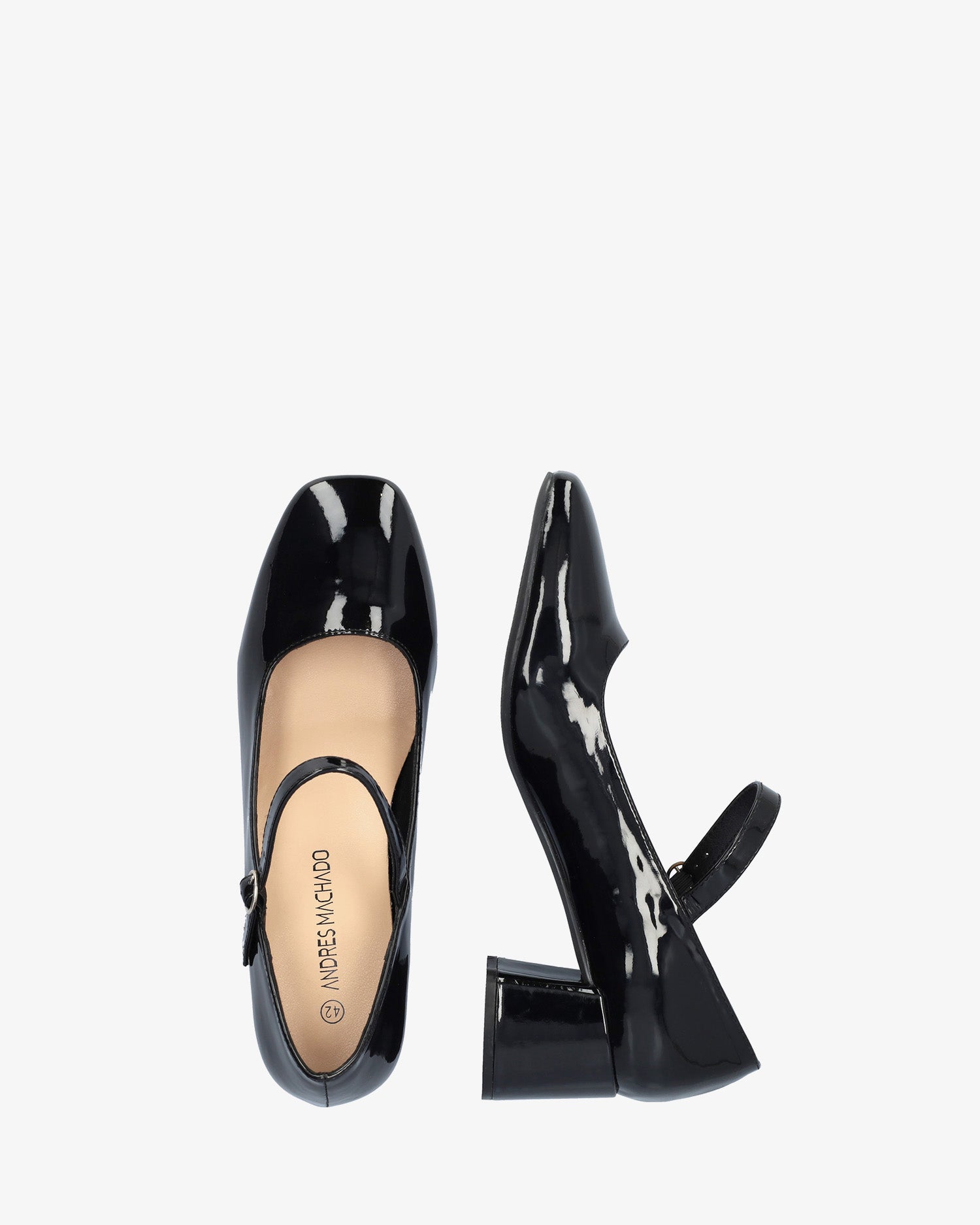 Zapato estilo Mary Jane con tacón en charol de color negro. Acabado en punta cuadrada y tira en el empeine con hebilla metálica lateral. Tacón cuadrado forrado al tono de 6 cm para las tallas pequeñas de la 32 a la 35 y tacón de 6 cm para las tallas grandes de la 42 a la 46.