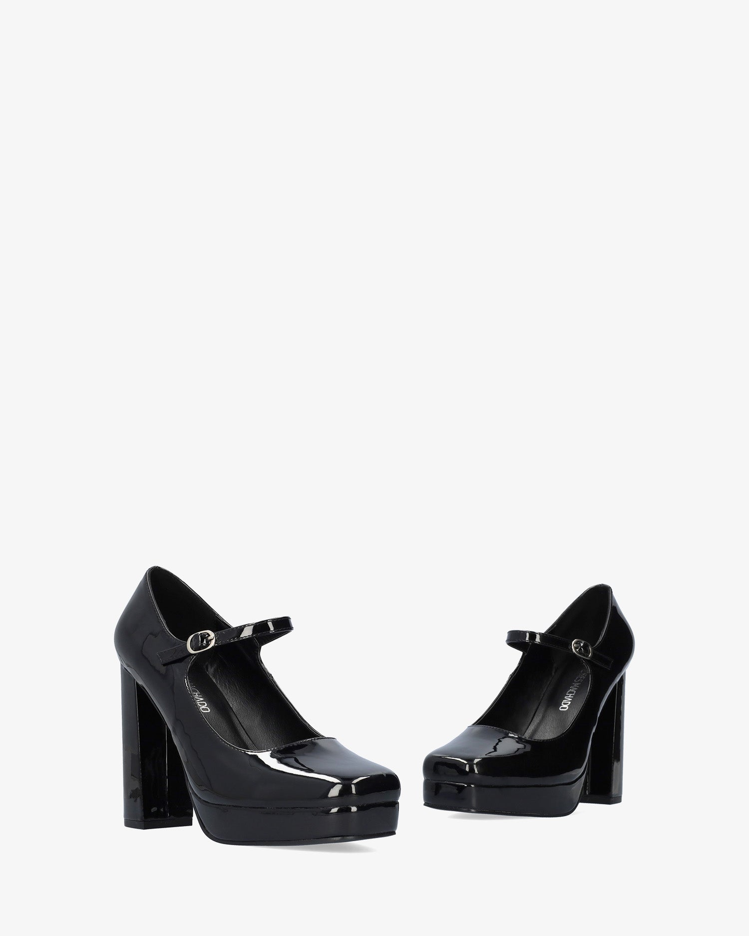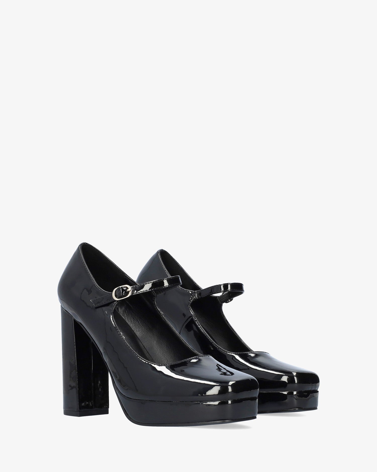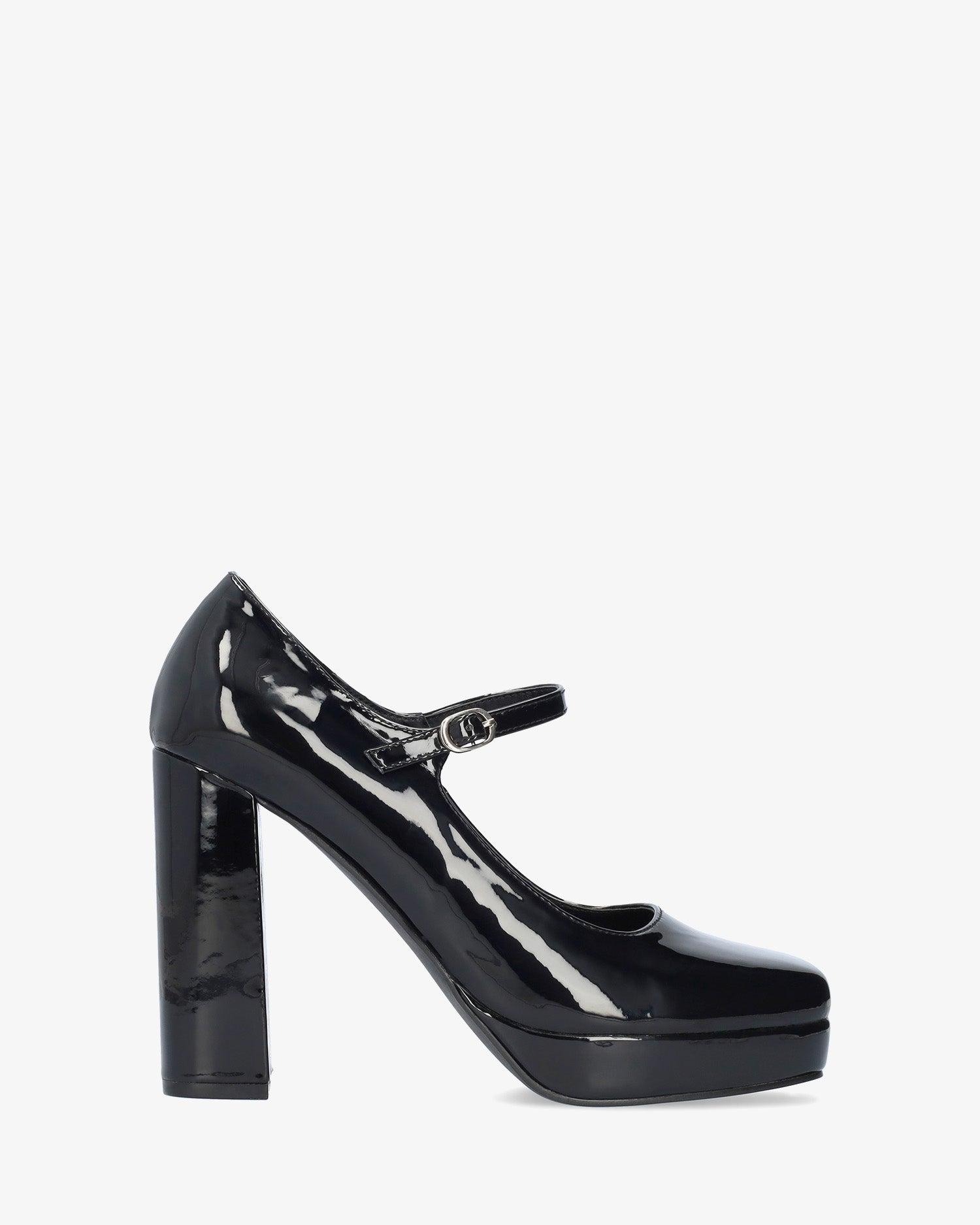Zapato estilo Mary Jane con tacón y plataforma en charol de color negro.Acabado en punta cuadrada y tira en el empeine con hebilla metálica lateral. Tacón alto cuadrado forrado al tono de 11 cm y plataforma de 2 cm para las tallas pequeñas de la 32 a la 35 y tacón de 12 cm y plataforma de 2,5 cm para las tallas grandes de la 42 a la 45.