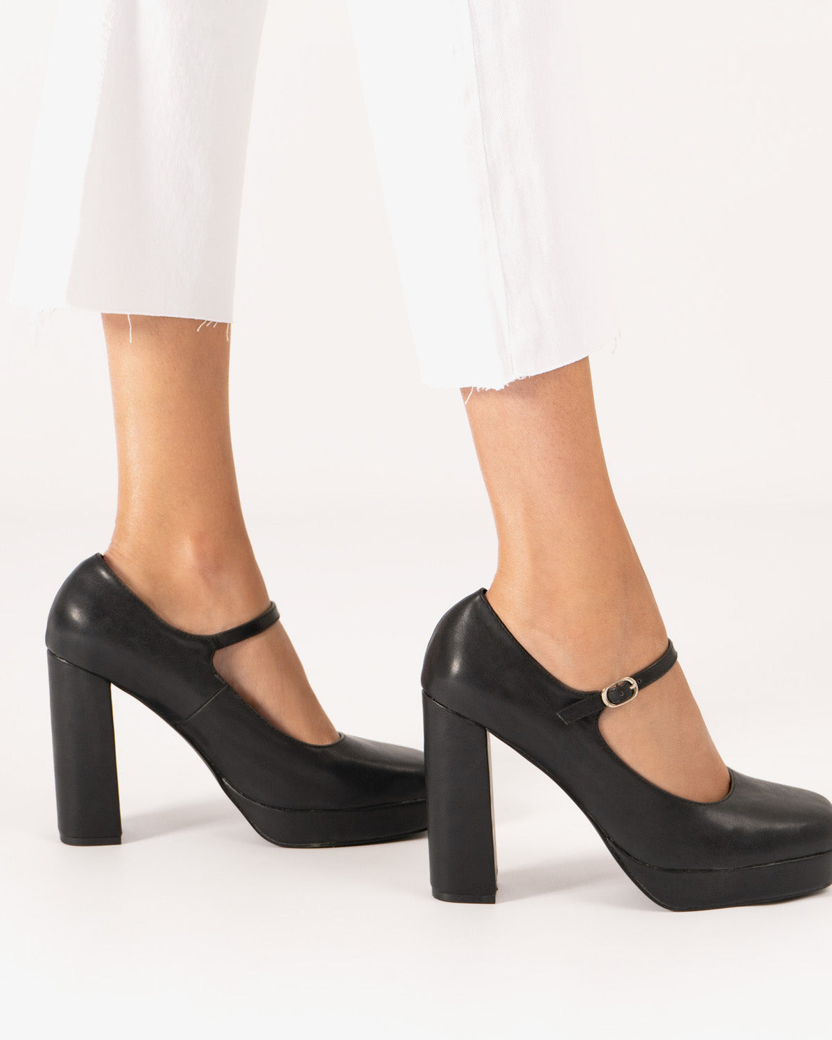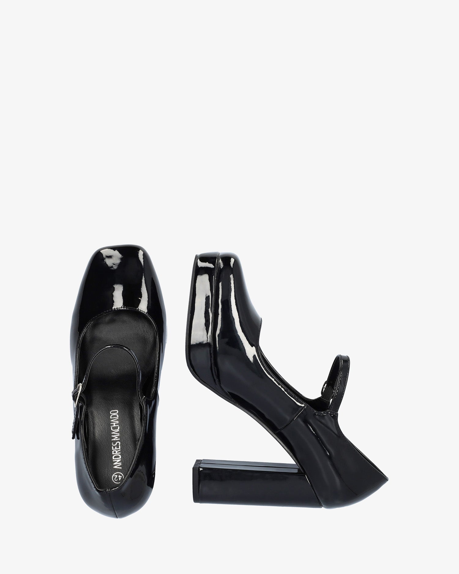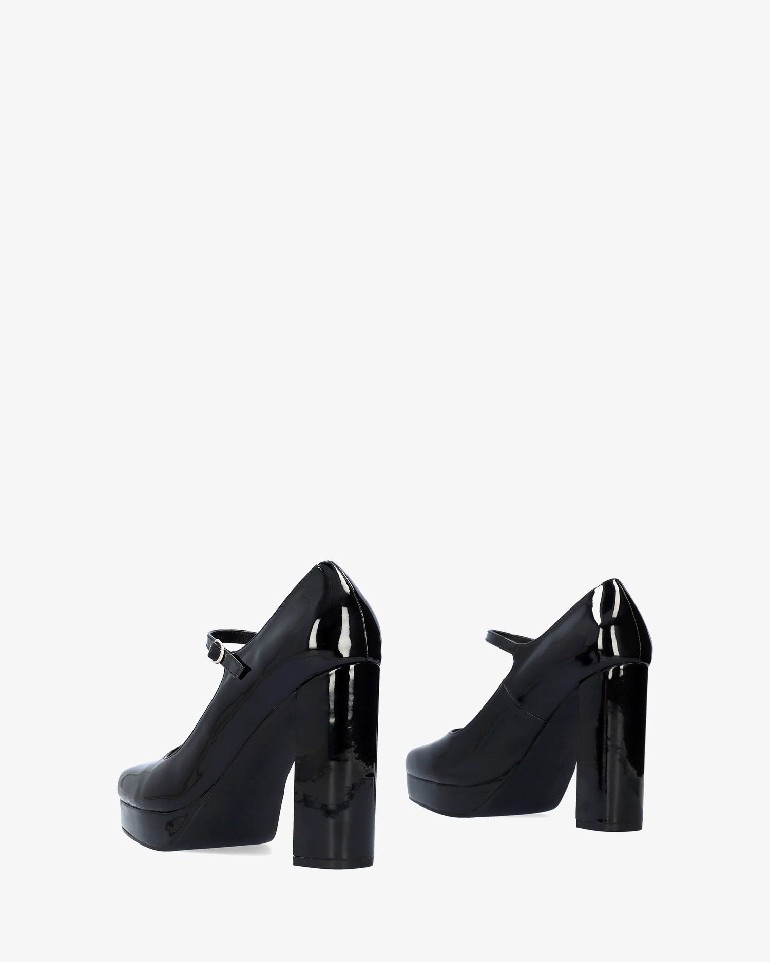 Zapato estilo Mary Jane con tacón y plataforma en charol de color negro.Acabado en punta cuadrada y tira en el empeine con hebilla metálica lateral. Tacón alto cuadrado forrado al tono de 11 cm y plataforma de 2 cm para las tallas pequeñas de la 32 a la 35 y tacón de 12 cm y plataforma de 2,5 cm para las tallas grandes de la 42 a la 45.