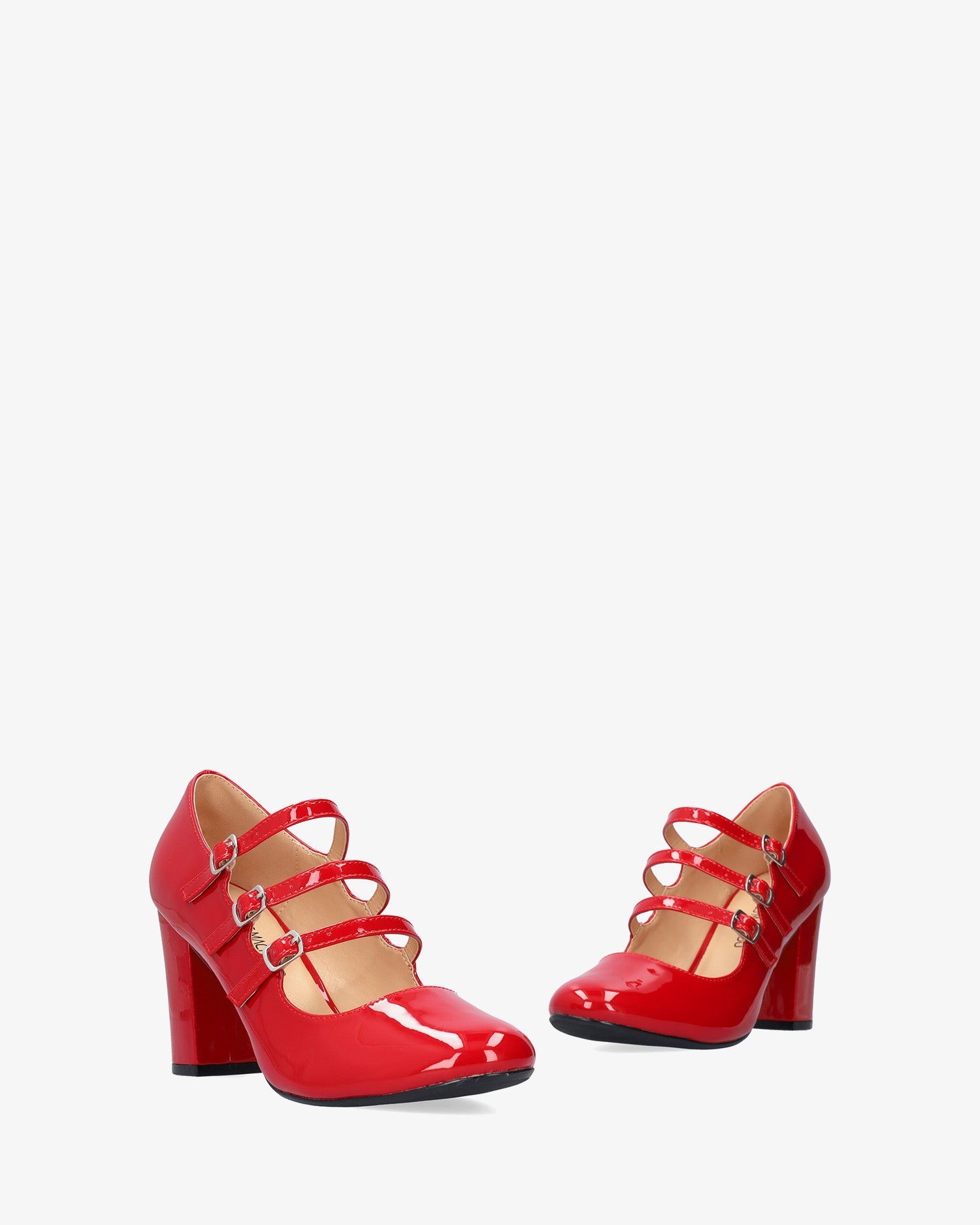 Zapato estilo Mary Jane con tacón en charol de color rojo. Acabado en punta redonda y 3 tiras envolventes en el empeine con hebilla metálica lateral. Tacón cuadrado forrado al tono de 9 cm para las tallas pequeñas de la 32 a la 35 y tacón de 9,5 cm para las tallas grandes de la 43 a la 45. Este modelo puede tener una variación de medidas respecto al estandar, te recomendamos que revises los cms de la plantilla o suela interior.