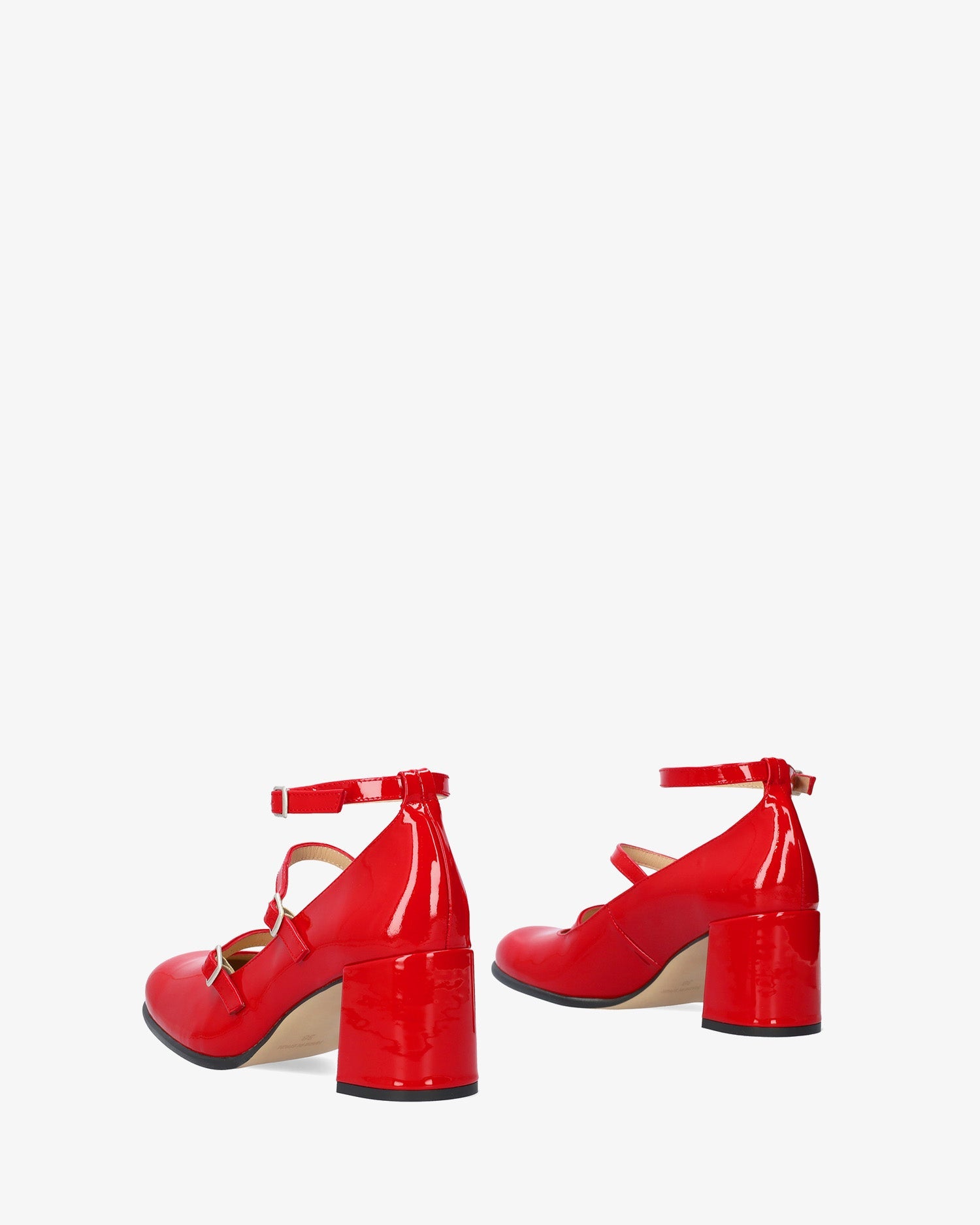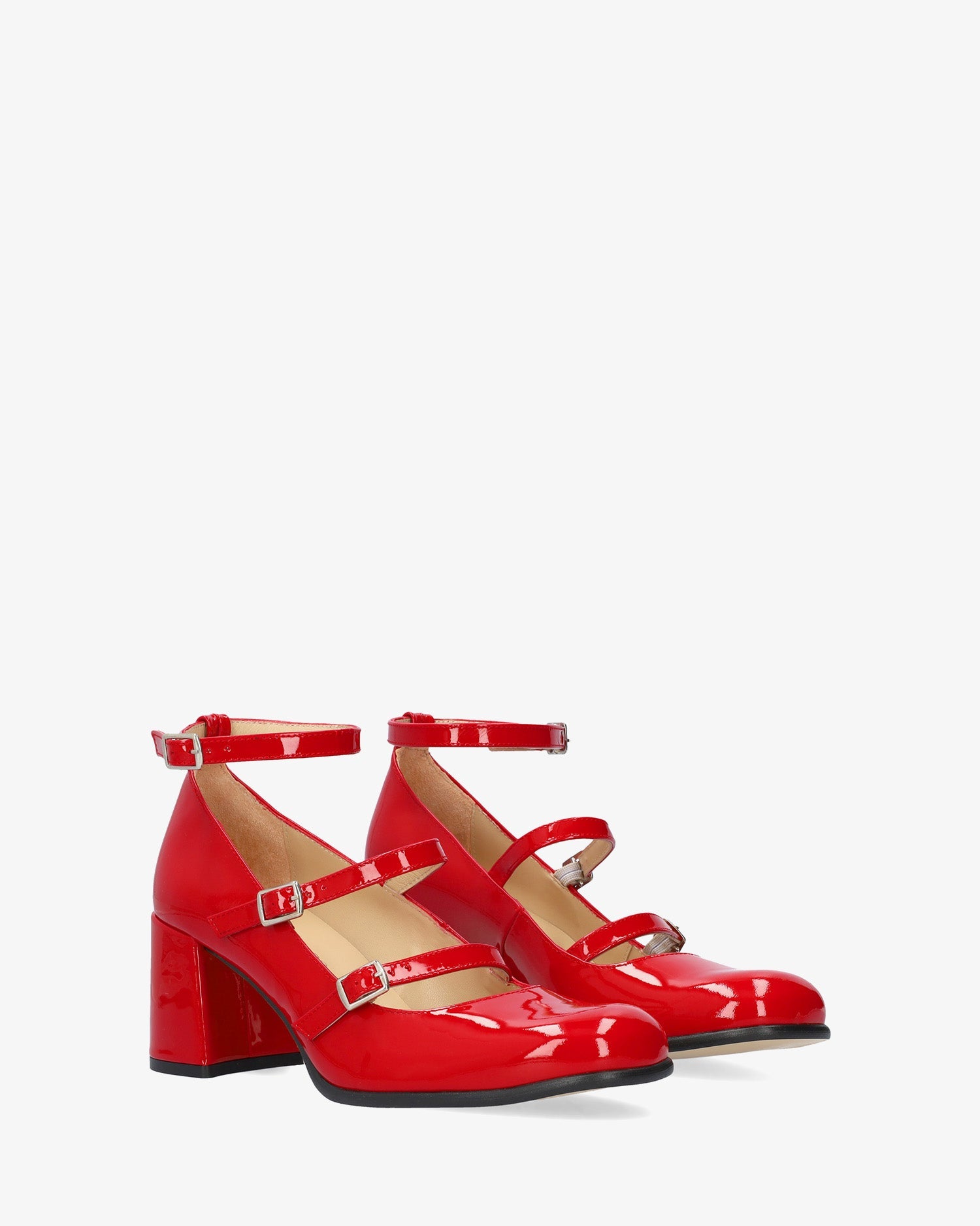 Zapato de estilo Mary Jane en charol color rojo, con punta redonda y tres tiras con elástico al mismo tono. Cuenta con ajuste en el tobillo y empeine, además de hebillas metálicas laterales. Tacón cuadrado forrado en el mismo color, de 6,5 cm para las tallas pequeñas de la 32 a la 35 y 7 cm para las tallas grandes de la 42 a la 45. Fabricado en España.