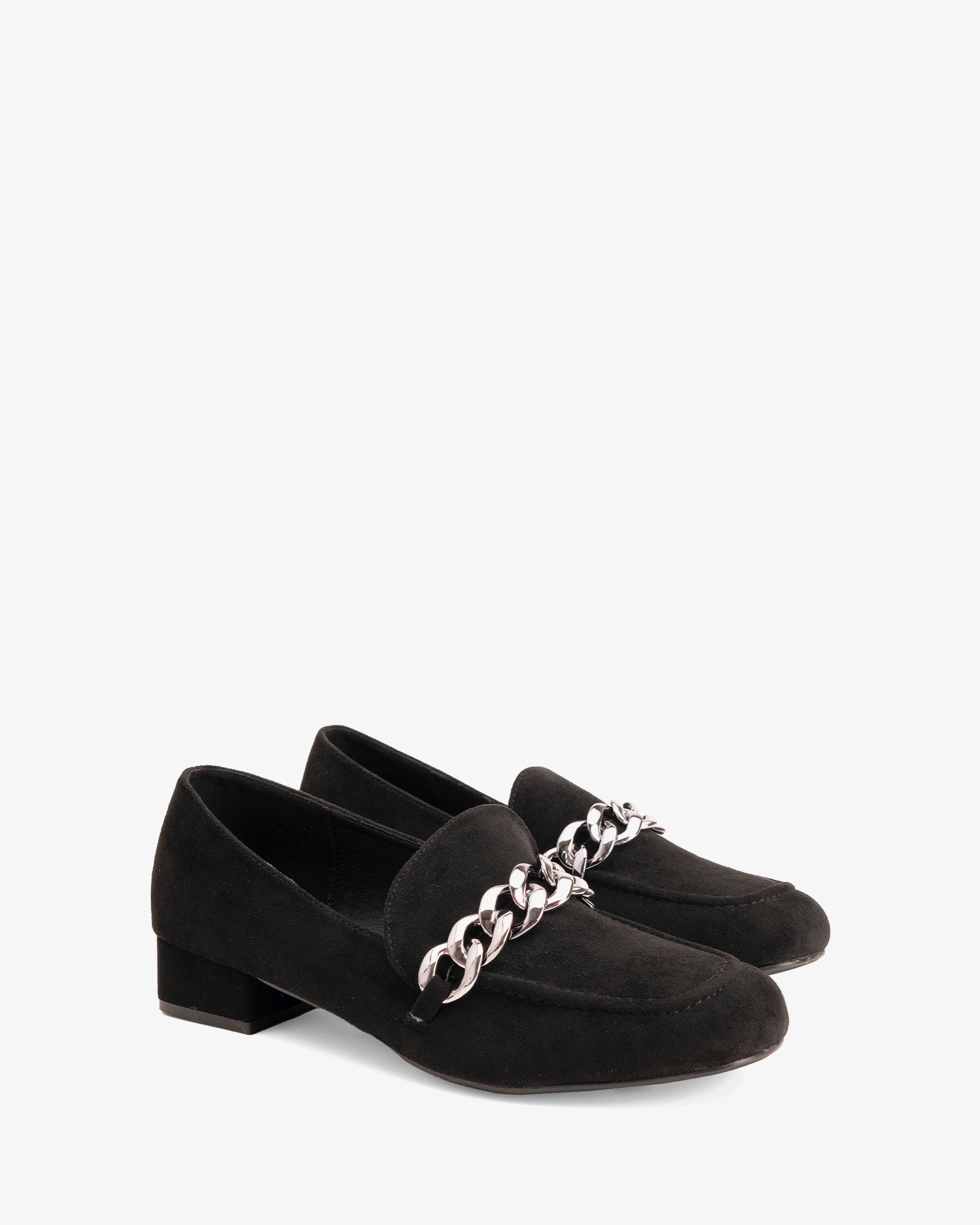 Zapato de estilo mocasín en ante negro. Detalle de maxi cadena de eslabones en color plata en el empeine. Acabado en punta cuadrada. Tacón ancho forrado al tono de 3 cm para las tallas pequeñas de la 32 a la 35. Tacón de 3 cm para las tallas grandes de la 42 a la 45.