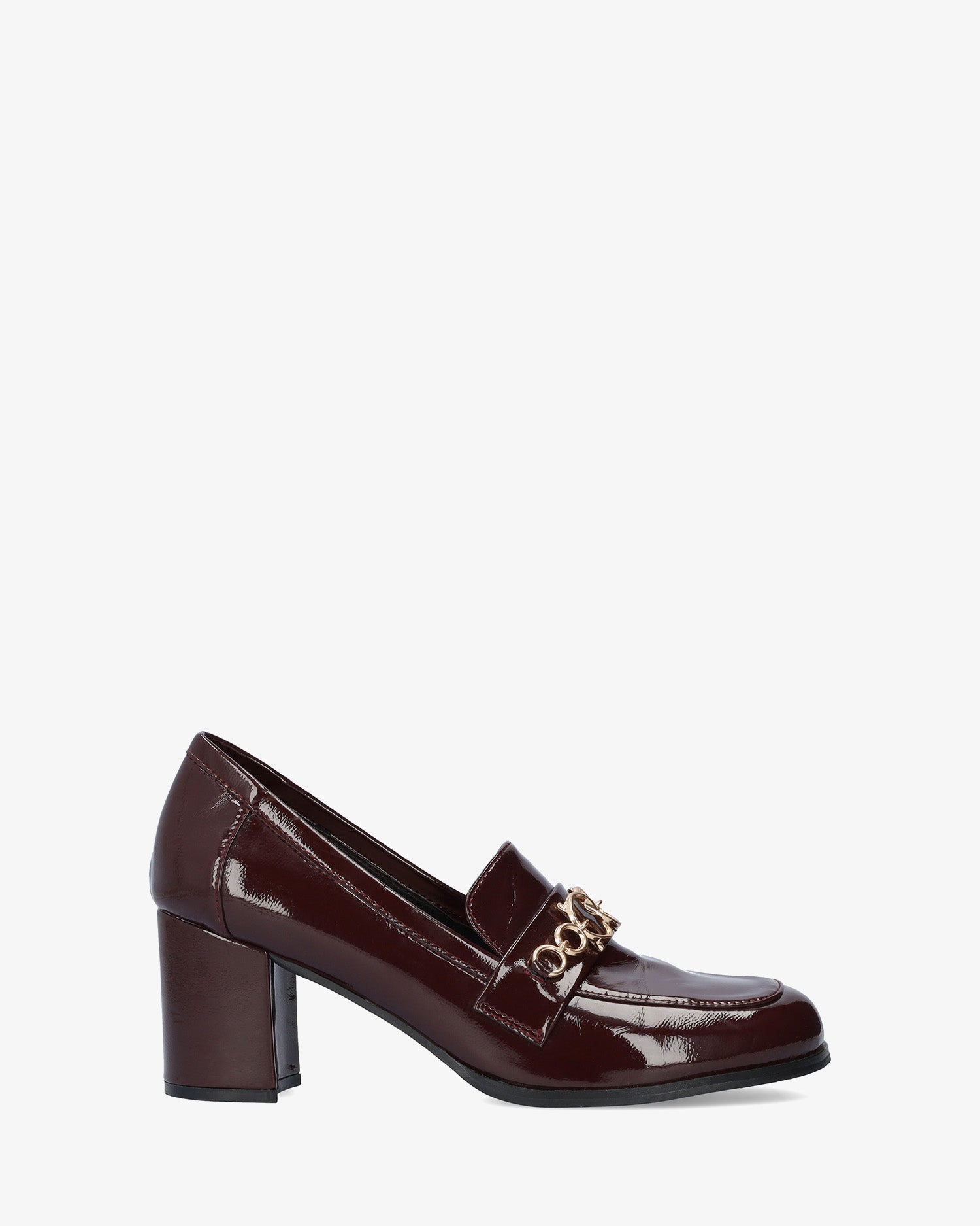 Zapato de estilo mocasín en soft charol de color Burdeos. Detalle de cadena dorada de eslabones redondos sobre el empeine. Acabado en punta redondeada. Tacón ancho forrado al tono de 7 cm para las tallas pequeñas de la 32 a la 35. Tacón de 7,5 cm para las tallas grandes de la 42 a la 45.
