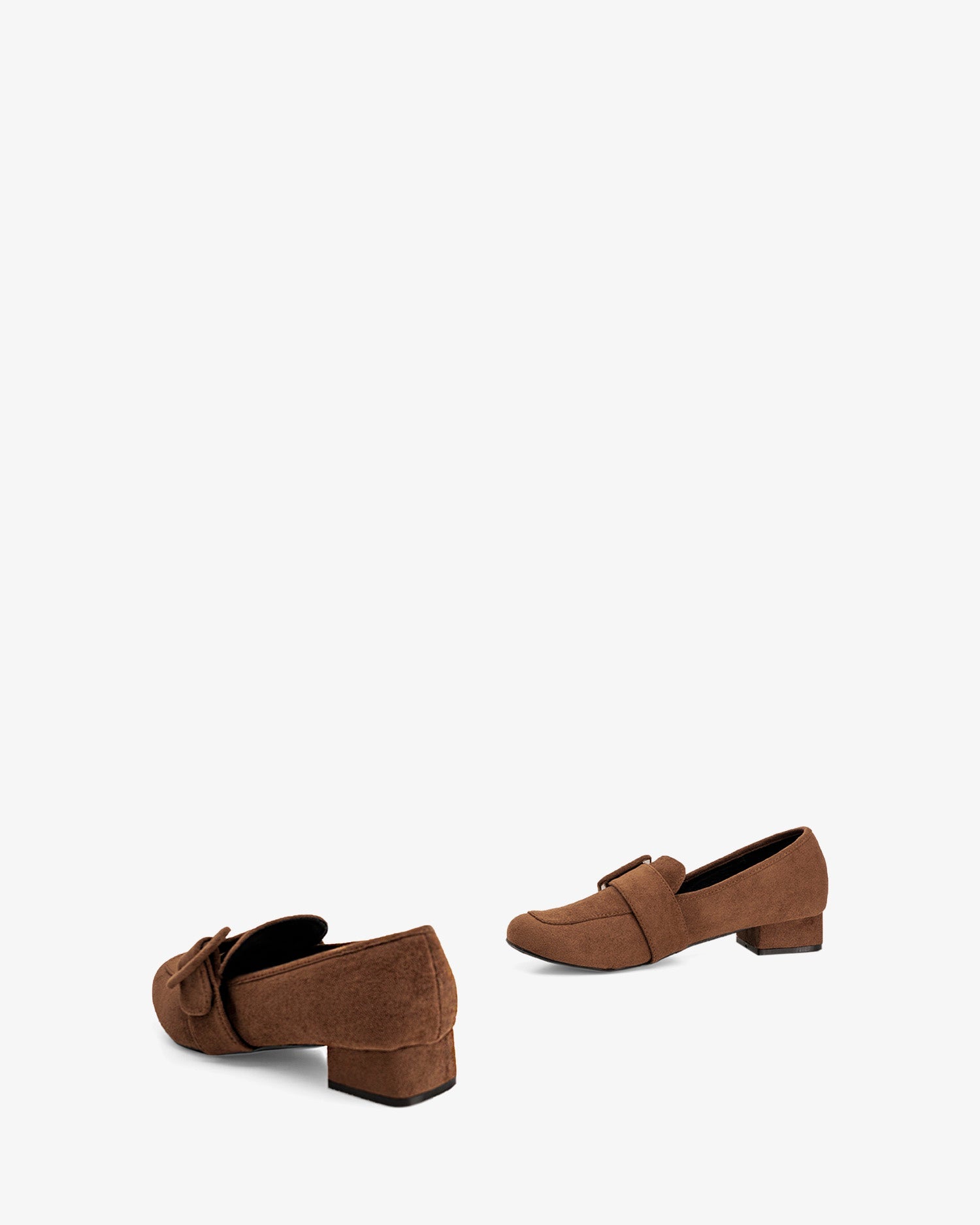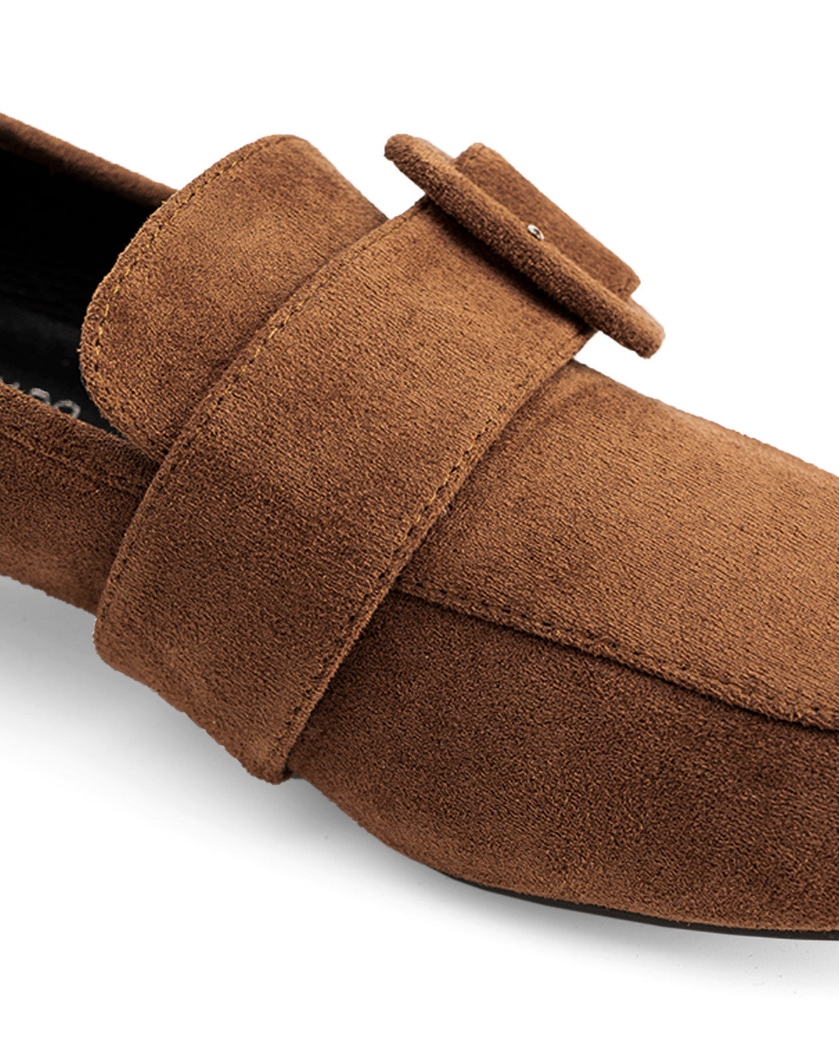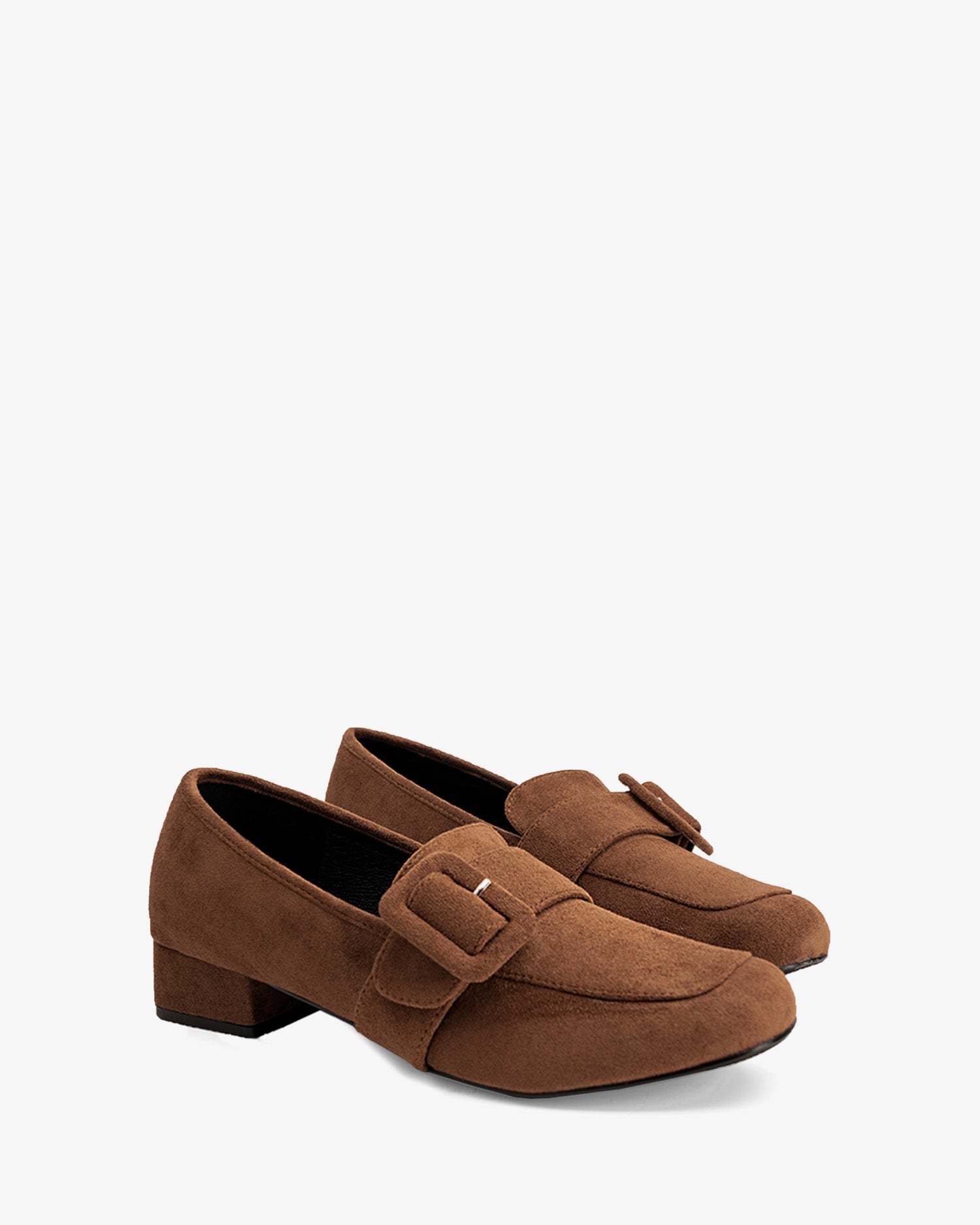 Zapato de estilo mocasín en ante marrón. Detalle de tira ancha al tono con hebilla rectangular forrada al tono en le empeine. Pespuntes de hilo al tono decorativos en la puntera. Acabado en punta cuadrada. Tacón ancho forrado al tono de 3 cm para las tallas pequeñas de la 32 a la 35. Tacón de 3 cm para las tallas grandes de la 42 a la 45.