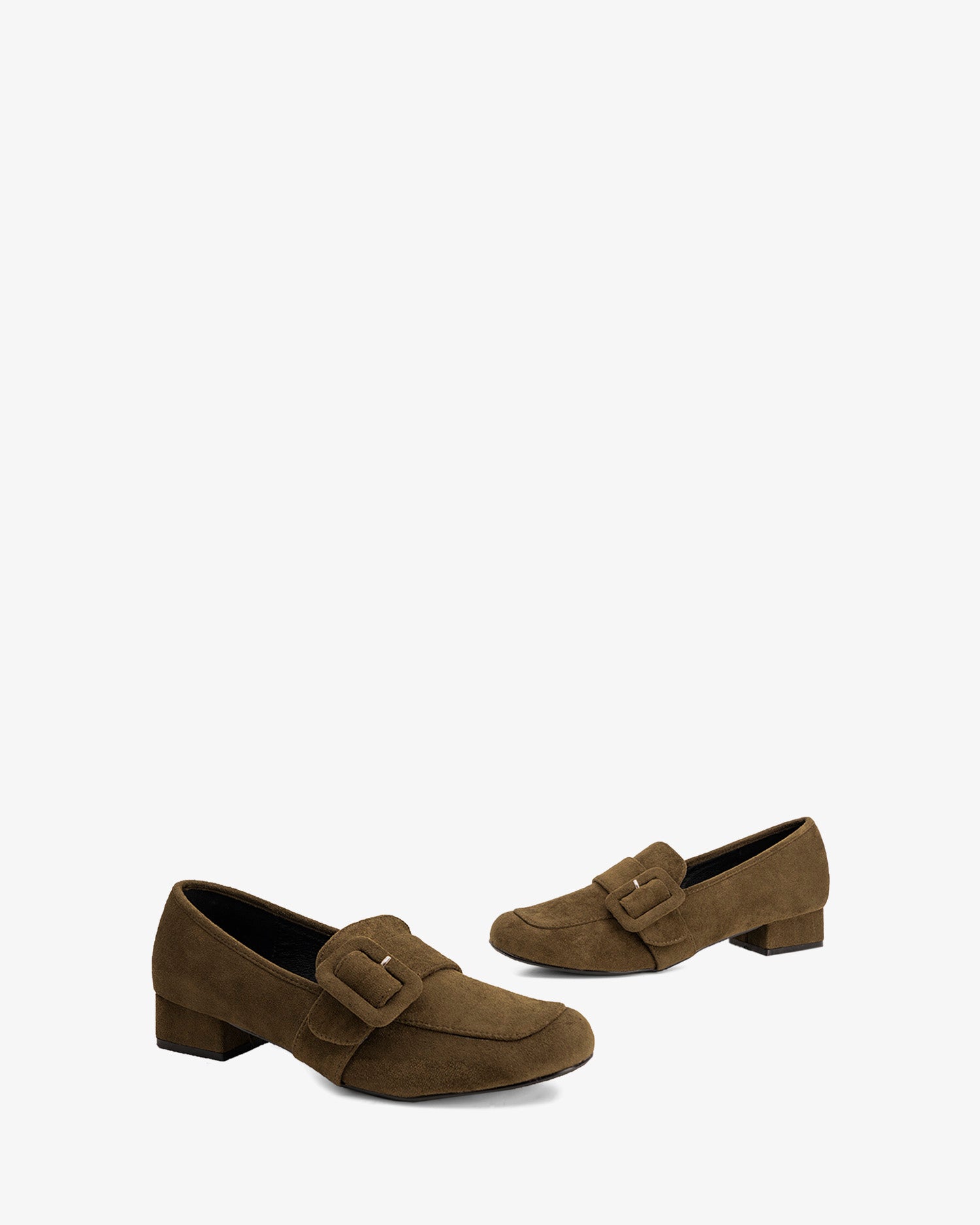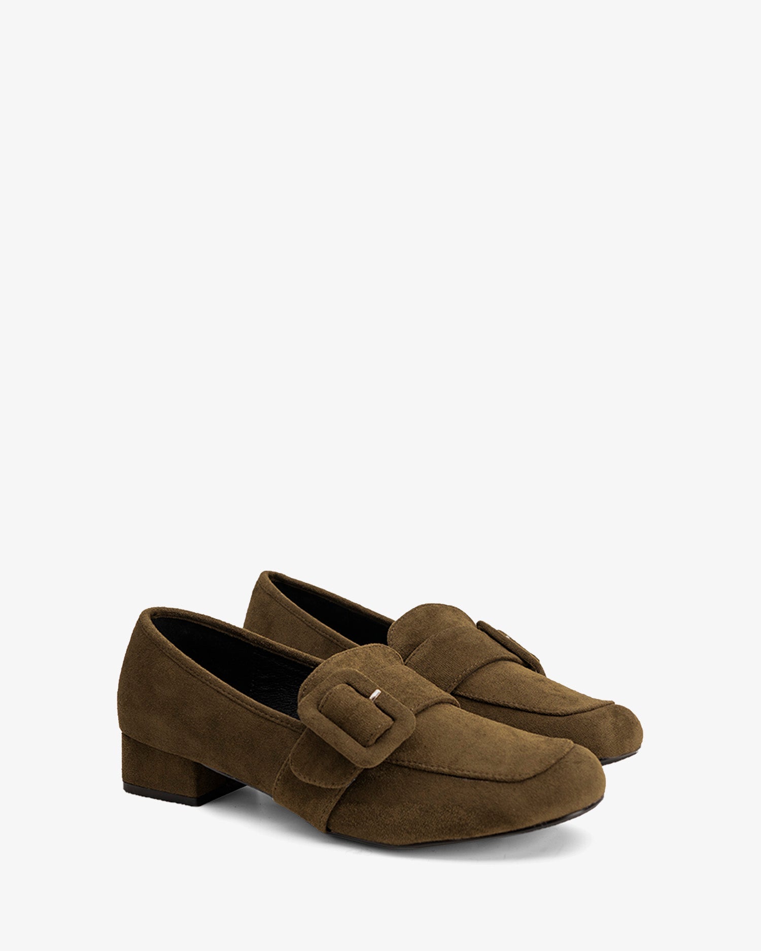 Zapato de estilo mocasín en ante oliva. Detalle de tira ancha al tono con hebilla rectangular forrada al tono en le empeine. Pespuntes de hilo al tono decorativos en la puntera. Acabado en punta cuadrada. Tacón ancho forrado al tono de 3 cm para las tallas pequeñas de la 32 a la 35. Tacón de 3 cm para las tallas grandes de la 42 a la 45.