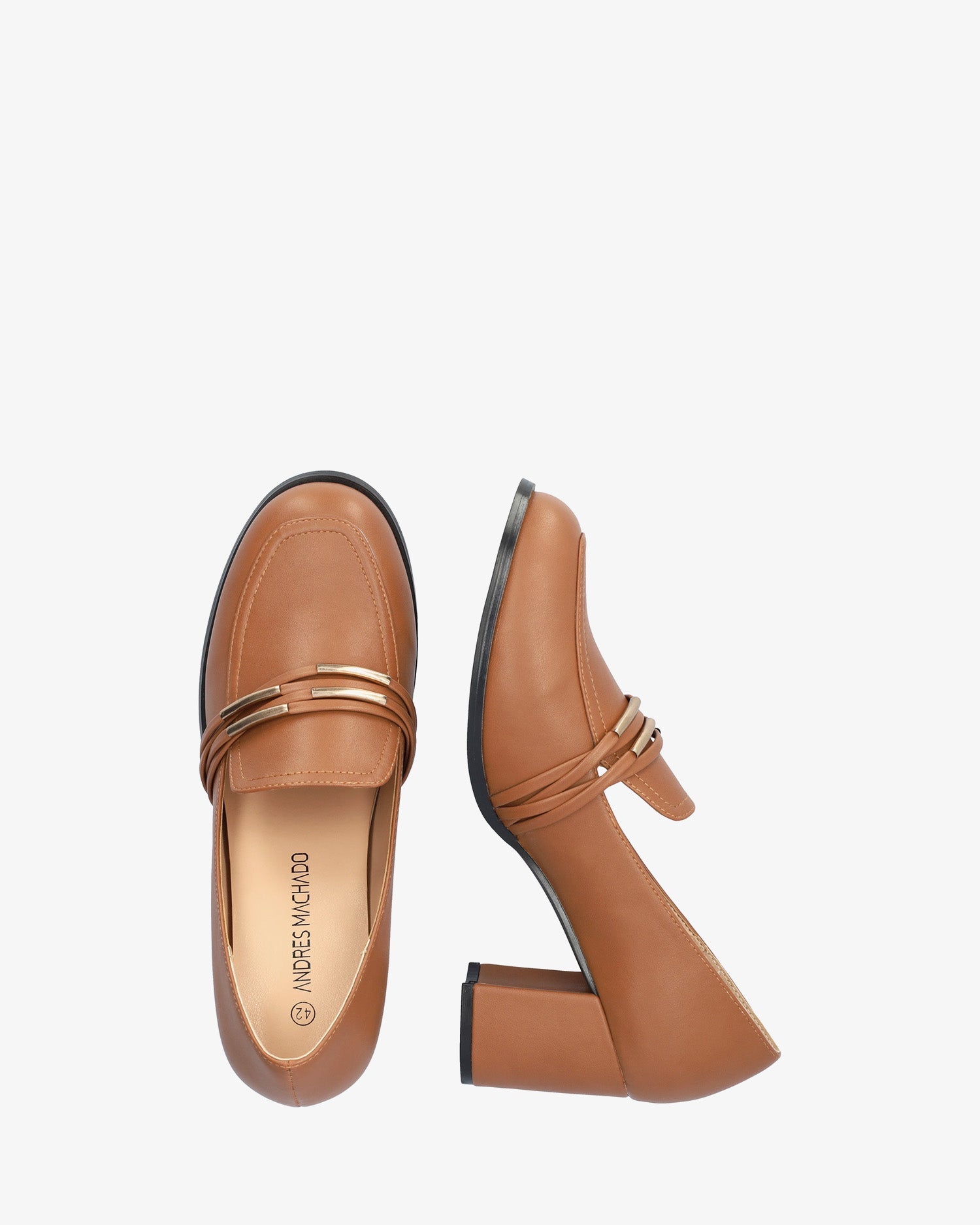 Mocasín en soft de color camel. Detalle de lengüeta y antifaz al tono con finos adornos tubulares dorados sobre el empeine. Acabado en punta redondeada. Tacón ancho forrado al tono de 7 cm para las tallas pequeñas de la 32 a la 35. Tacón de 8 cm para las tallas grandes de la 42 a la 45. Este modelo puede tener una variación de medidas respecto al estandar, te recomendamos que revises los cms de la plantilla o suela interior.