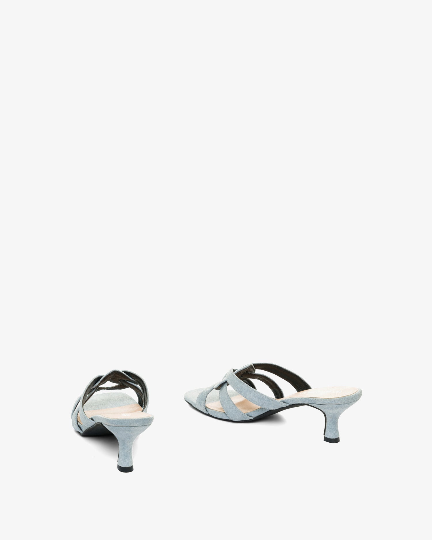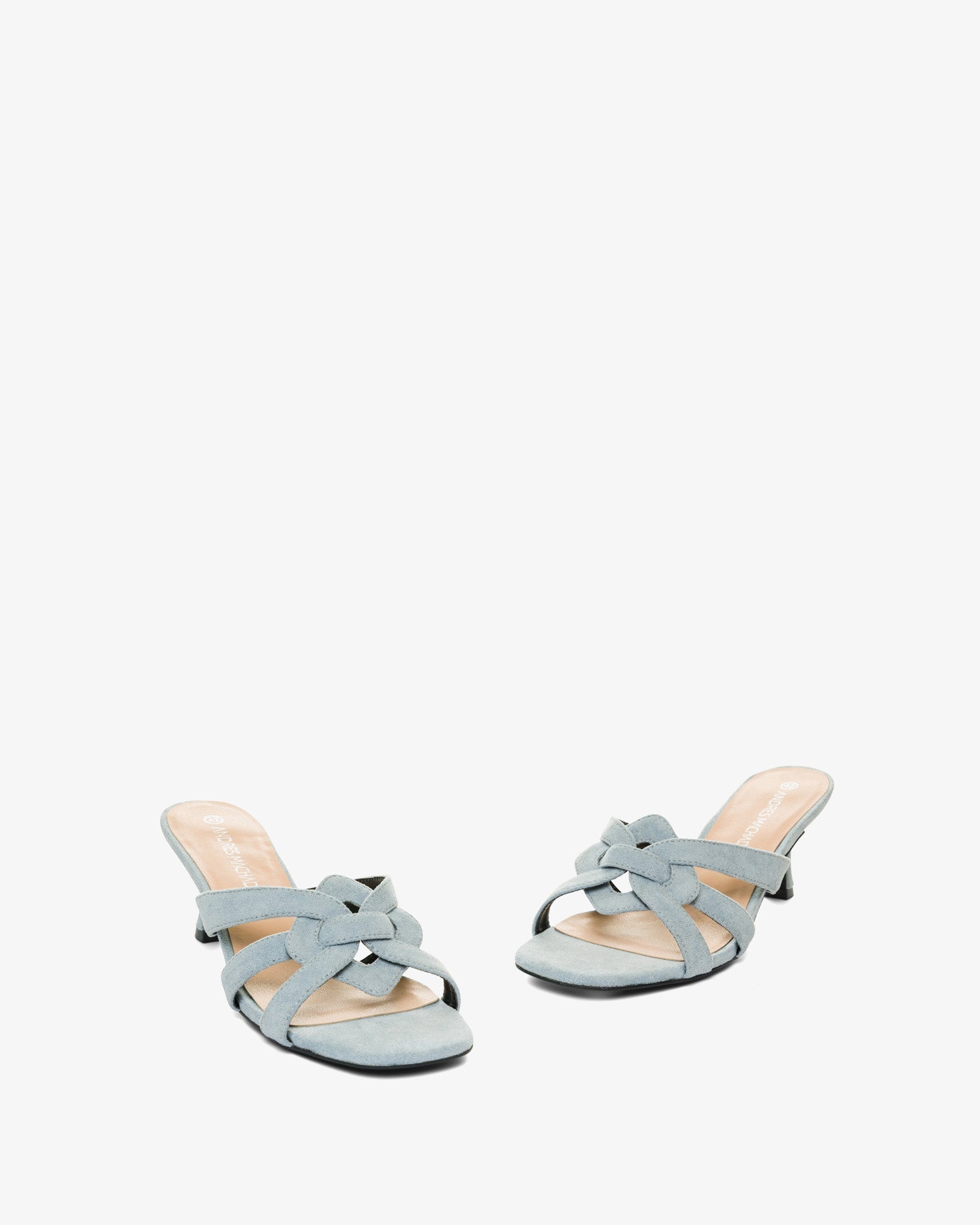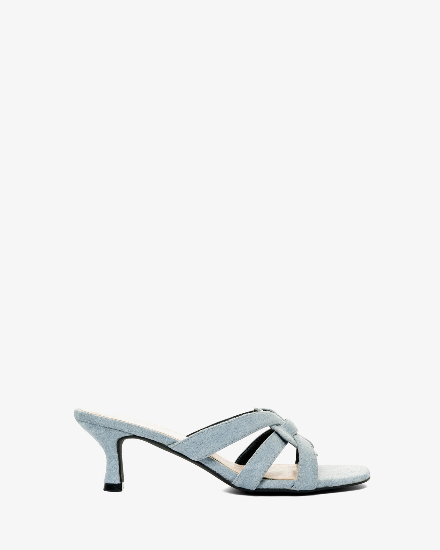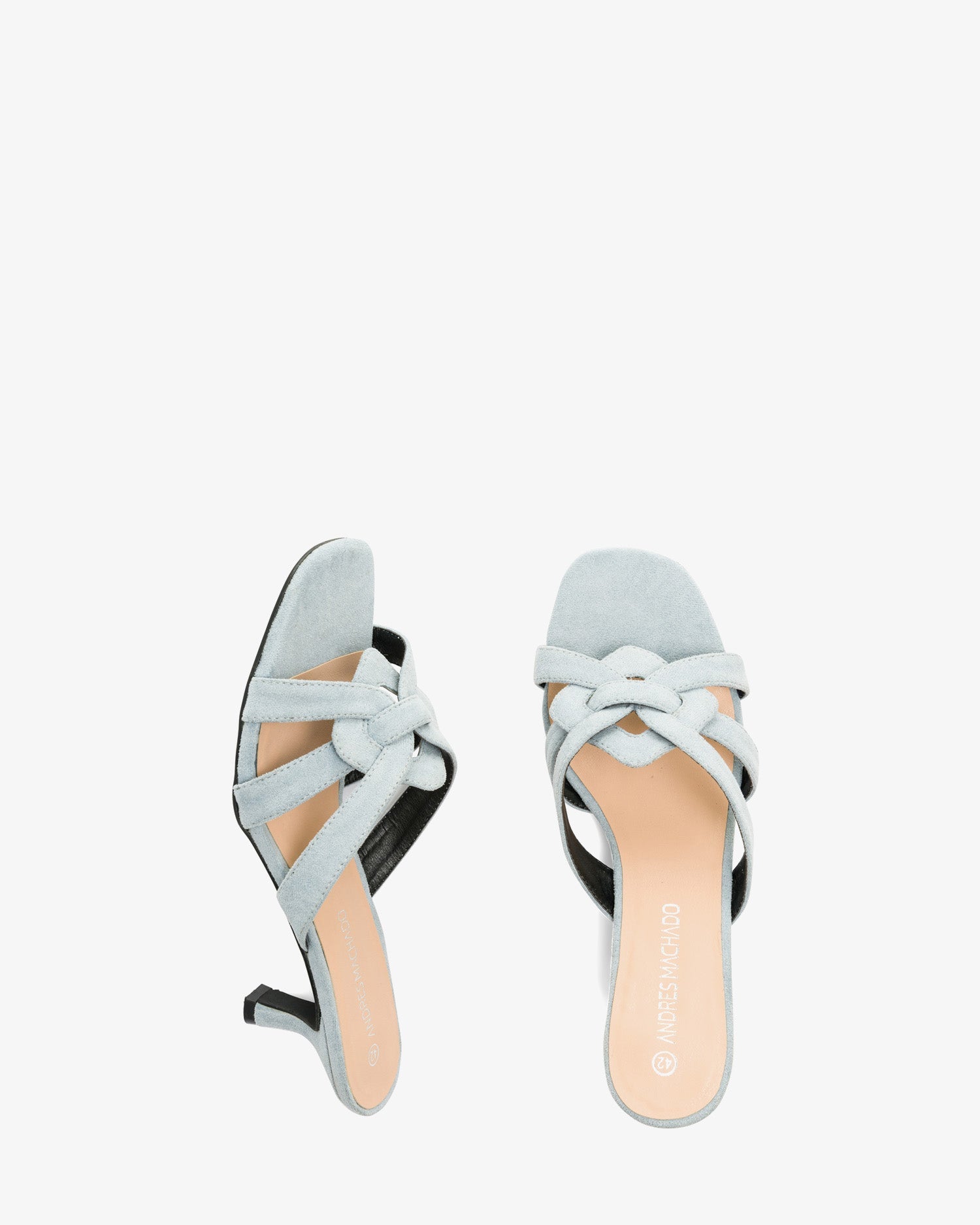 Mule con tacón Kitten Heel en símil ante color Celeste. Detalle de tiras entrelazadas y ovaladas sobre el empeine al tono. Punta abierta y cuadrada. Tacón de 6,5cm para las tallas pequeñas de la 32 a la 35. Tacón de 7cm para las tallas grandes de la 42 a la 45.