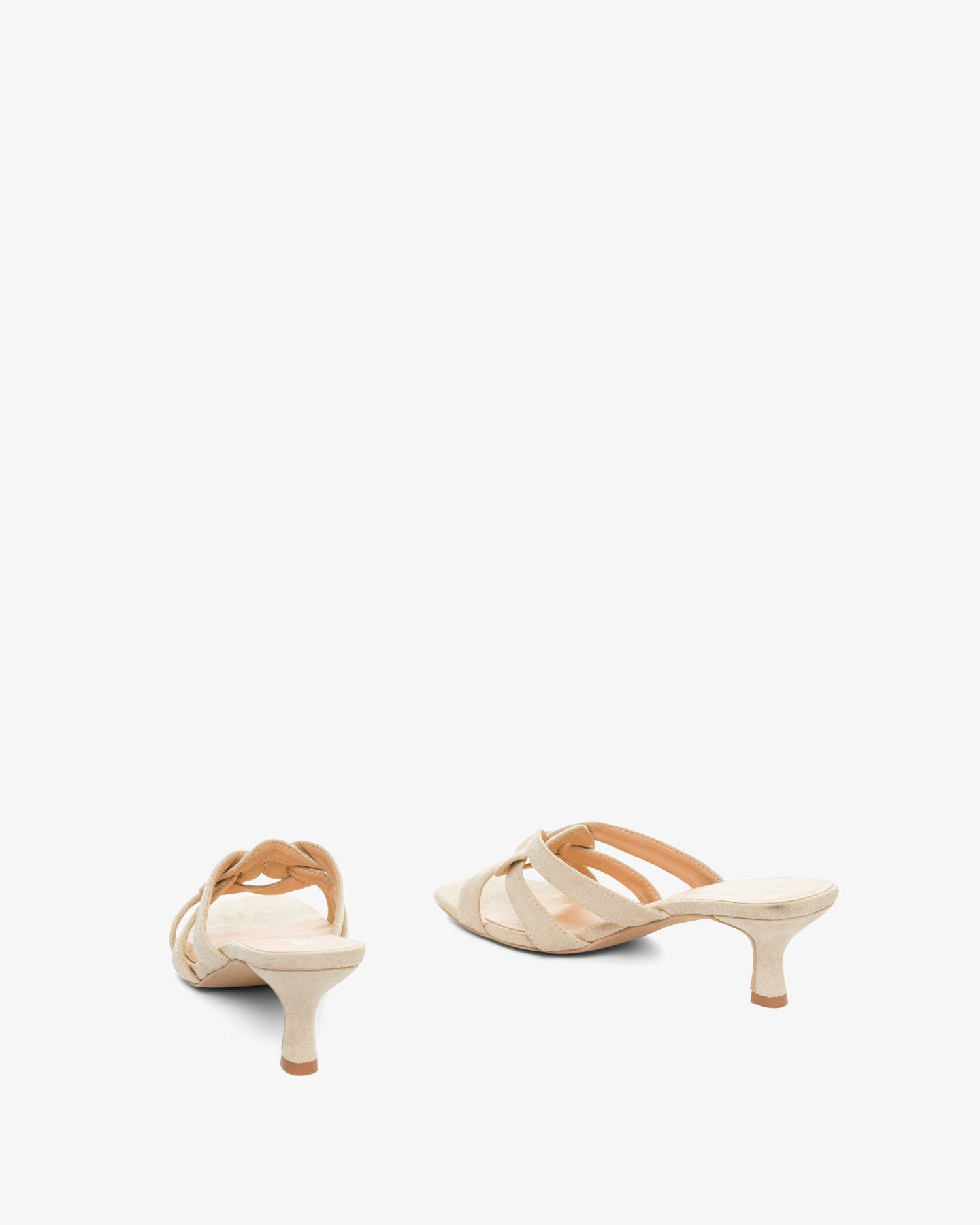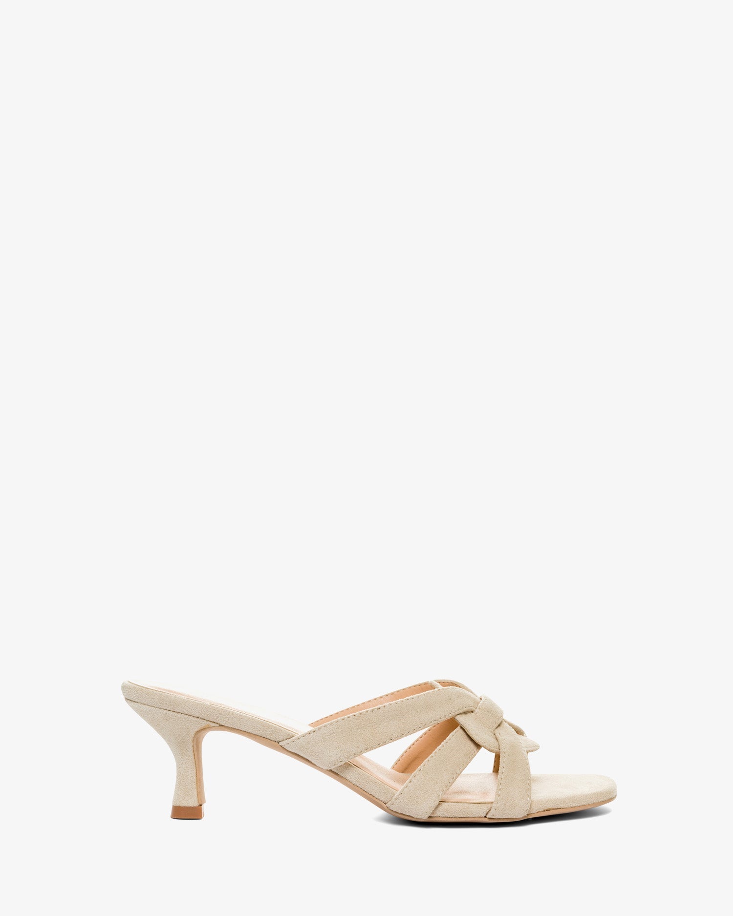 Mule con tacón Kitten Heel en símil ante color Crema. Detalle de tiras entrelazadas y ovaladas sobre el empeine al tono. Punta abierta y cuadrada. Tacón de 6,5cm para las tallas pequeñas de la 32 a la 35. Tacón de 7cm para las tallas grandes de la 42 a la 45.