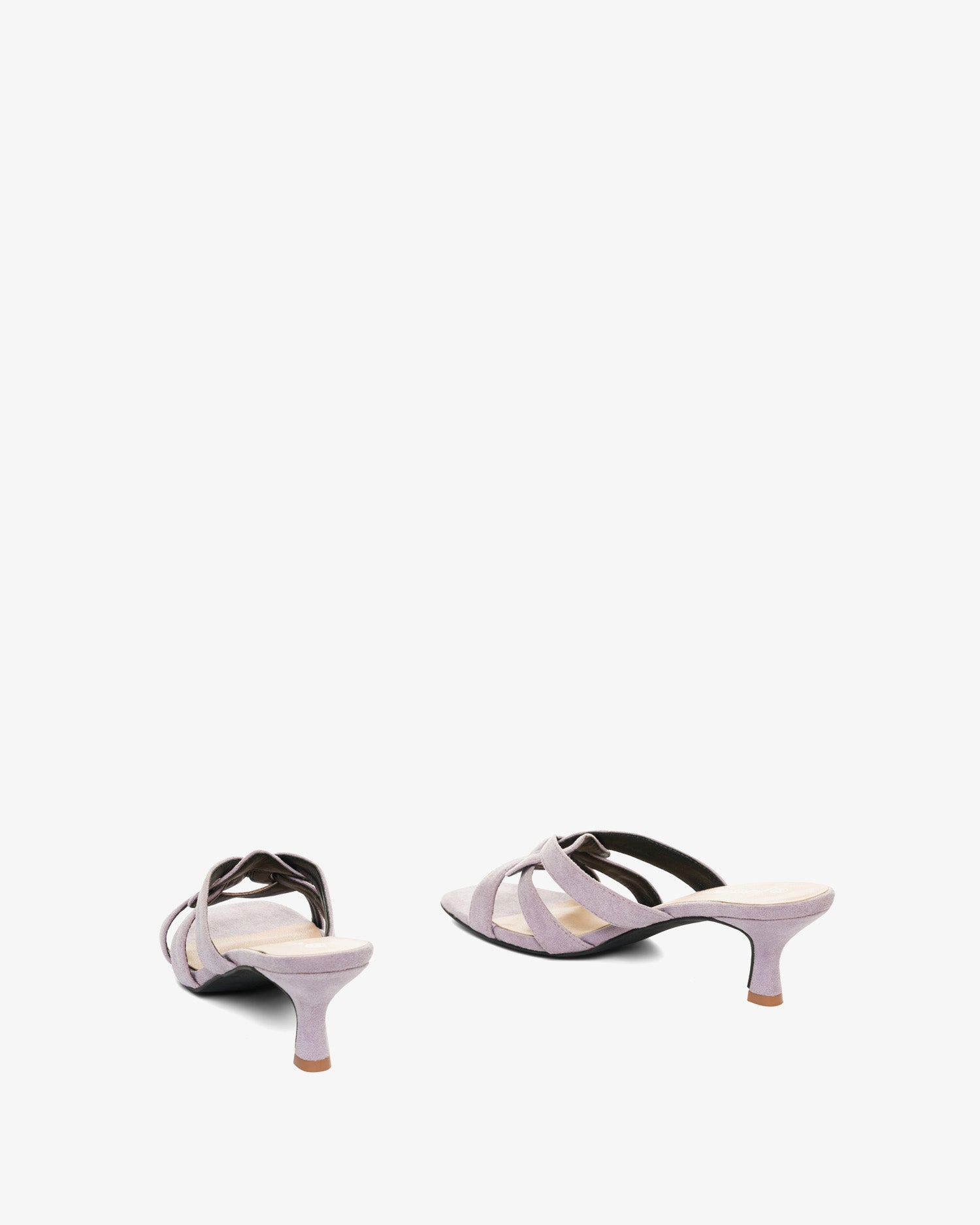 Mule con tacón Kitten Heel en símil ante color Malva. Detalle de tiras entrelazadas y ovaladas sobre el empeine al tono. Punta abierta y cuadrada. Tacón de 6,5cm para las tallas pequeñas de la 32 a la 35. Tacón de 7cm para las tallas grandes de la 42 a la 45.