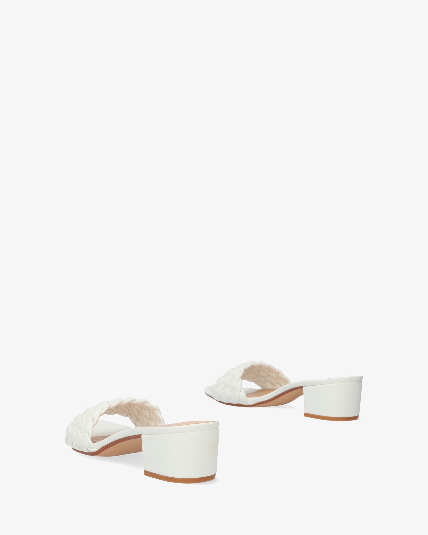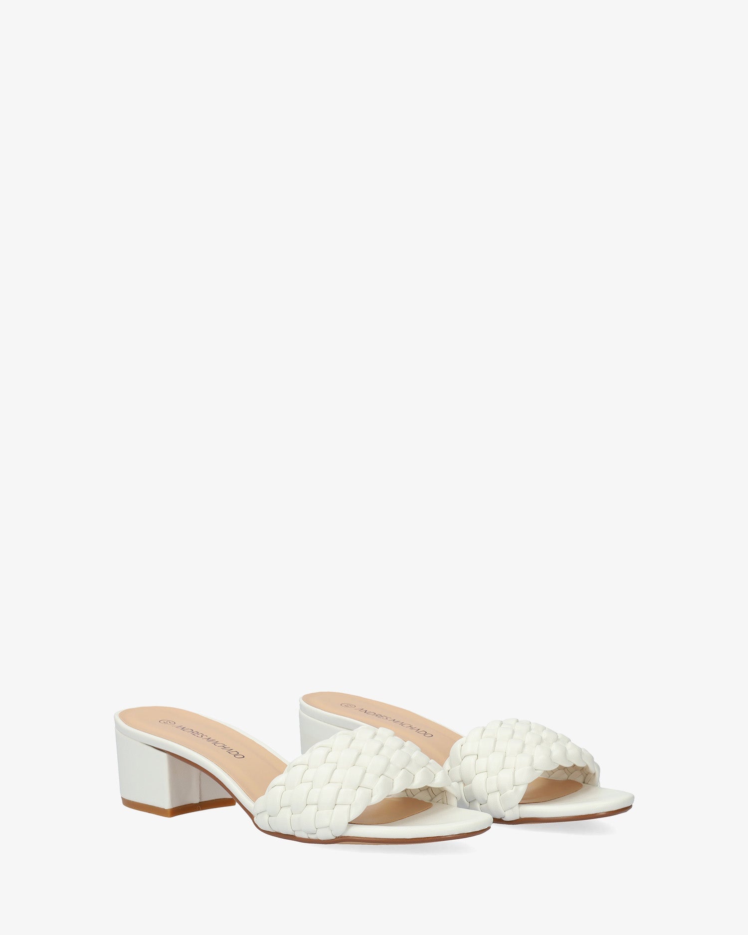 Mule en soft color Blanco con tacón cuadrado. Diseño destalonado con tira ancha trenzada en la parte delantera al tono. Puntera abierta y redondeada. Tacón de 5 cm para las tallas pequeñas de la 32 a la 35. Tacón de 5,5 cm para las tallas grandes de la 42 a la 45.