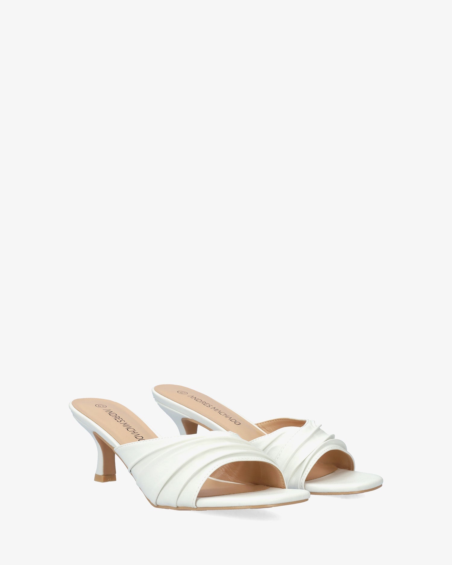 Mule en soft color Blanco con tacón Kitten. Diseño destalonado con tira ancha drapeada en la parte delantera. Puntera abierta y cuadrada. Tacón de 6,5 cm para las tallas pequeñas de la 32 a la 35. Tacón de 7 cm para las tallas grandes de la 42 a la 45.