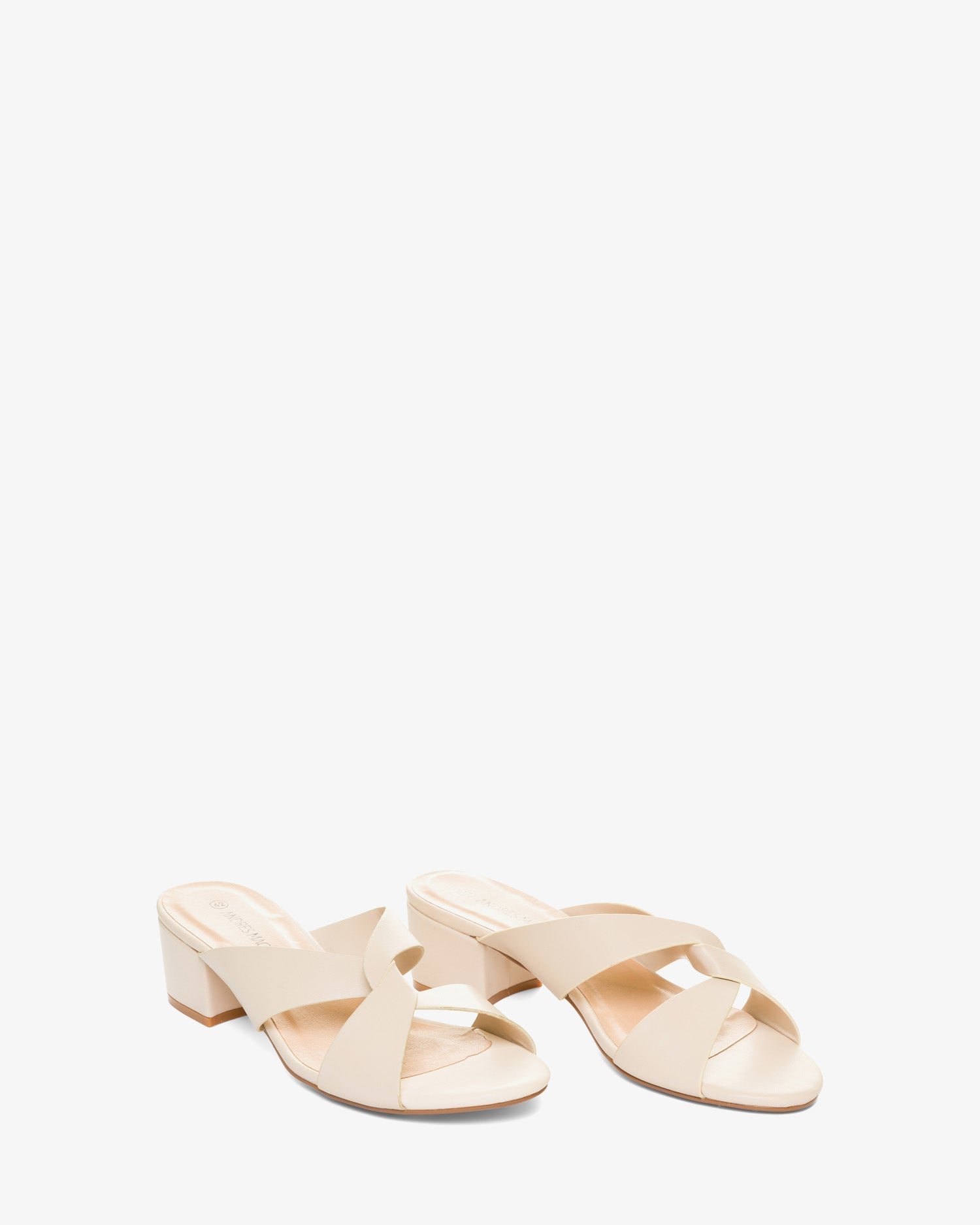 Mule con tacón ancho en soft color Crema. Detalle de tiras entrelazadas sobre el empeine al tono. Punta abierta y redondeada. Tacón de 5 cm para las tallas pequeñas de la 32 a la 35. Tacón de 5,5 cm para las tallas grandes de la 42 a la 45.