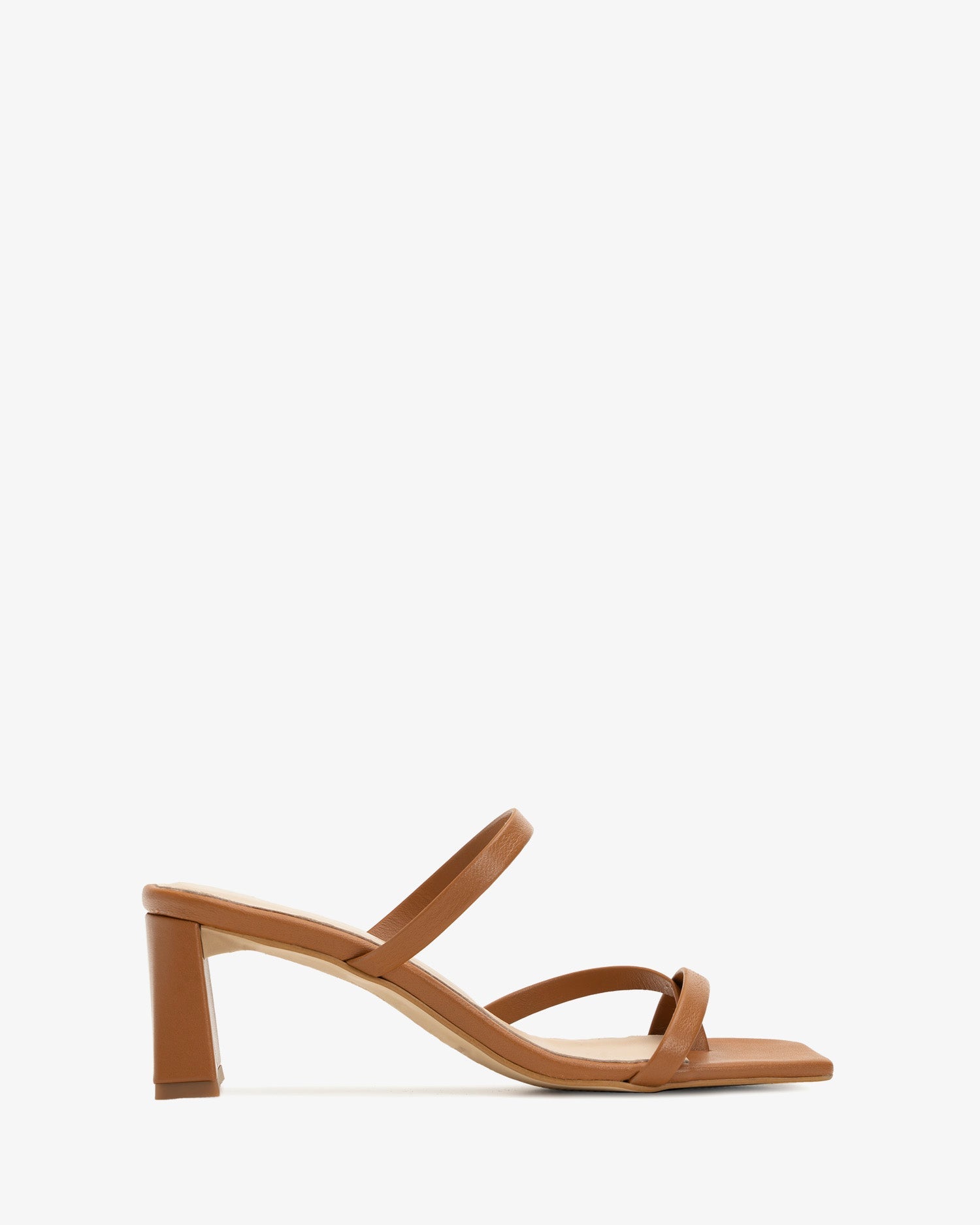 Mule en piel lisa de color Cuero. Diseño de 2 finas tiras al tono cruzadas en el empeine con posición para el dedo y fina tira al tono en el empeine. Puntera abierta y cuadrada. Tacón rectangular en piel de color cuero. Tallas disponibles de la 32 a la 45. Tacón de 5,5 cm para las tallas de la 32 a la 37. Tacón de 6 cm para las tallas de la 38 a la 45. Fabricación española