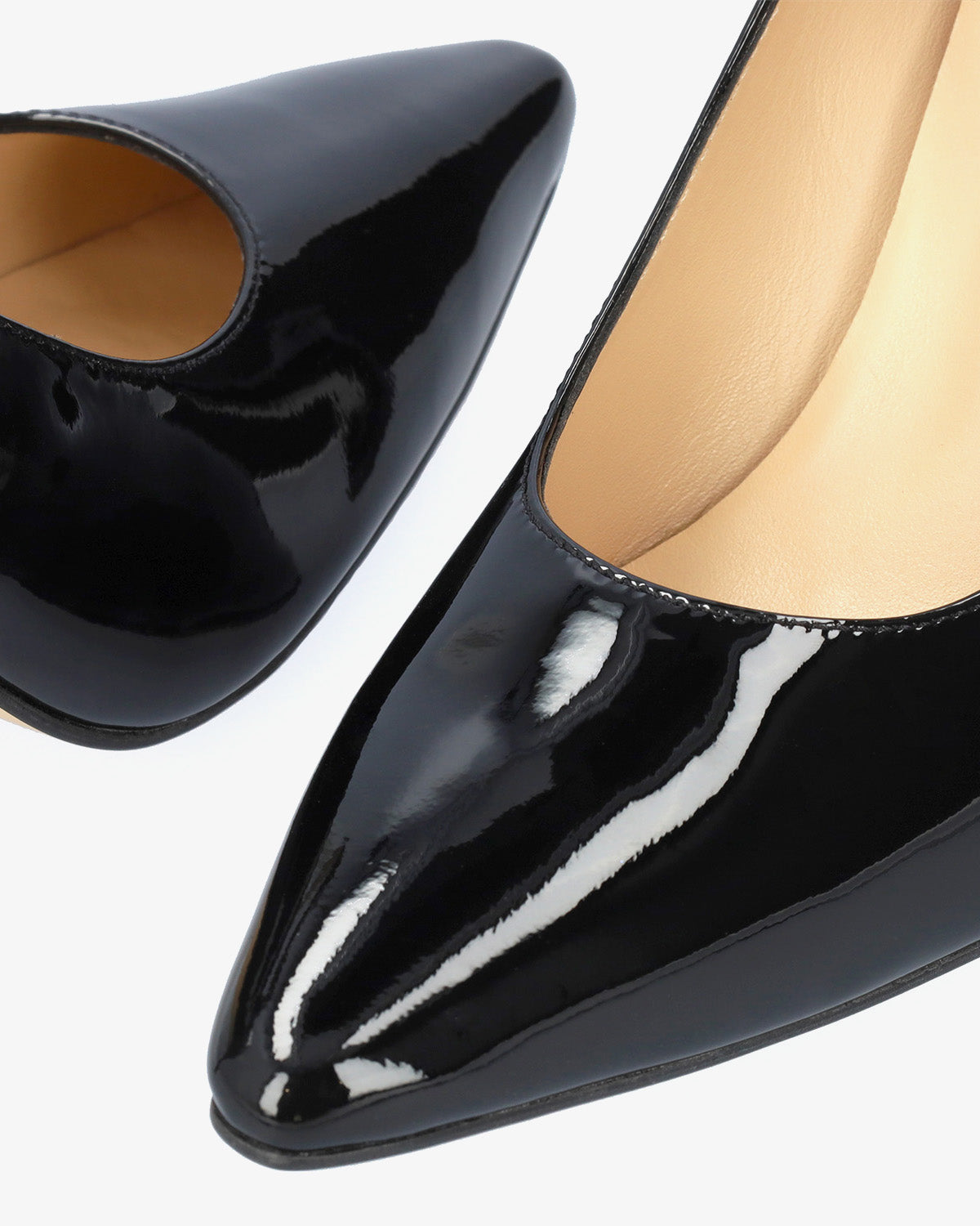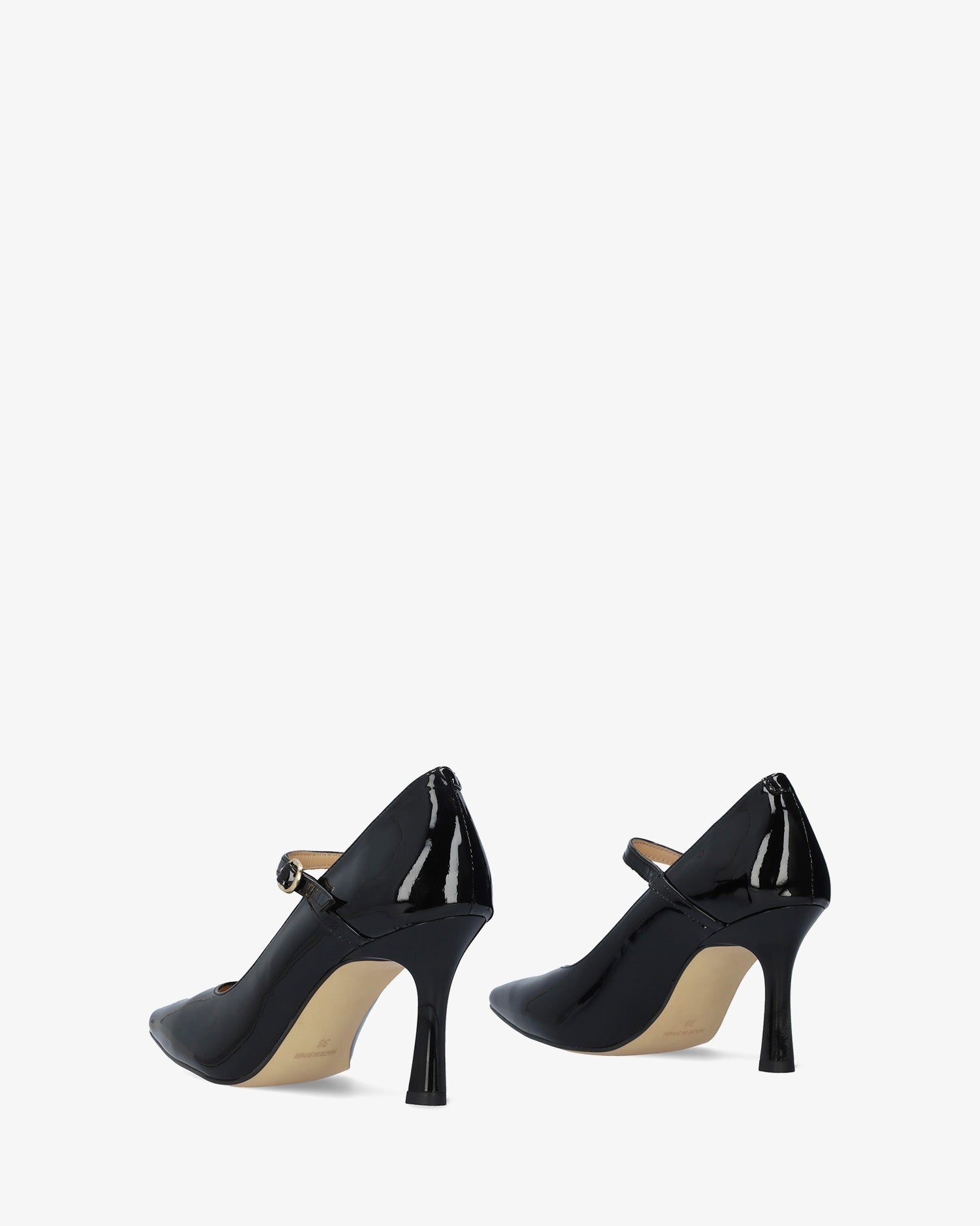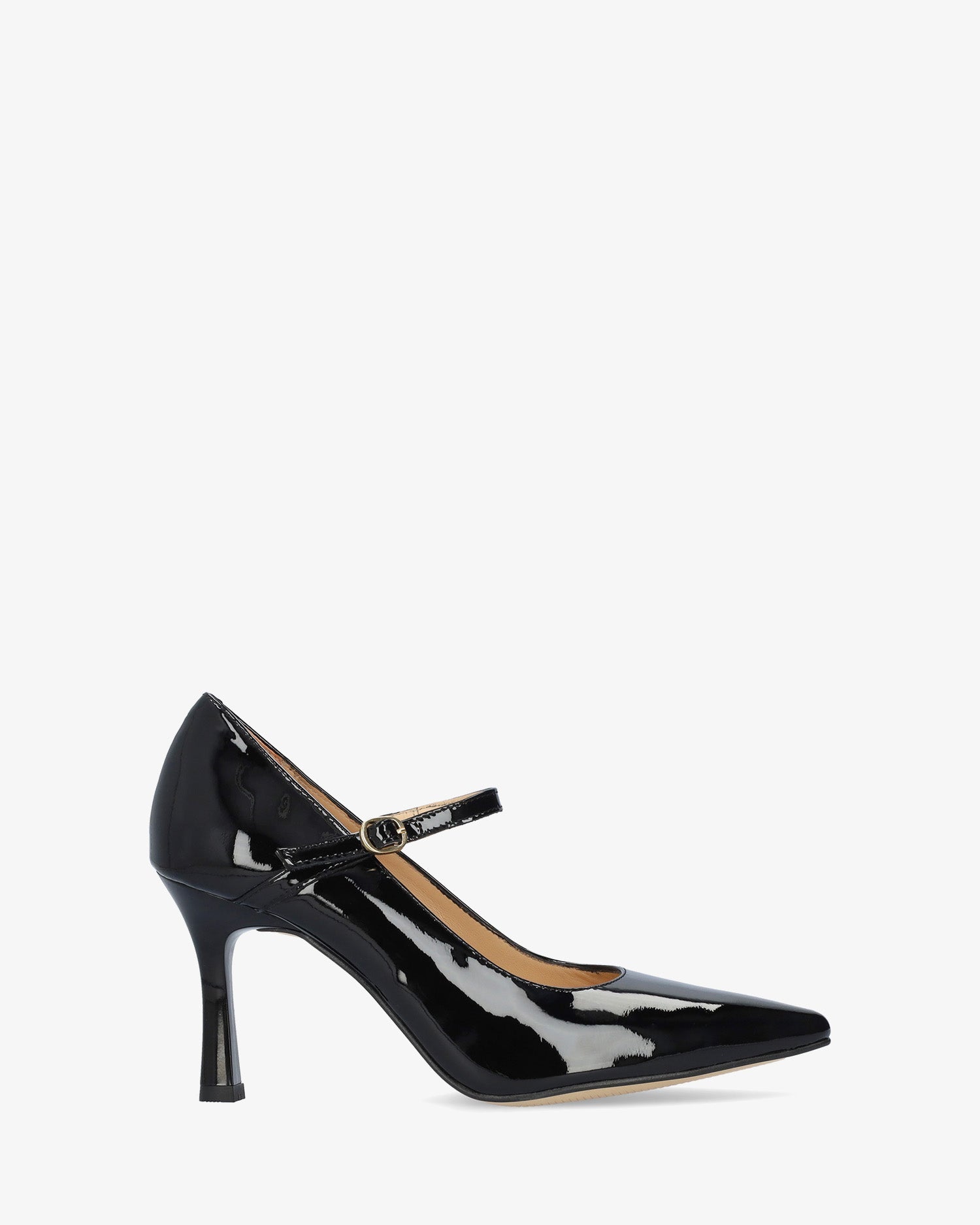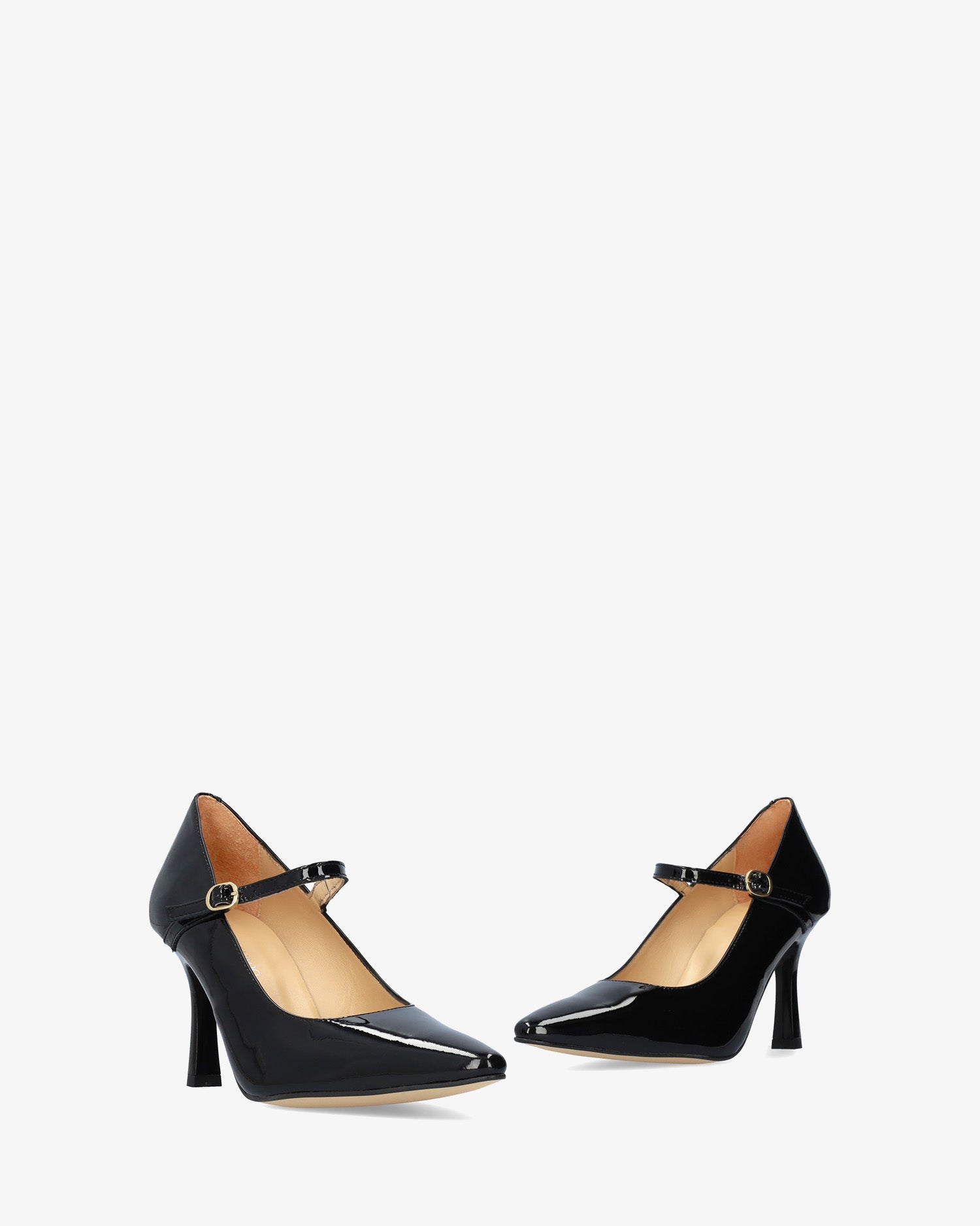 Zapato de salón en charol negro con forro de piel y punta fina. Incorpora una tira en el empeine con hebilla metálica lateral. Tacón fino de color negro tiene una altura de 8,5 cm para tallas pequeñas de la 32 a la 35 y 9,5 cm para las tallas grandes de la 42 a la 45. Fabricado en España.