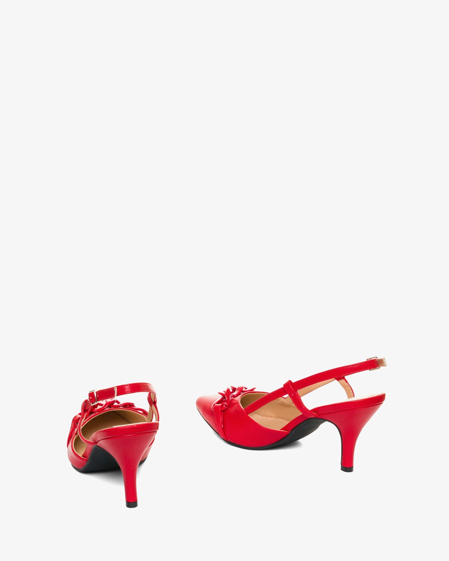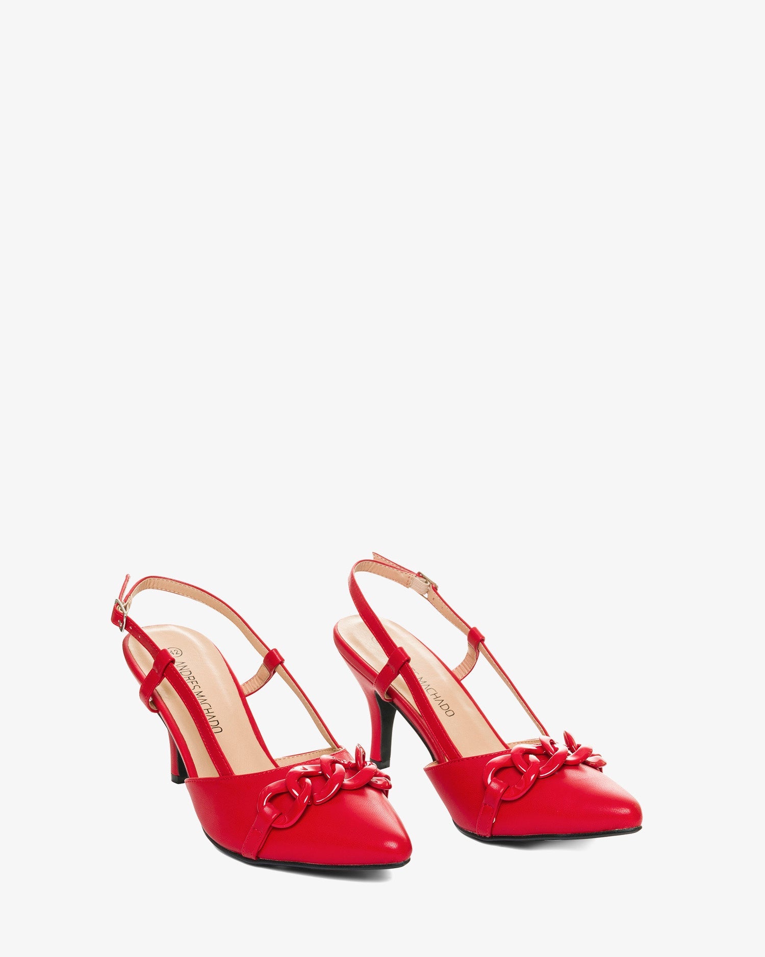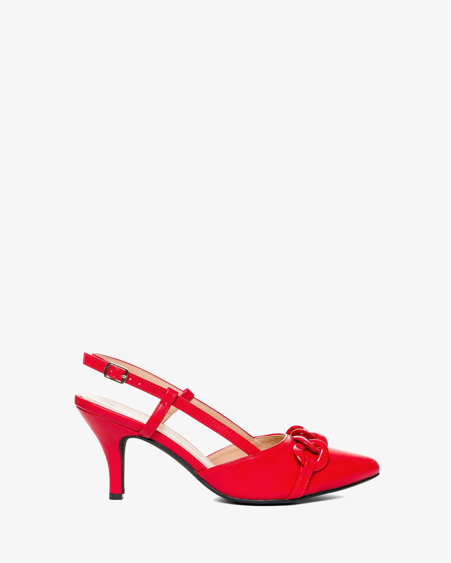Salón con tacón medio en soft de color Rojo. Acabado en punta fina cerrada y detalle con cadena de eslabones al tono en la parte delantera. Diseño destalonado con tiras laterales que envuelven el pie. Cierre al tono con hebilla metálica. Tacón de 7 cm para las tallas pequeñas de la 32 a la 35. Tacón de 9 cm para las tallas grandes de la 42 a la 45.