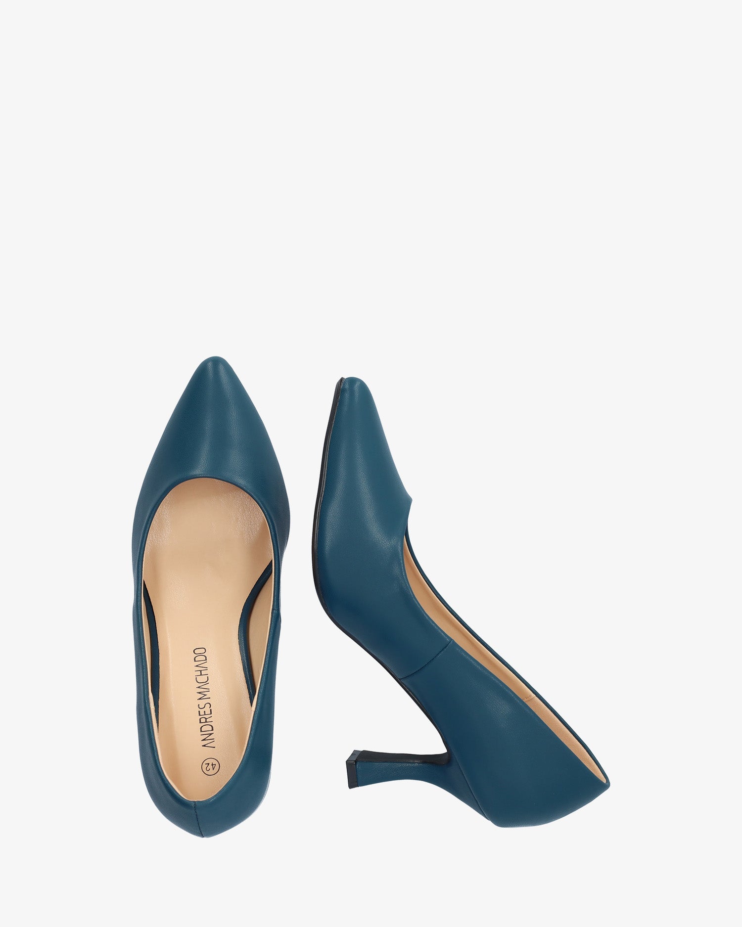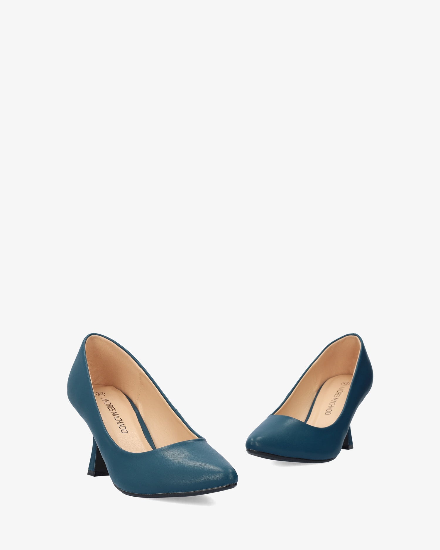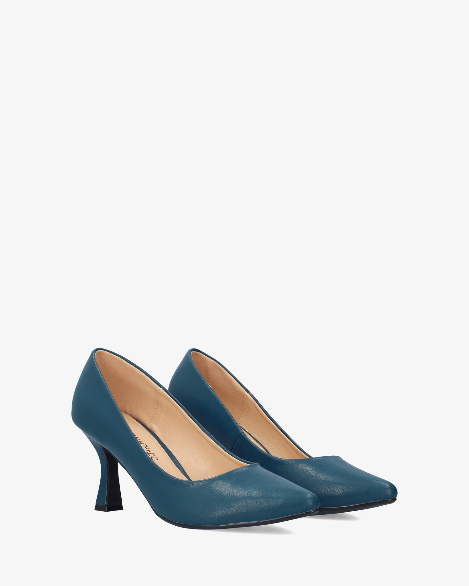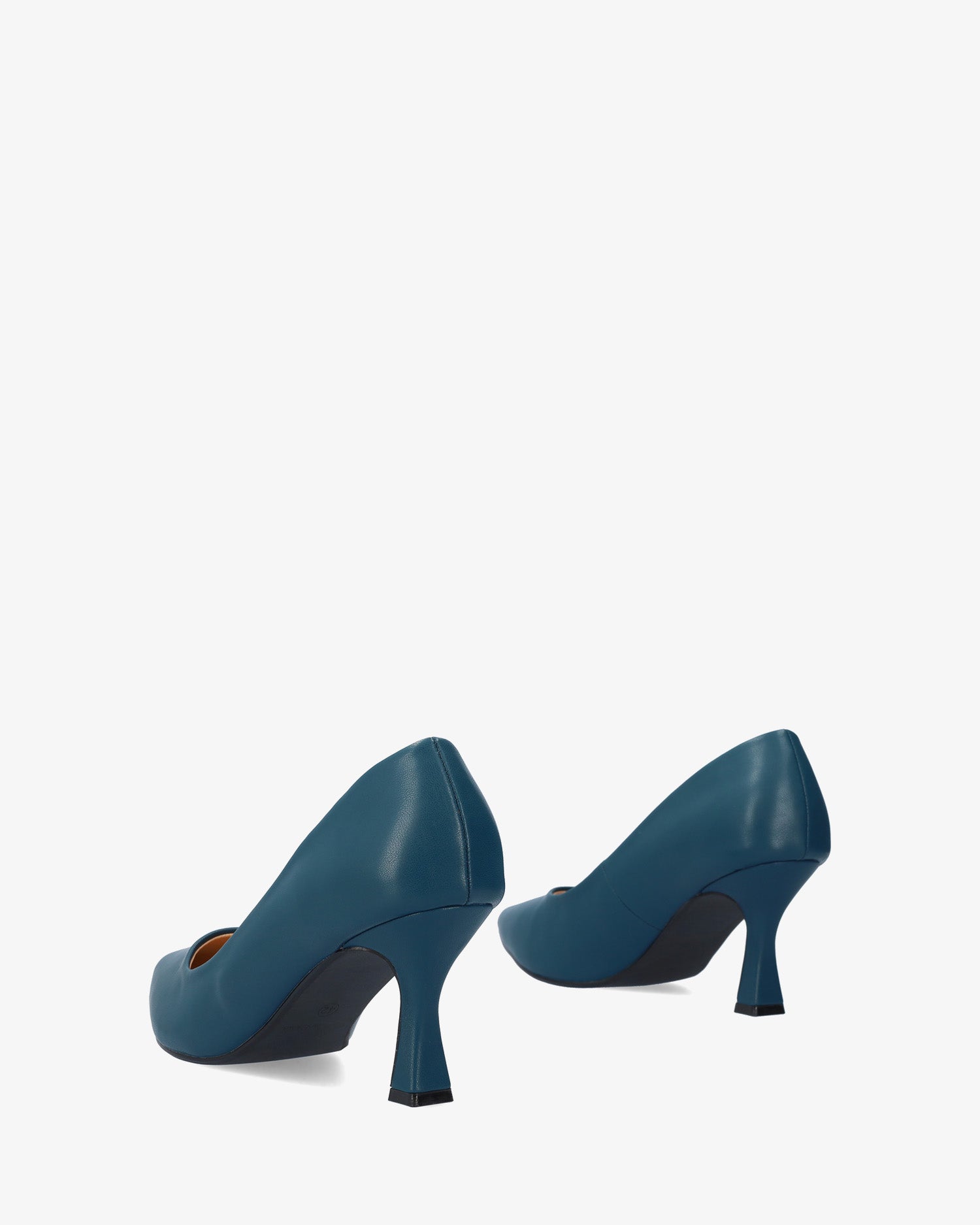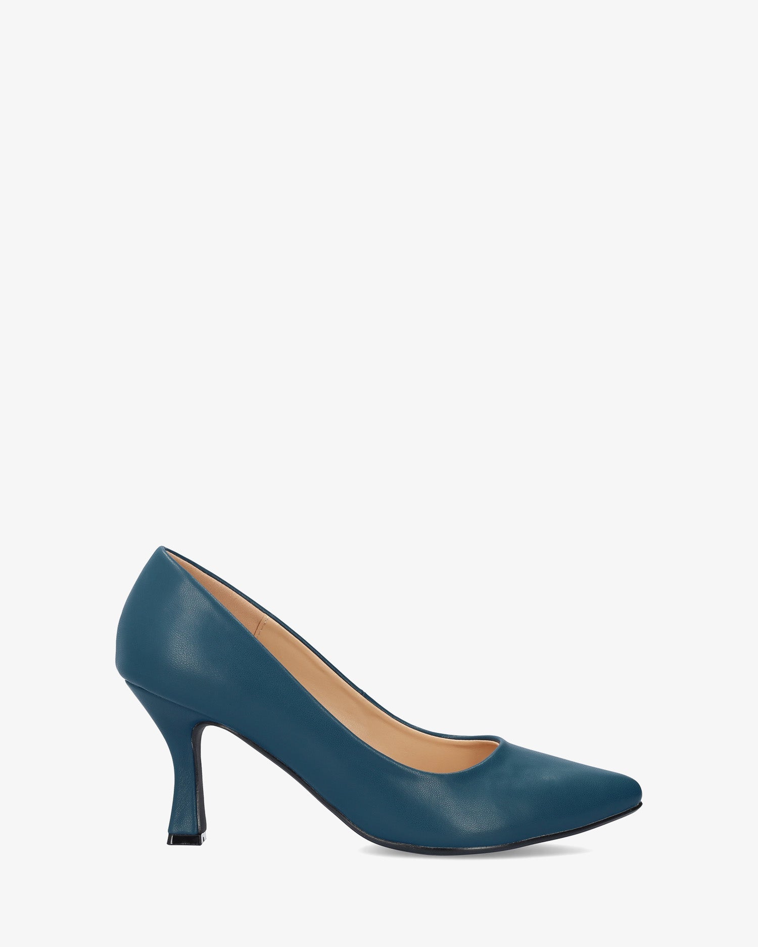 Salón en soft de color Azul. Acabado en punta fina. Tacón Kitten Heel al tono de 7 cm de alto para las tallas pequeñas de la 32 a la 35. Tacón de 8,5 cm de alto para las tallas grandes de la 42 a la 45.