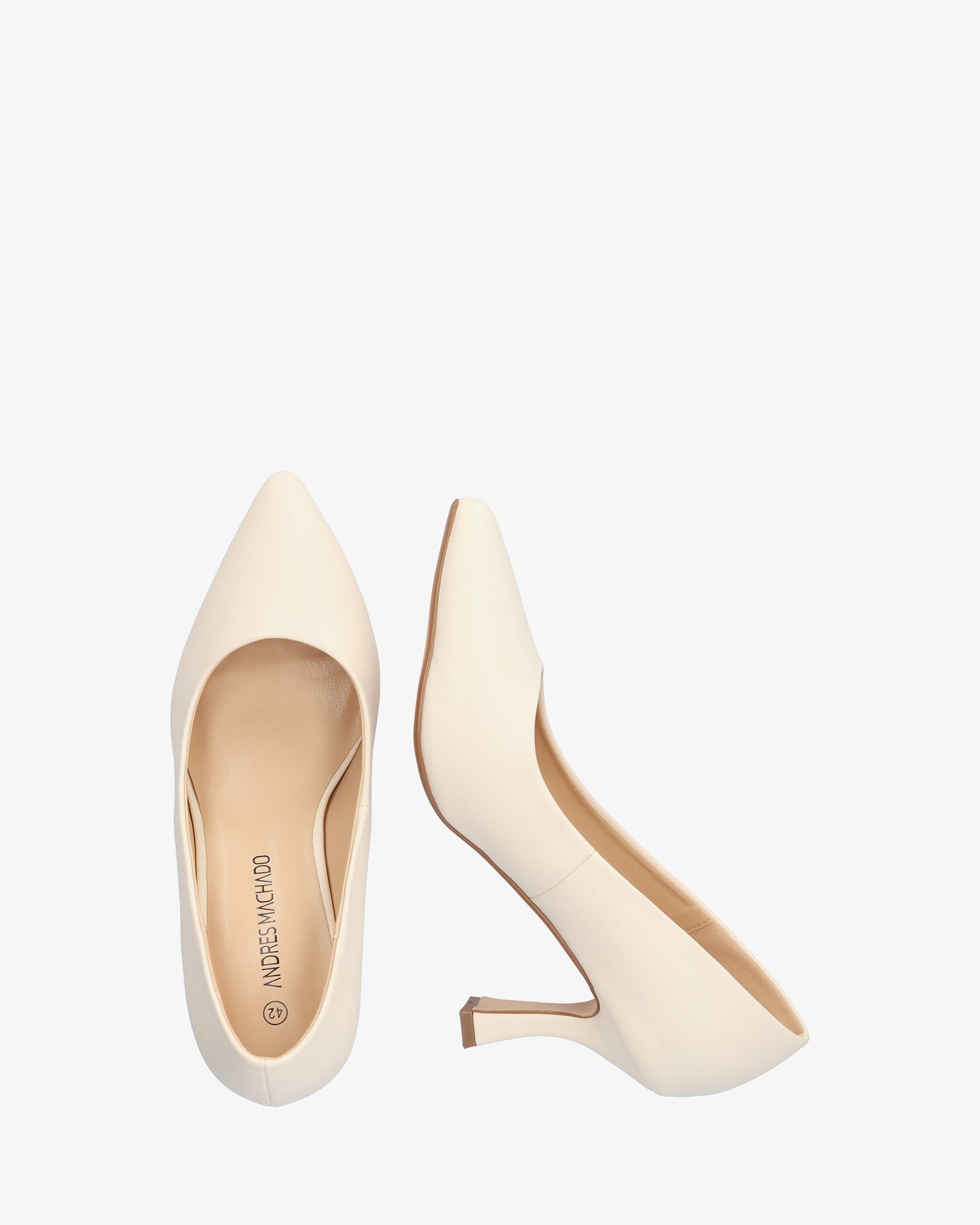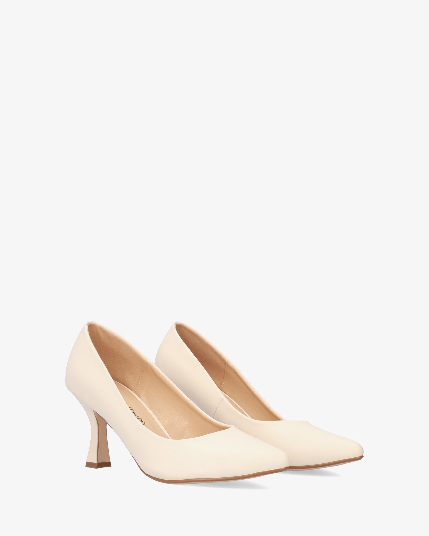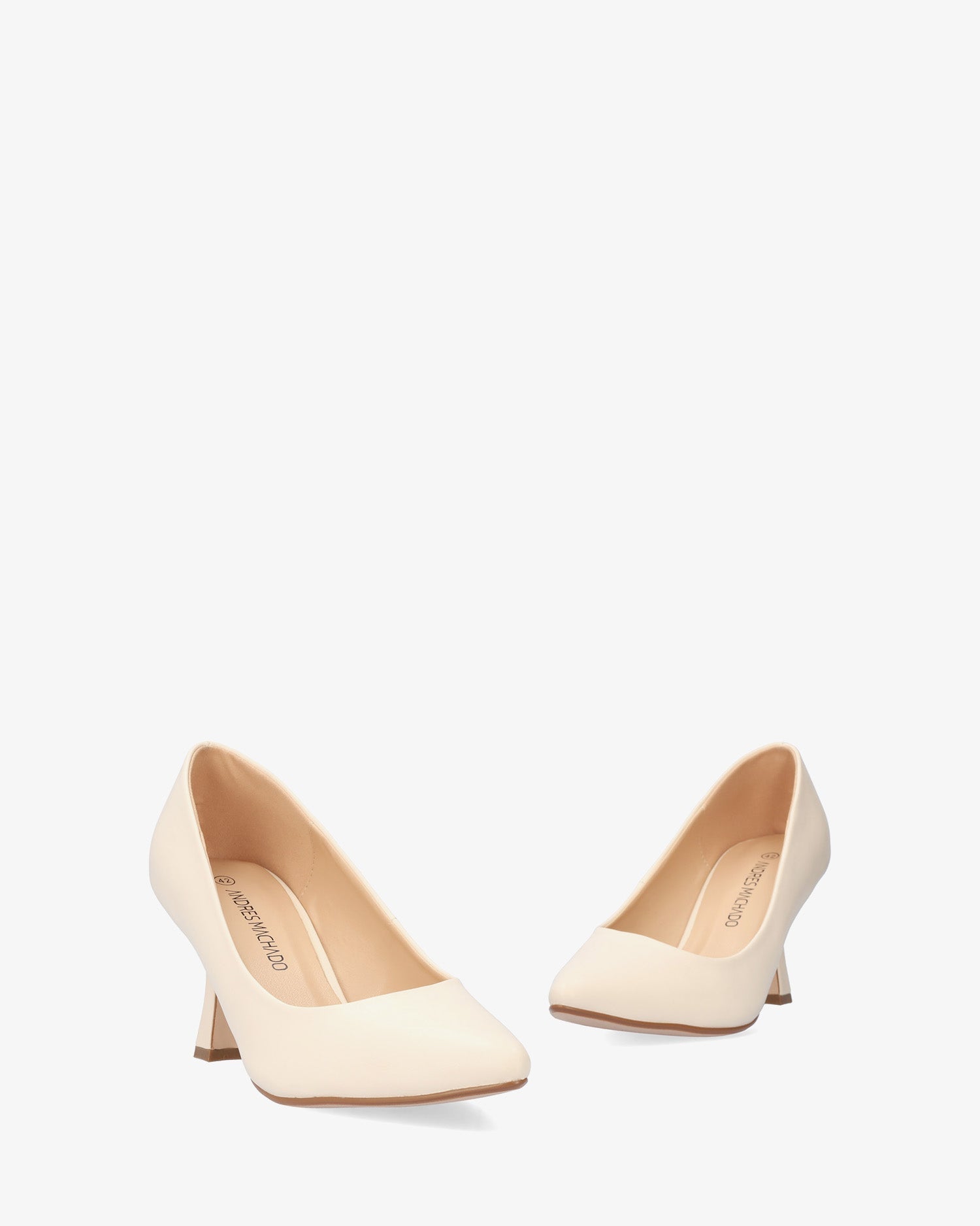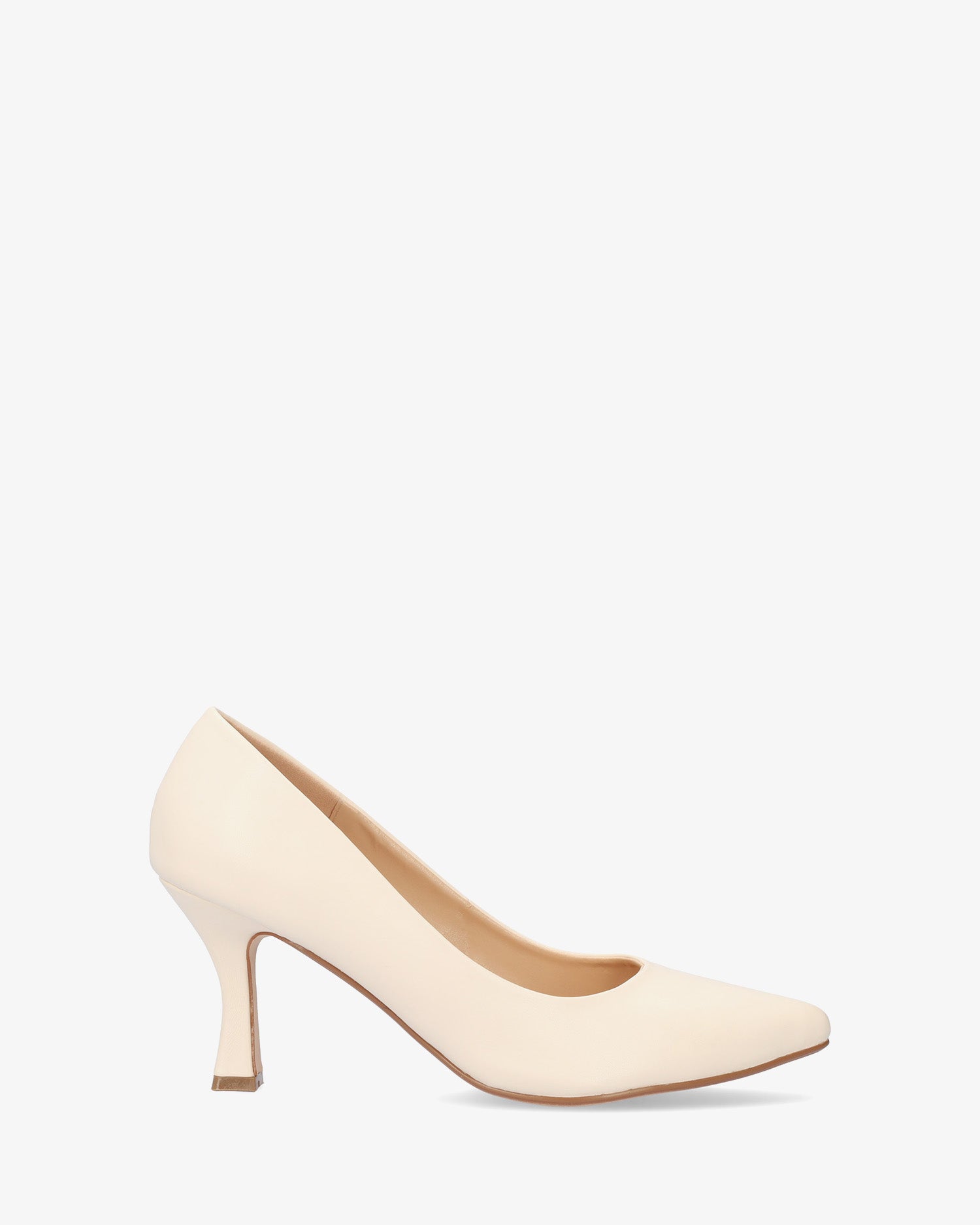 Salón en soft de color Crema. Acabado en punta fina. Tacón Kitten Heel al tono de 7 cm de alto para las tallas pequeñas de la 32 a la 35. Tacón de 8,5 cm de alto para las tallas grandes de la 42 a la 45.