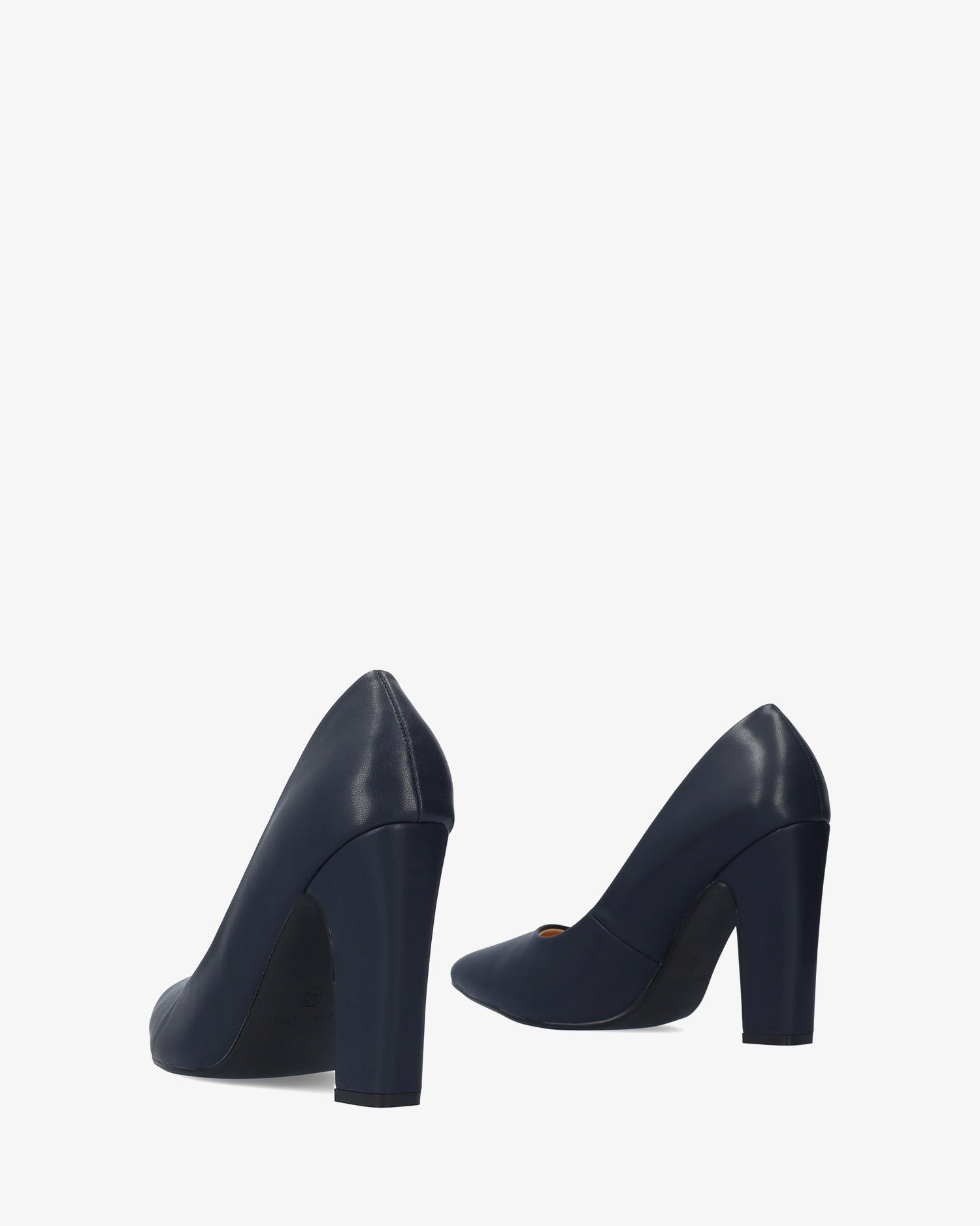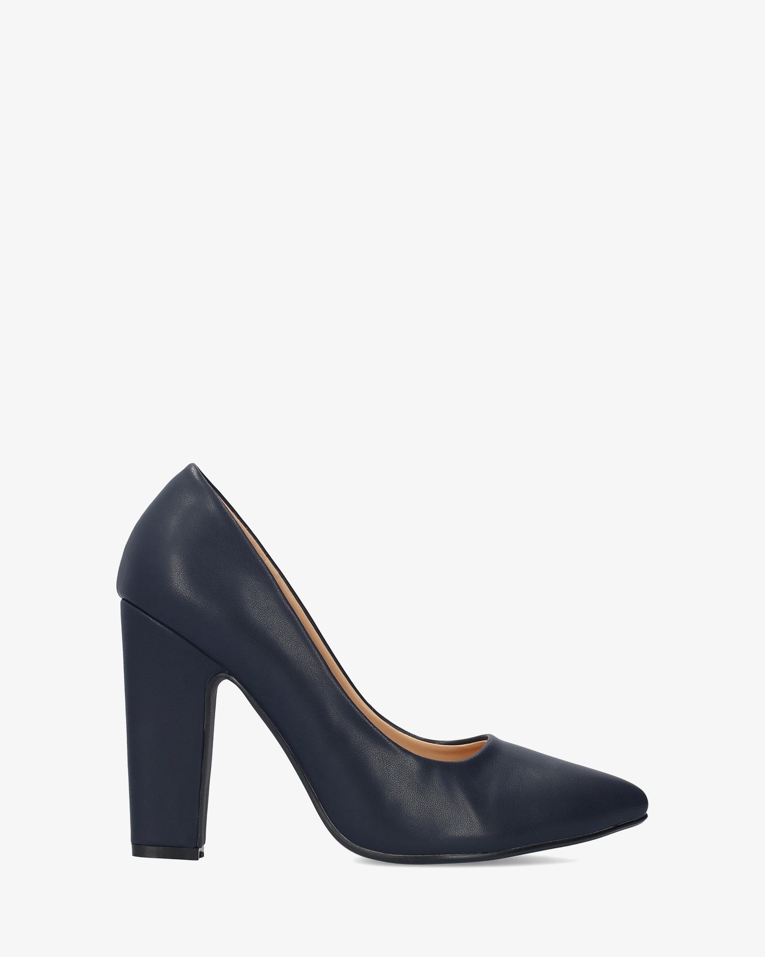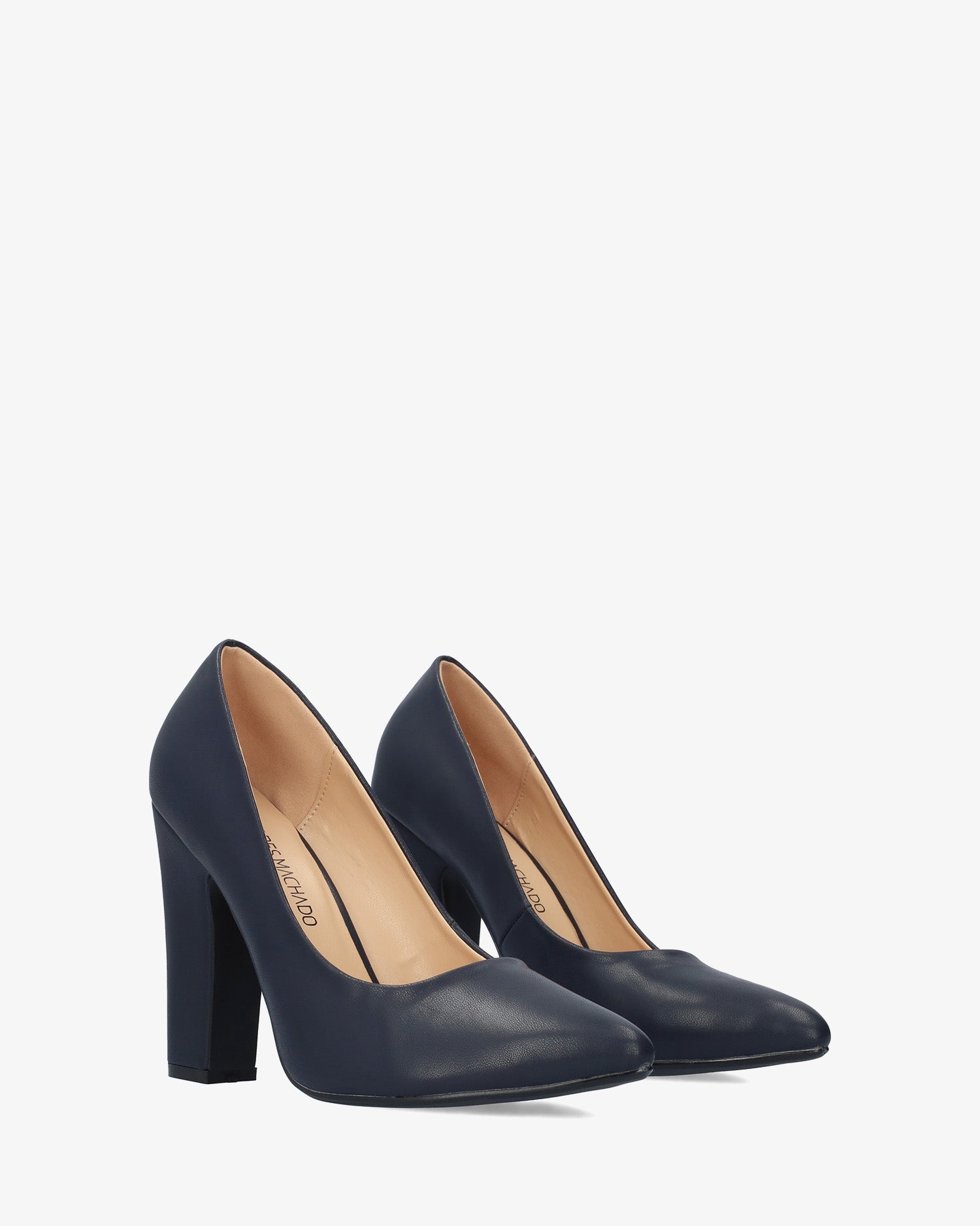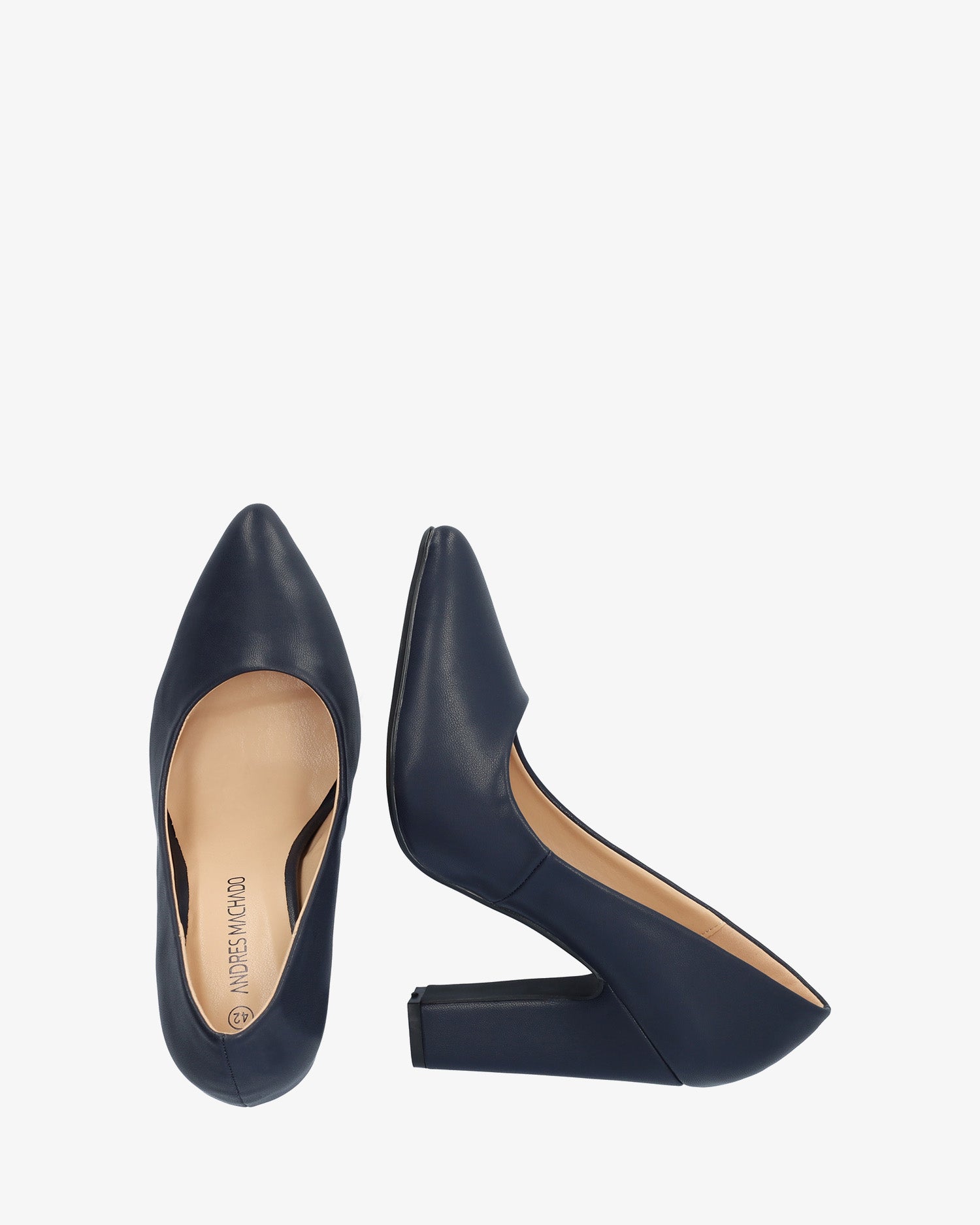 Salón clásico en soft Marino. Horma y tacón clásico. Acabado en punta fina. Tacón cuadrado forrado al tono de 9,5 cm de alto para las tallas pequeñas de la 32 a la 35. Tacón de 11 cm de alto para las tallas grandes de la 42 a la 45. Este modelo calza pequeño, se recomienda coger una talla más de la habitual.