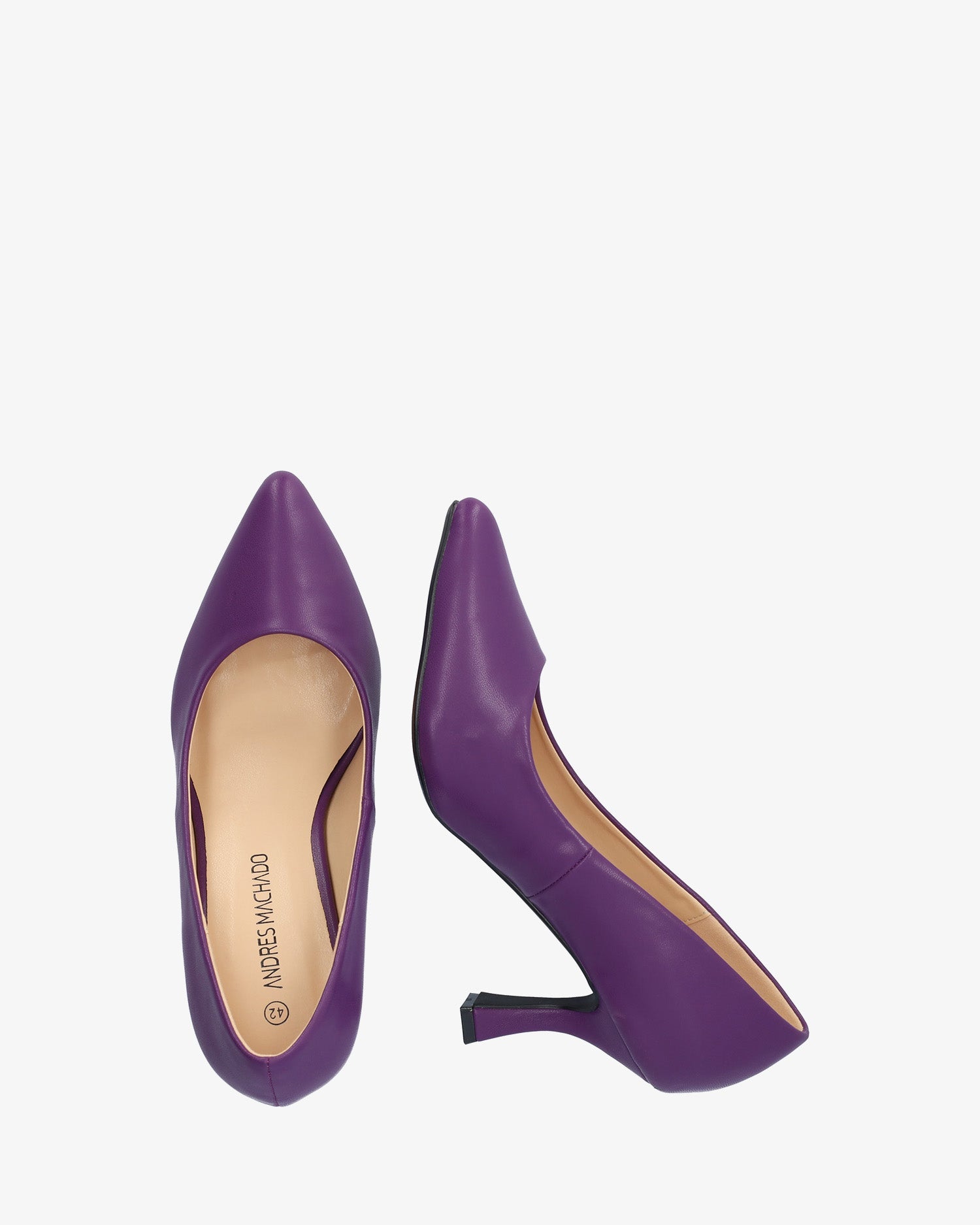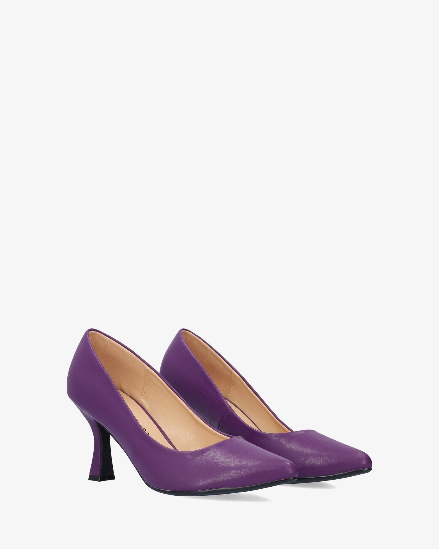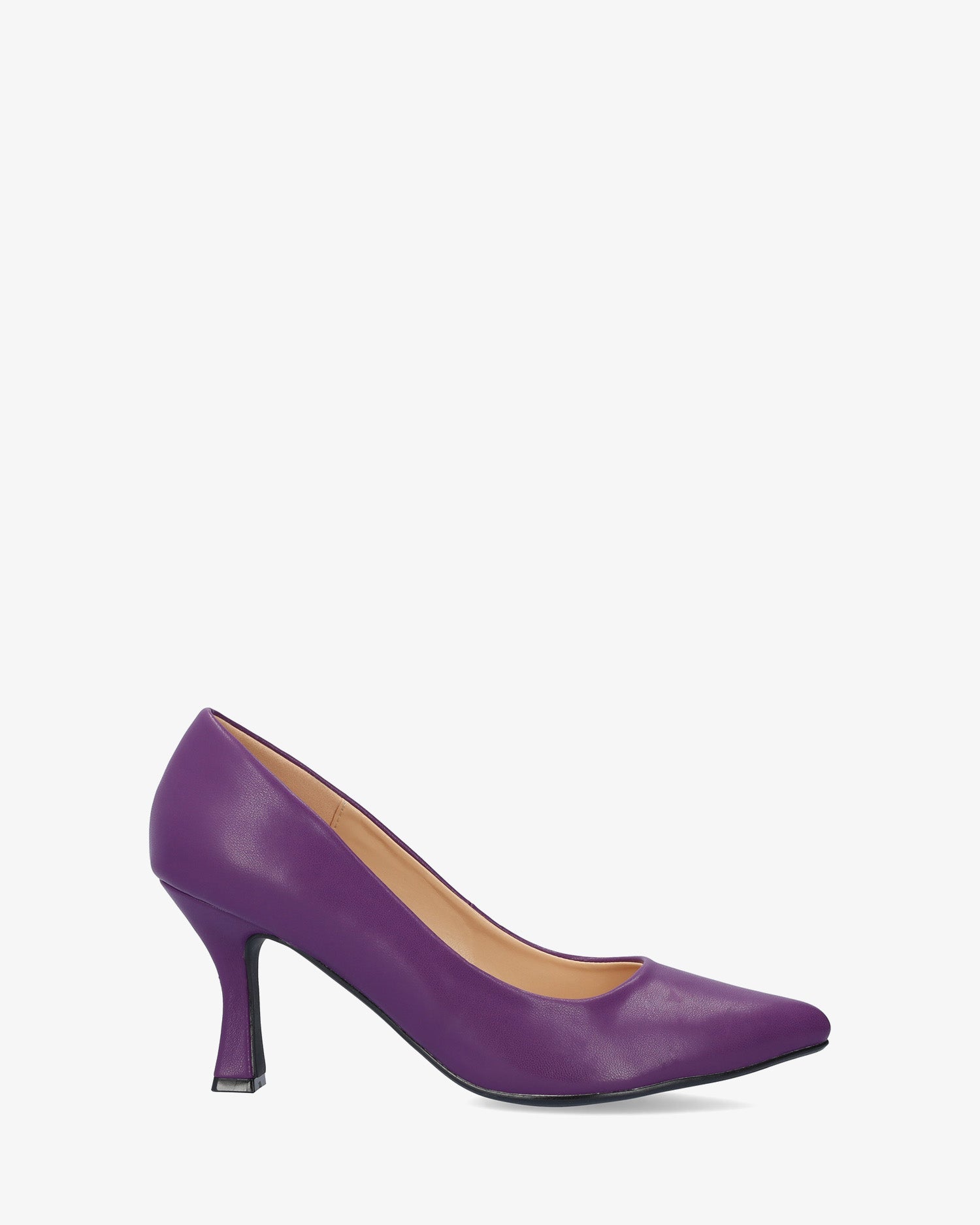 Salón en soft de color Morado. Acabado en punta fina. Tacón Kitten Heel al tono de 7 cm de alto para las tallas pequeñas de la 32 a la 35. Tacón de 8,5 cm de alto para las tallas grandes de la 42 a la 45.