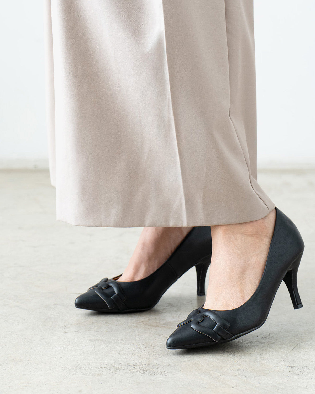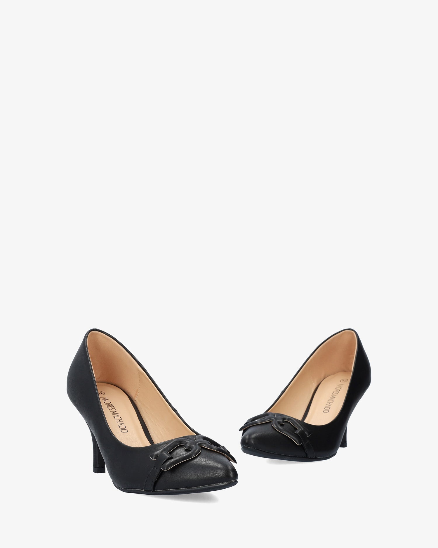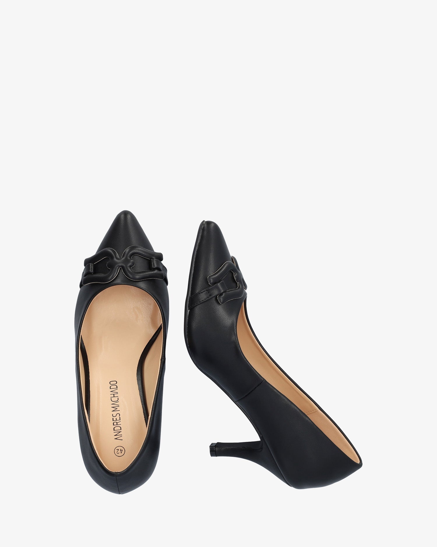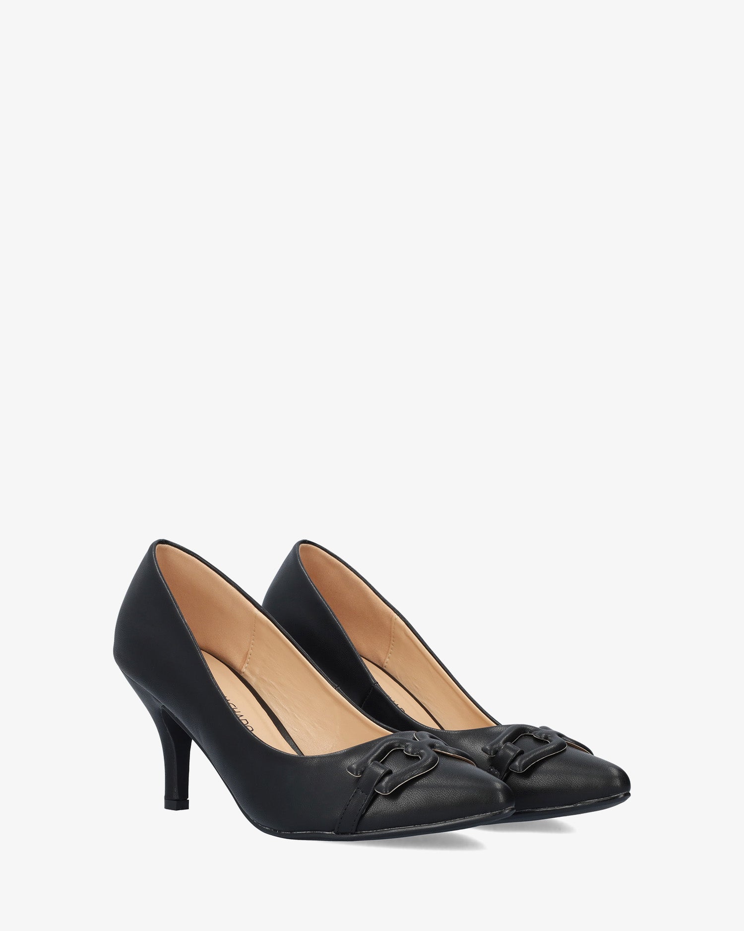 Salón en soft de color Negro. Aplique decorativo en forma de eslabones forrado al tono en la puntera. Horma clásica y acabado en punta fina. Tacón medio forrado al tono de 7 cm de alto para las tallas pequeñas de la 32 a la 35. Tacón de 8,5 cm de alto para las tallas grandes de la 42 a la 45.
