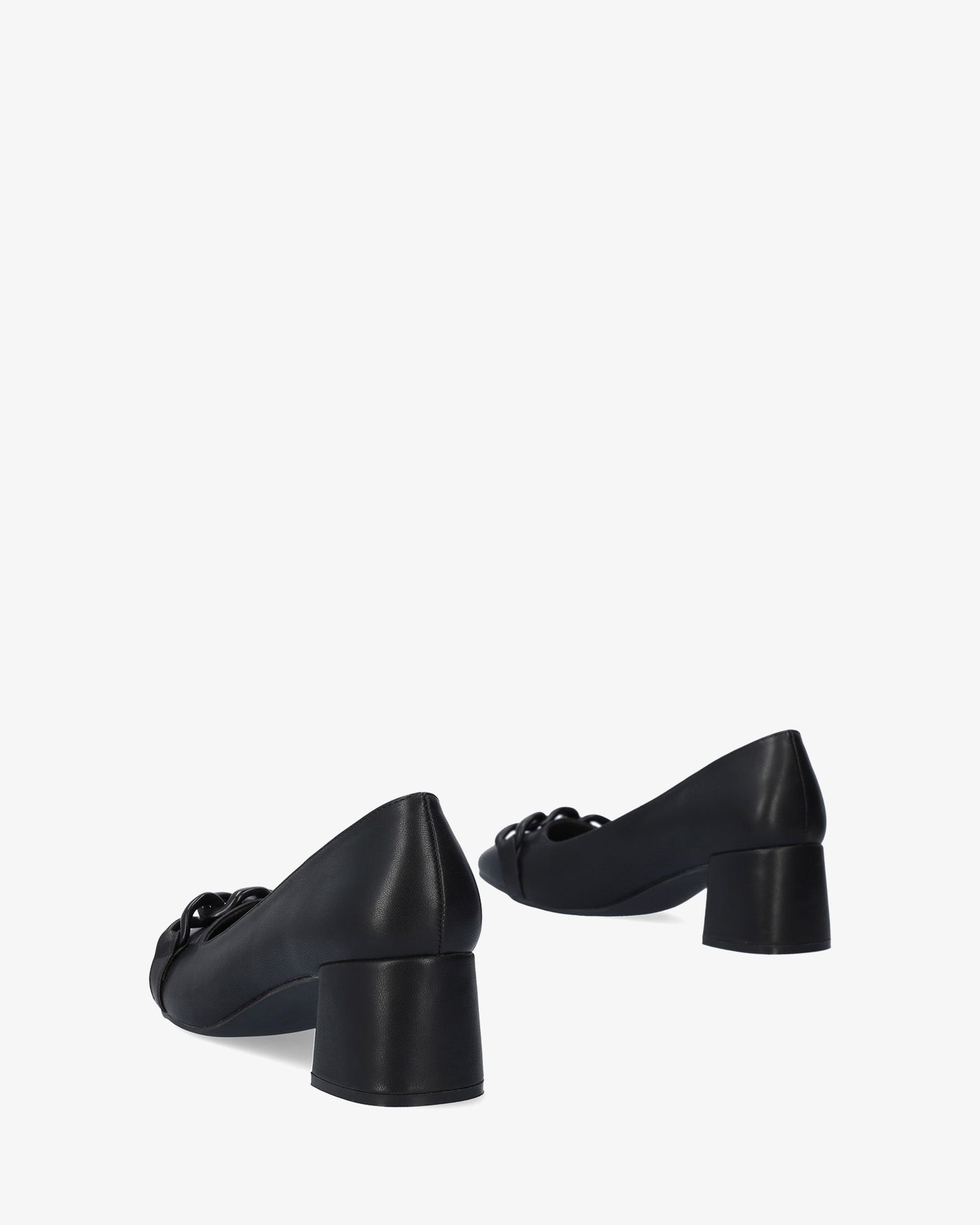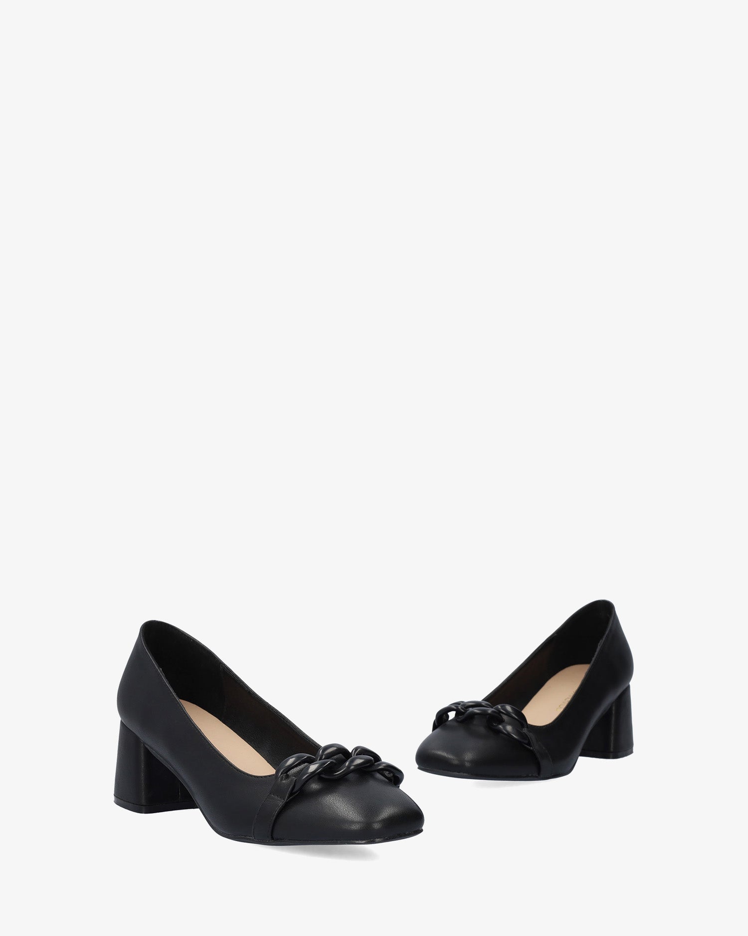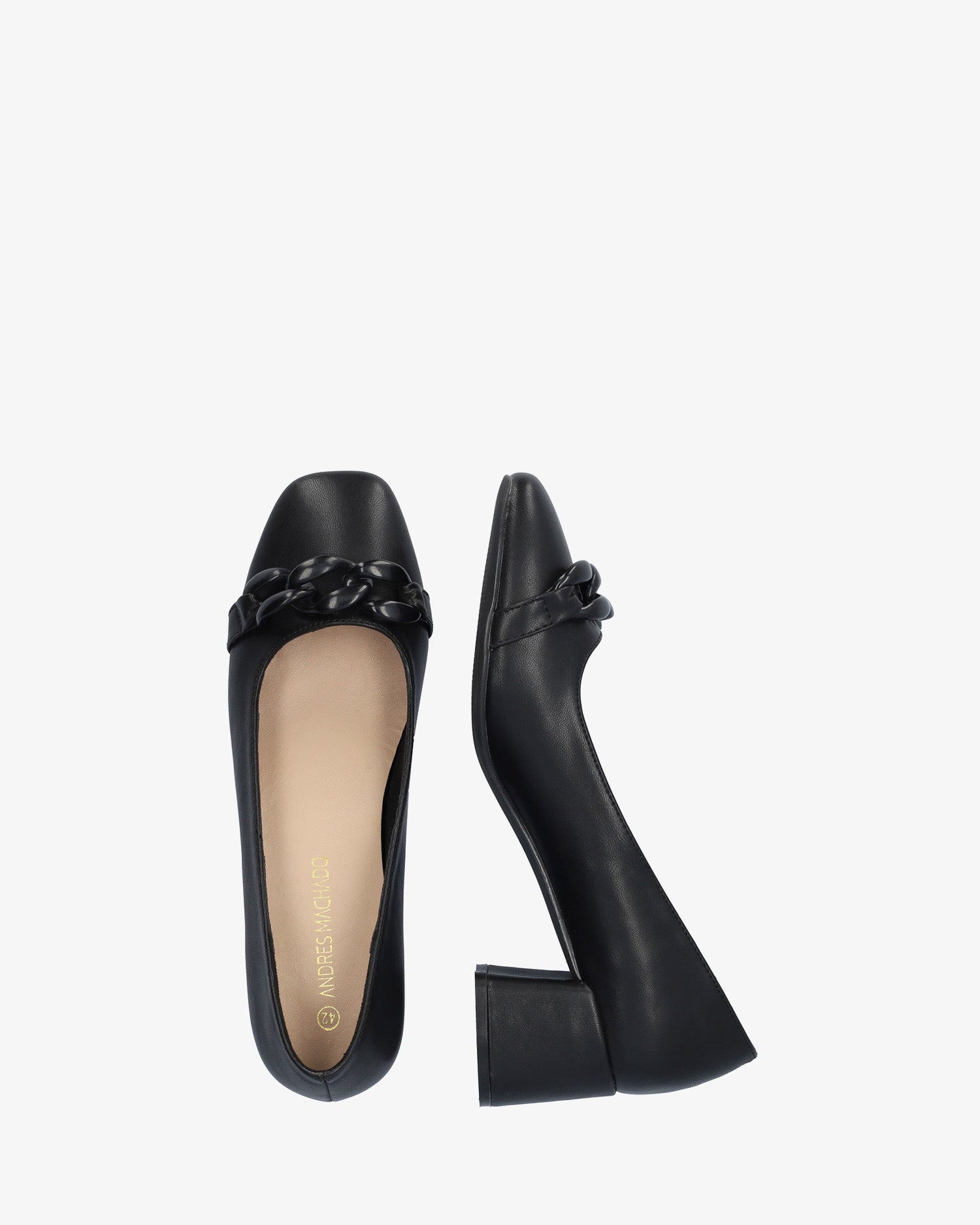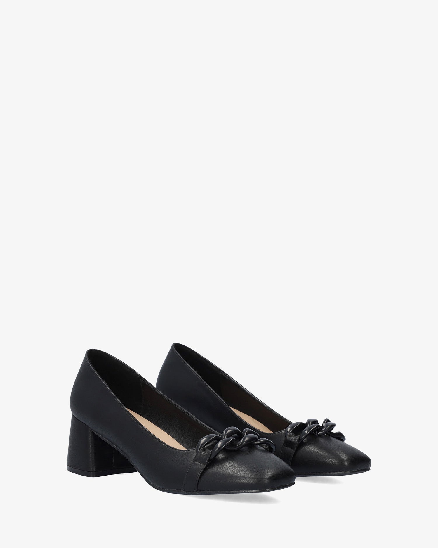 Salón de tacón en soft de color Negro. Detalle de cadena de eslabones al tono sobre el empeine. Acabado en punta cuadrada. Tacón ancho forrado al tono de 6 cm de alto para las tallas pequeñas de la 32 a la 35. Tacón de 6,5 cm de alto para las tallas grandes de la 42 a la 45.