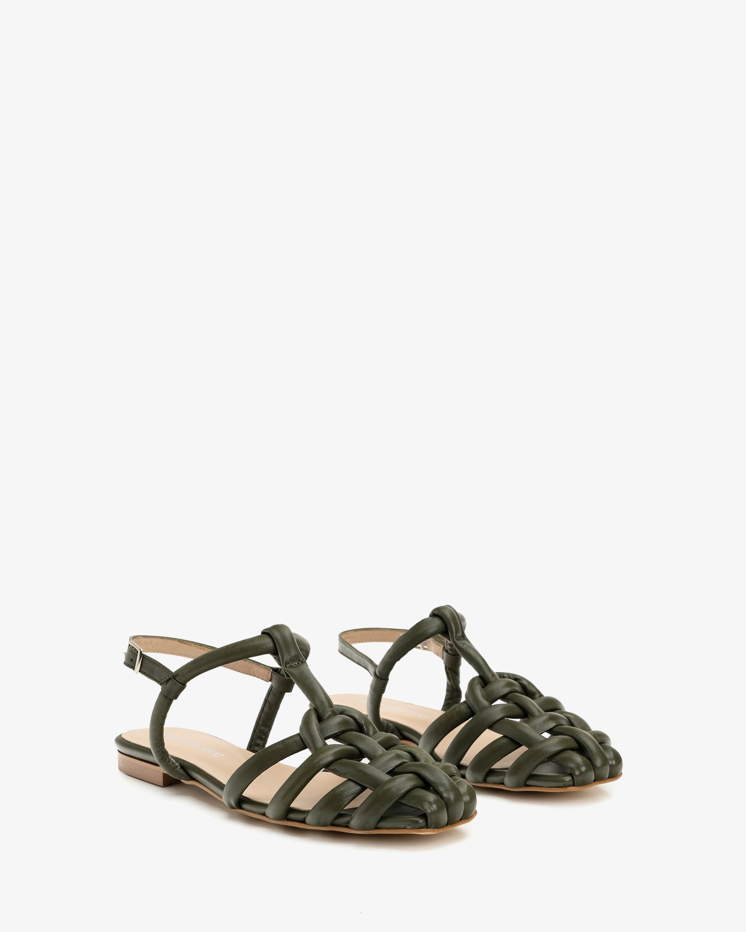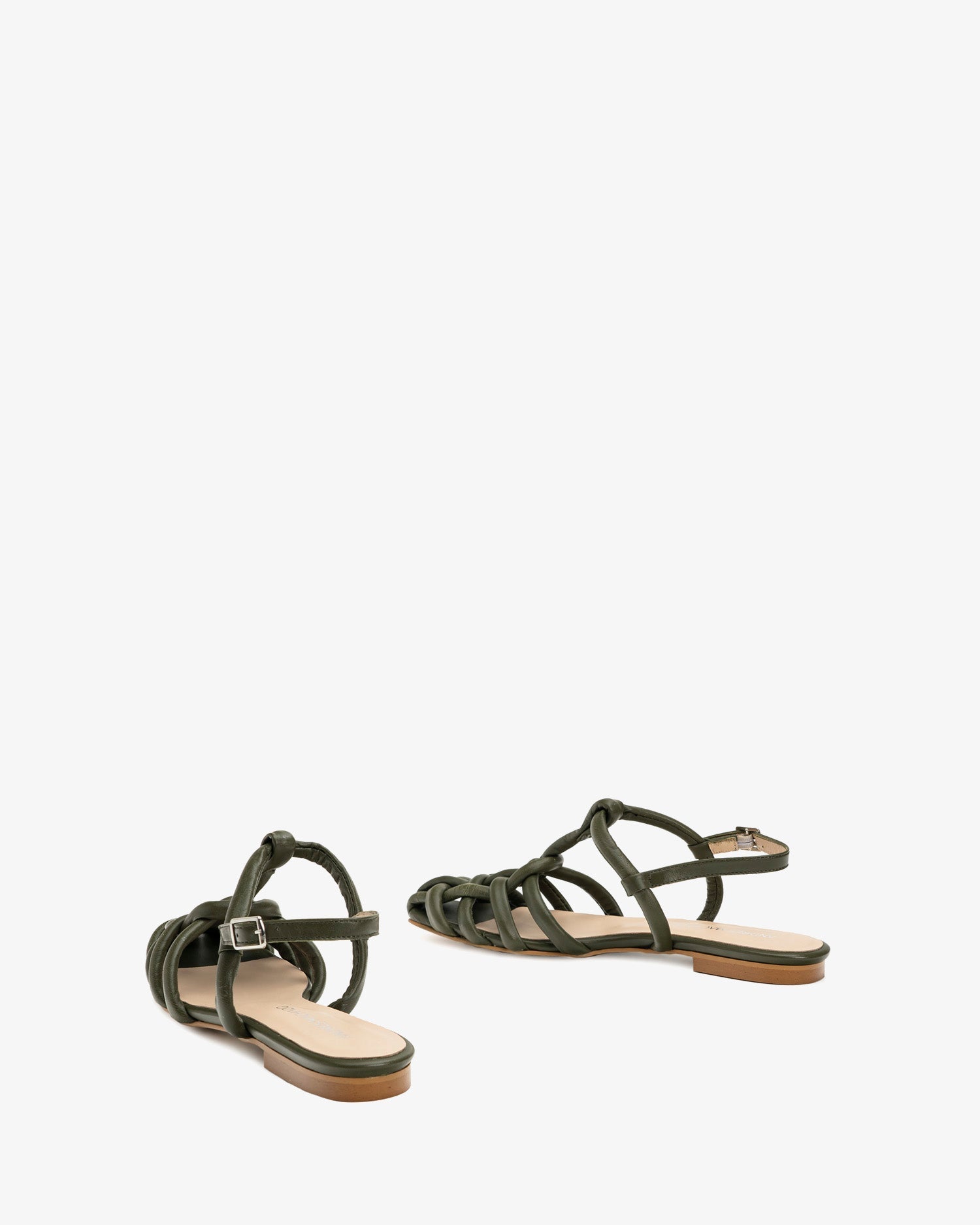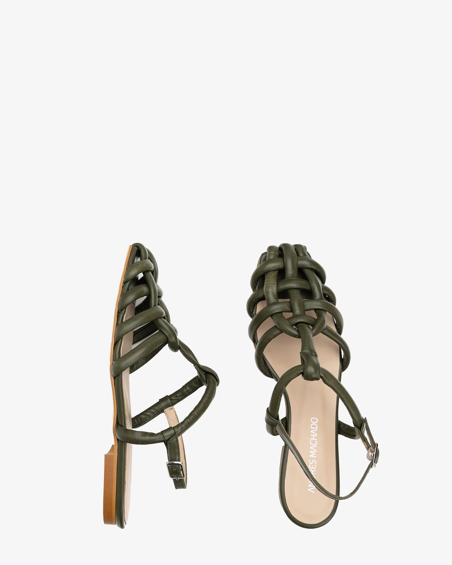 Sandalias planas en piel de color Kaki. Sandalias de estilo cangrejeras con tiras tubulares entrelazadas. Tira tubular en la parte trasera y cierre de hebilla. Acabado en punta cuadrada. Todas las tallas de la 32 a la 45. Fabricación española.