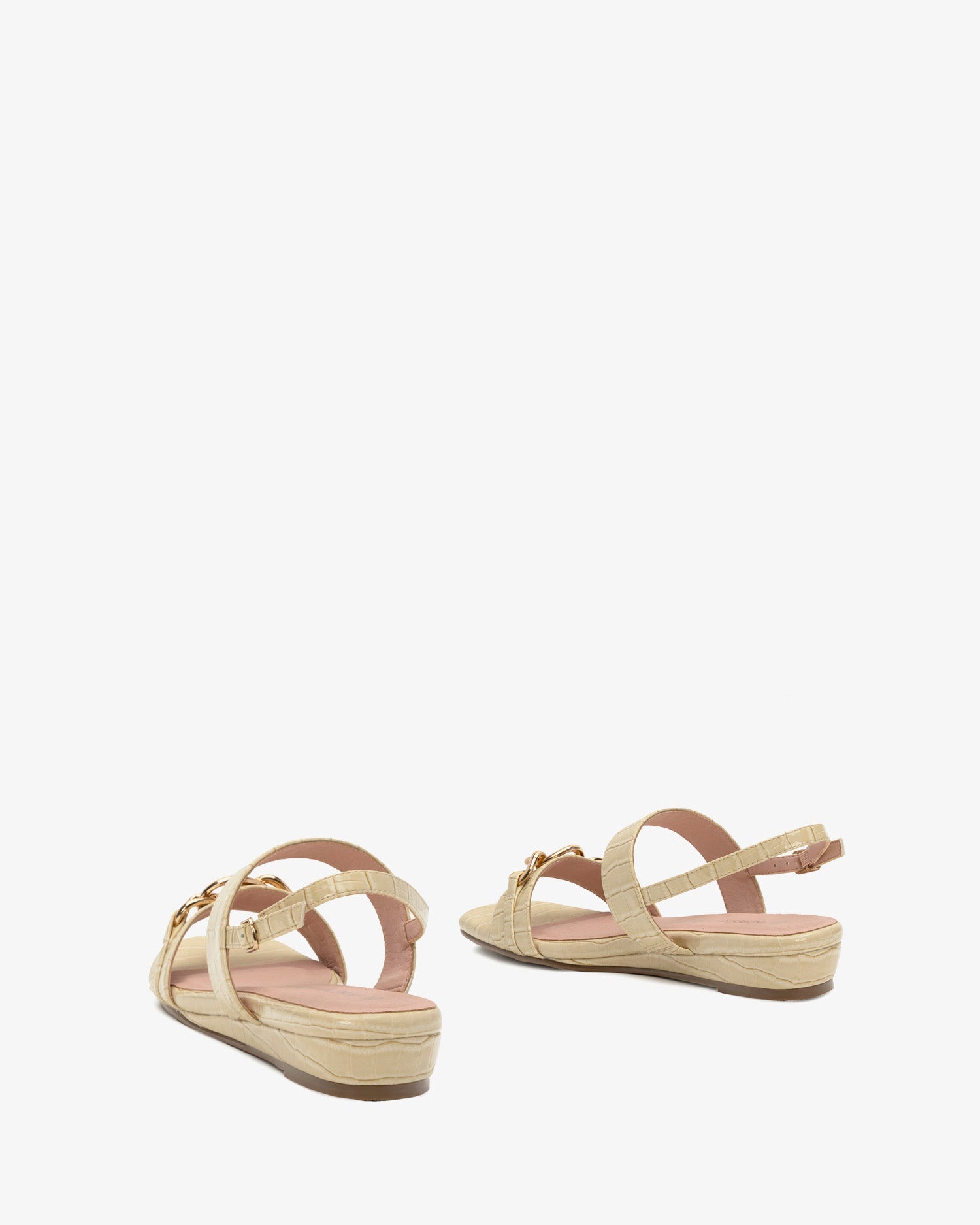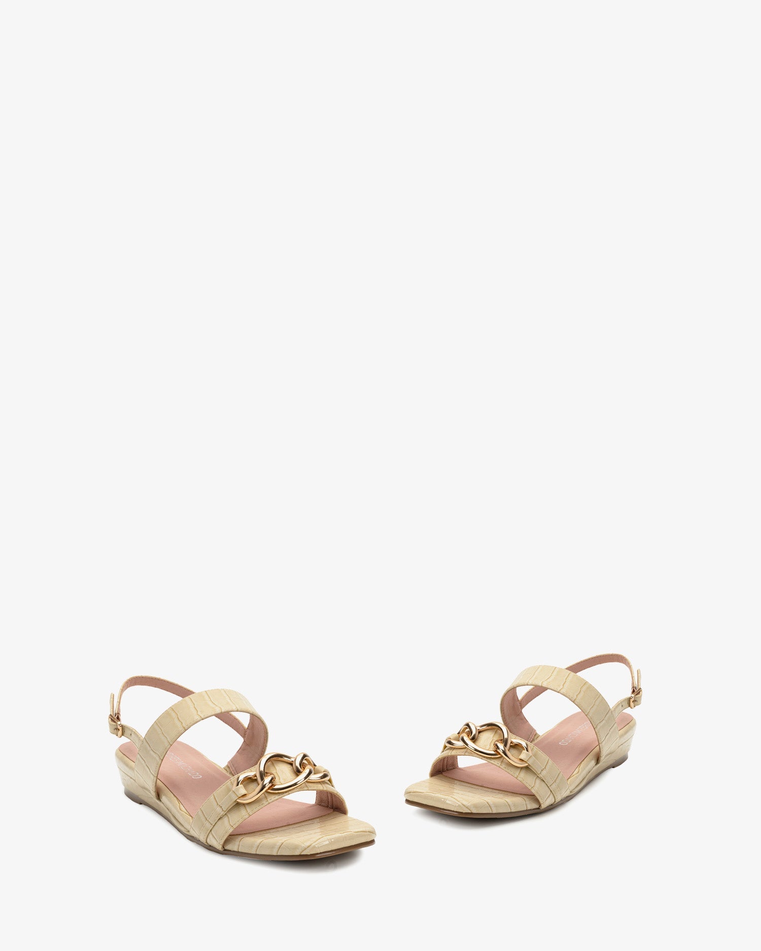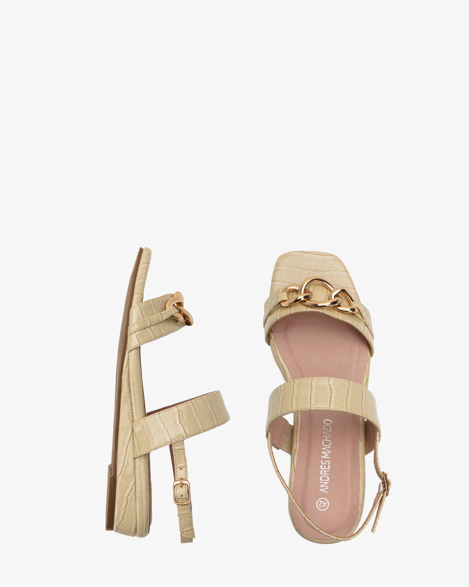 Sandalia en soft grabado Coco celeste con efecto charol. Diseño de tira ancha al tono en la puntera con detalle de eslabones dorados. Tira ancha en grabado Coco Beige en el empeine y tira trasera con cierre de hebilla al tobillo al tono. Punta cuadrada y abierta. Cuña forrada al tono de 2,5 cm para las tallas pequeñas de la 32 a la 35. Cuña de 3 cm para las tallas grandes de la 42 a la 45.