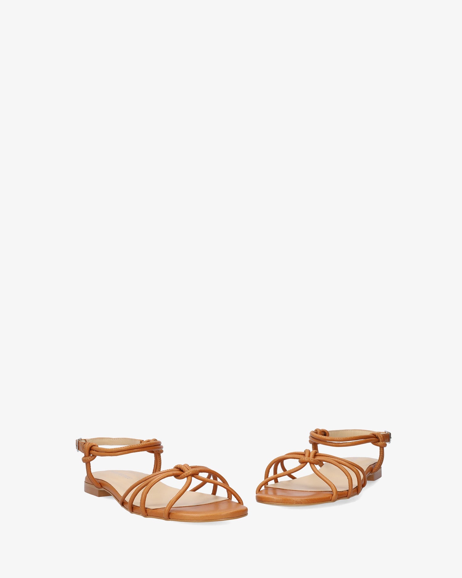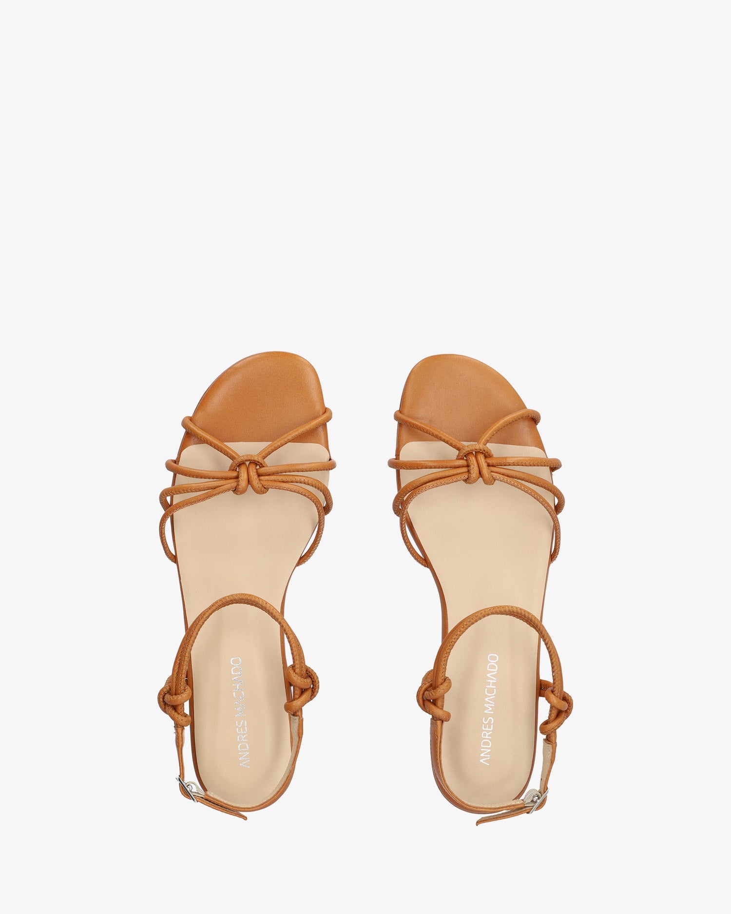 Sandalias planas en piel de color cuero. Diseño de tiras tubulares anudadas en la parte delantera. Cierre hebilla lateral con pulsera al tobillo anudada con tiras tubulares. Acabado en punta redondeada y abierta. Tacón de 2 cm para las tallas pequeñas de la 32 a la 35. Tacón de 2 cm para las tallas grandes de la 42 a la 45. Fabricado en España