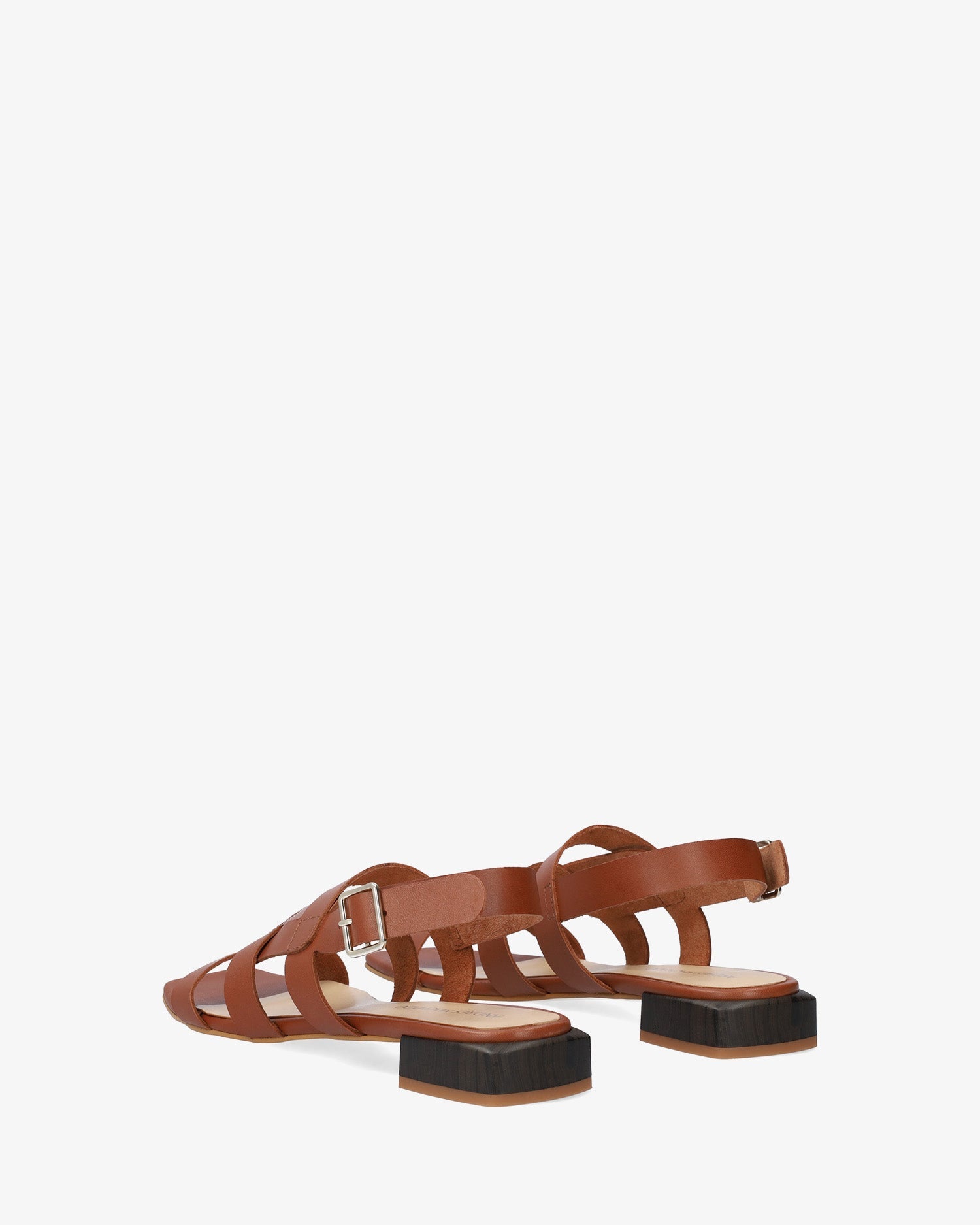 Sandalias planas en piel de color marrón. Diseño con tira fina en la puntera y dos tiras paralelas entrelazadas en el empeine con cierre mediante hebilla metálica. Acabado en punta cuadrada y abierta. Tacón bloque efecto madera de 2,5 cm para las tallas pequeñas de la 32 a la 35. Tacón de 2,5 cm para las tallas medianas de la 36 a la 41. Tacón de 3 cm para las tallas grandes de la 42 a la 45. Fabricado en España