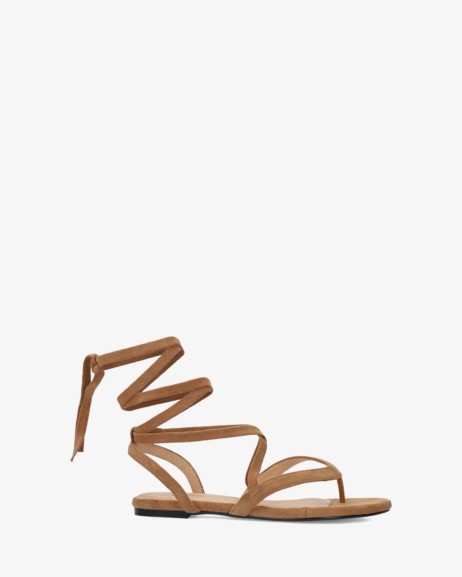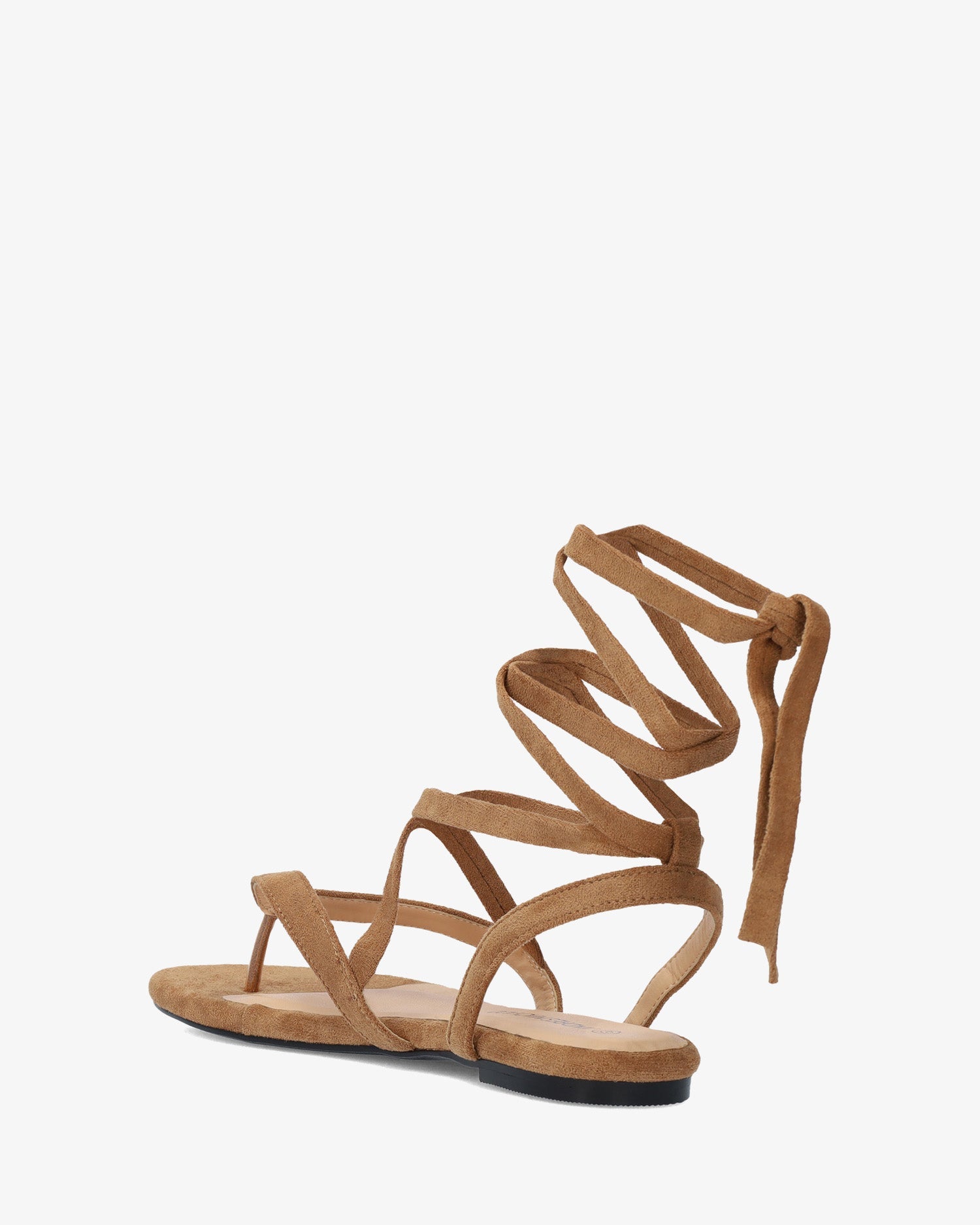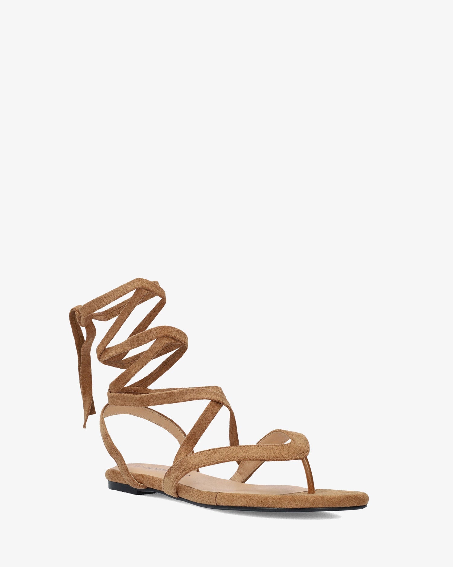 Sandalia plana en símil ante de color Camel. Diseño destalonado con acabado en sandalia de dedo con cierre de cordones atados alrededor del tobillo al tono. Puntera redondeada y abierta. Tallas grandes de la 42 a la 45.