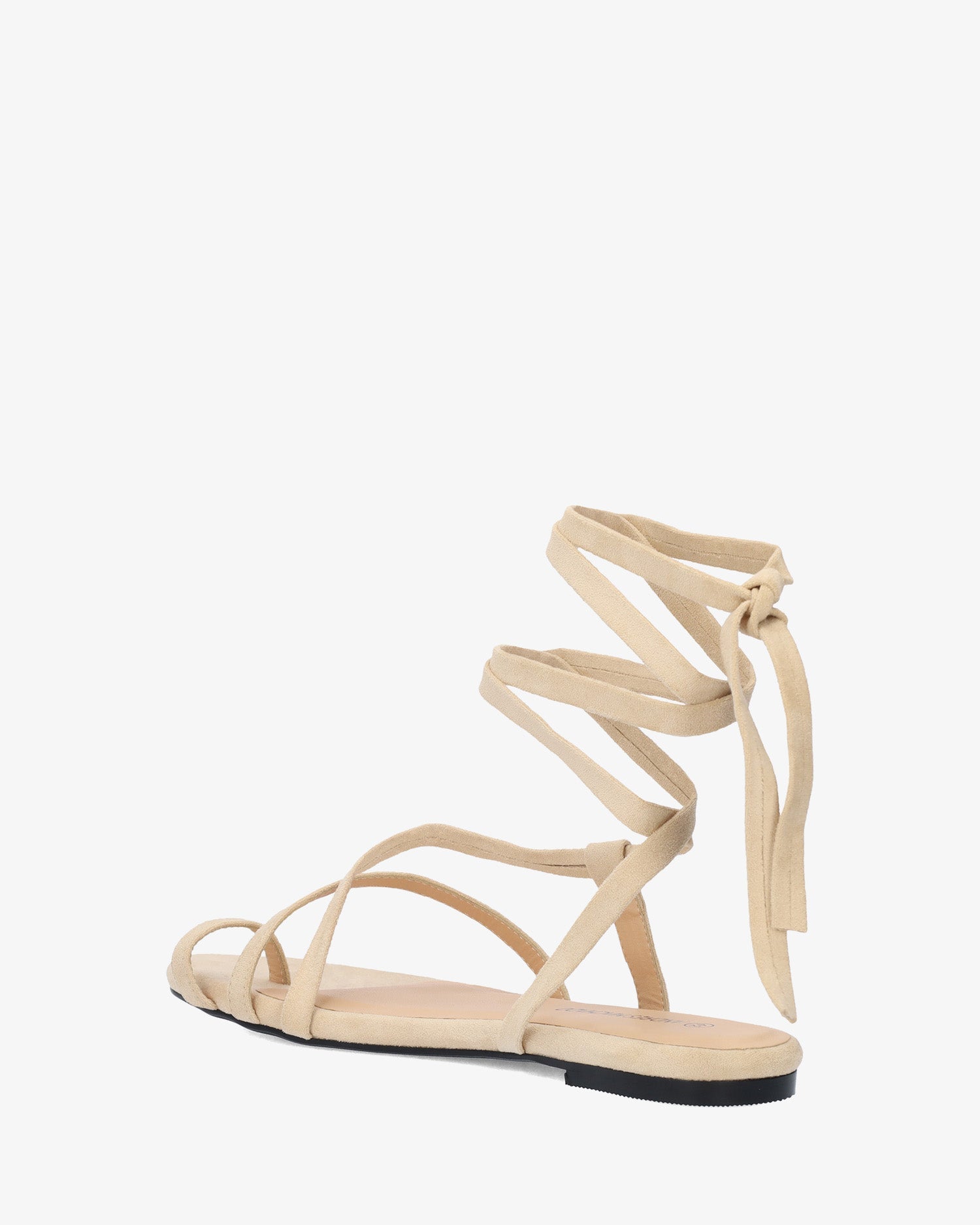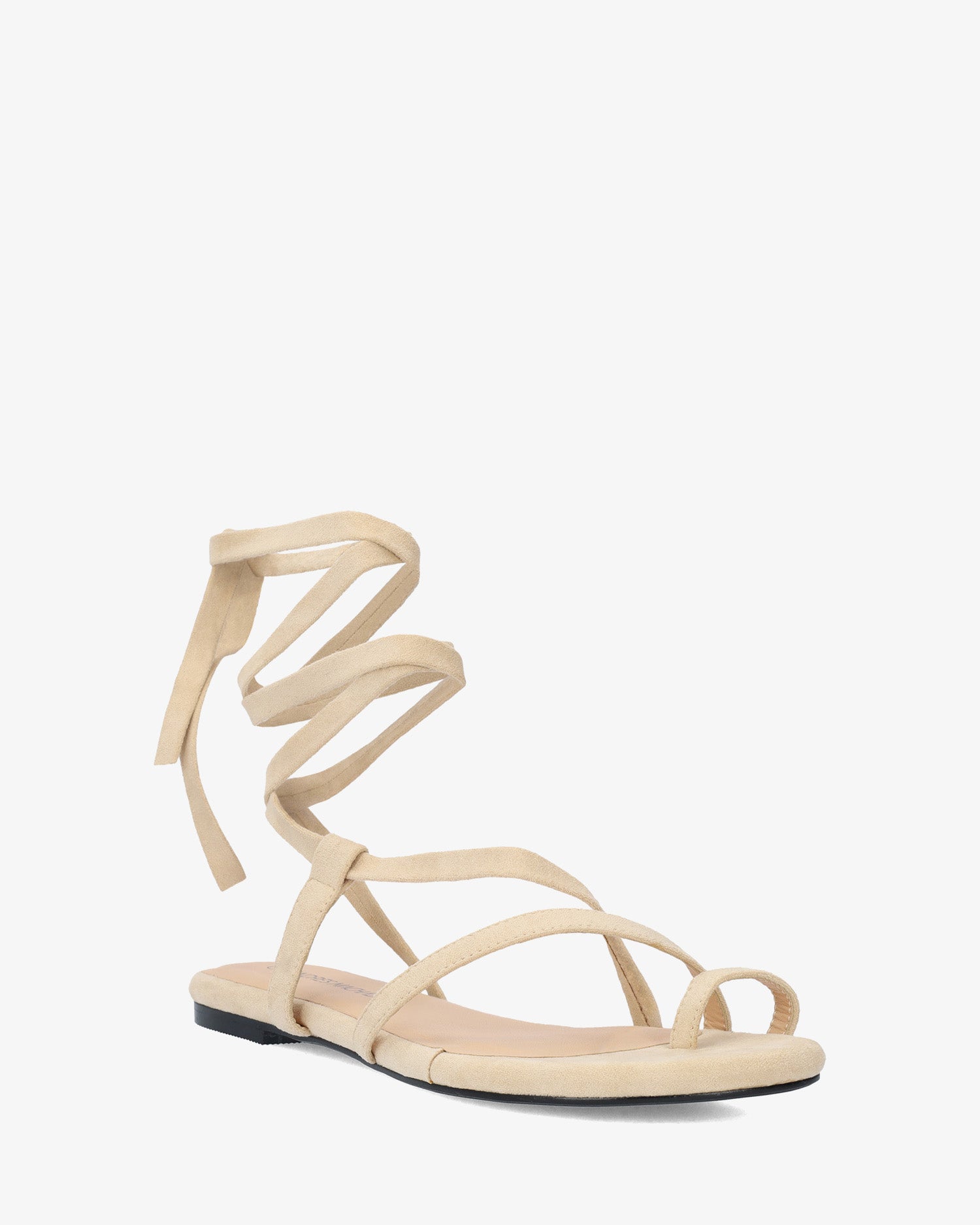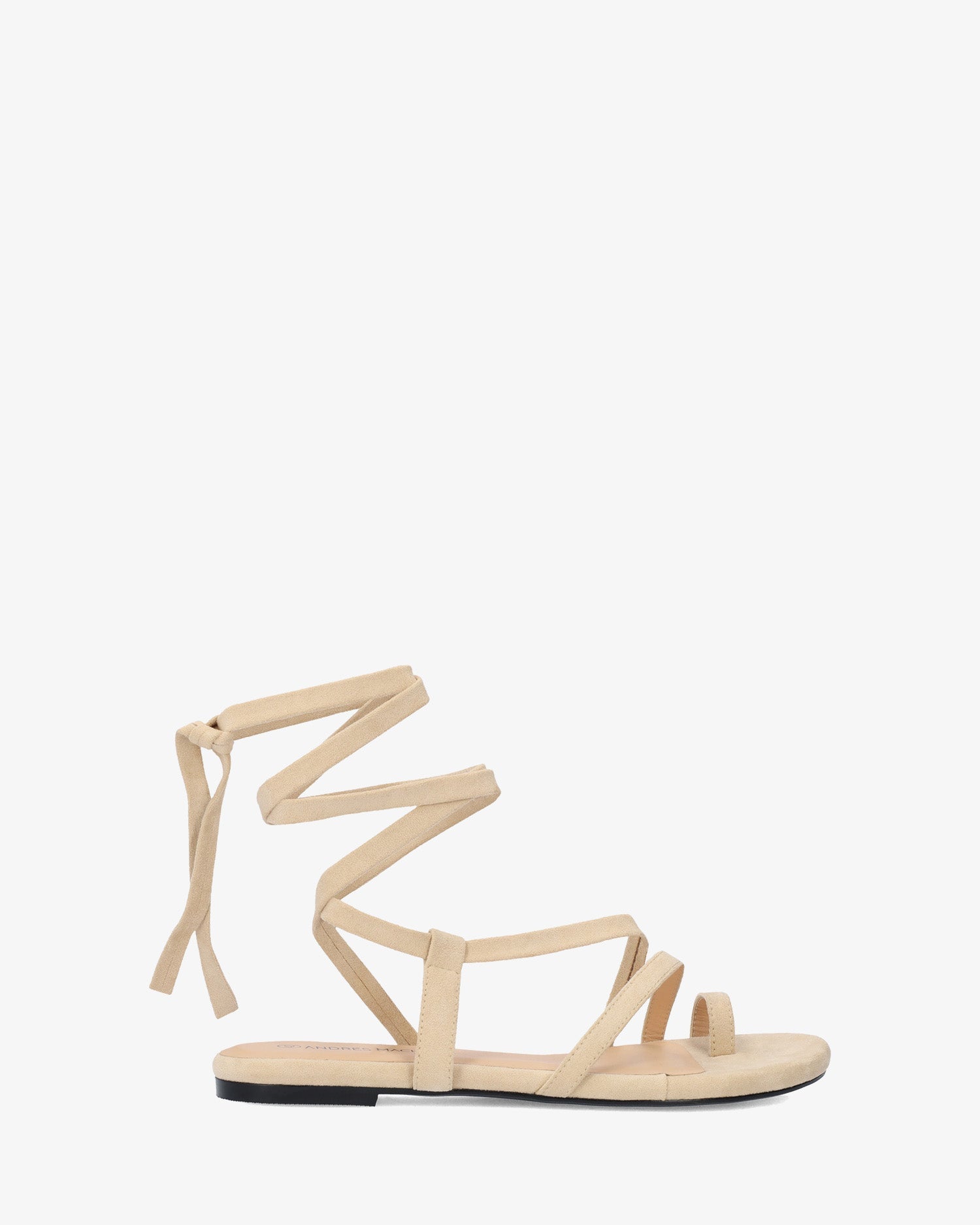 Sandalia plana en símil ante de color Crema y horma de ancho especial. Diseño destalonado con tira de dedo y tiras cruzadas en el empeine al tono. Cierre de cordones atados alrededor del tobillo al tono. Puntera redondeada y abierta. Tallas grandes de la 42 a la 45.