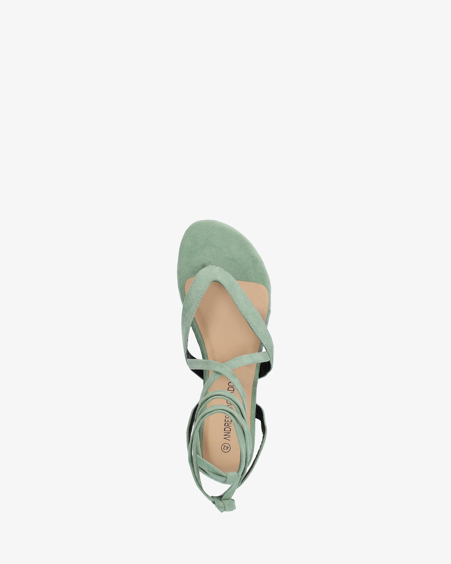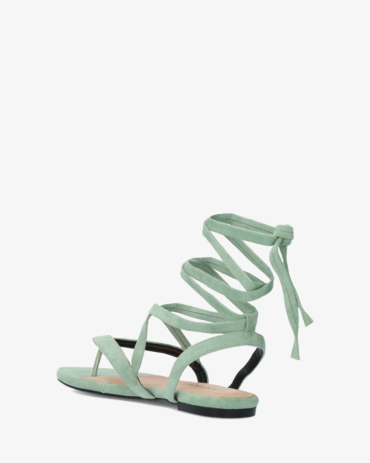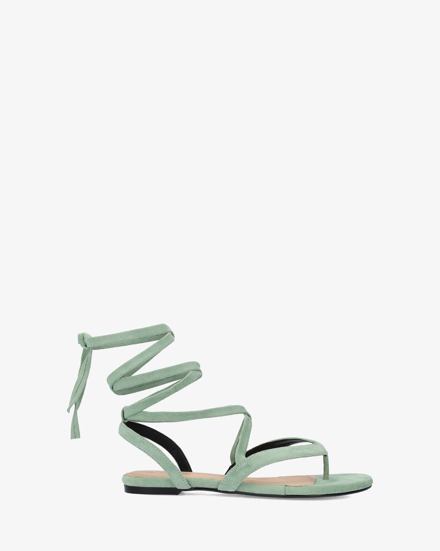 Sandalia plana en símil ante de color Menta. Diseño destalonado con acabado en sandalia de dedo con cierre de cordones atados alrededor del tobillo al tono. Puntera redondeada y abierta. Tallas grandes de la 42 a la 45.