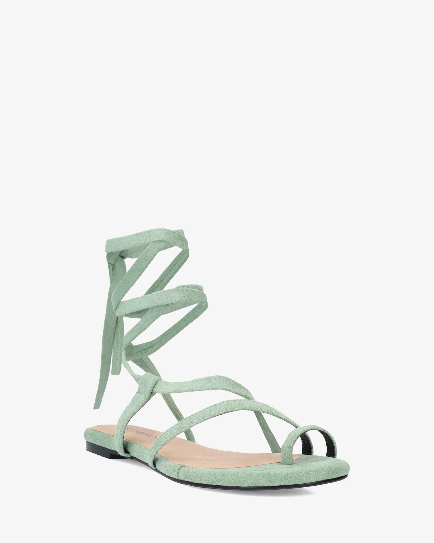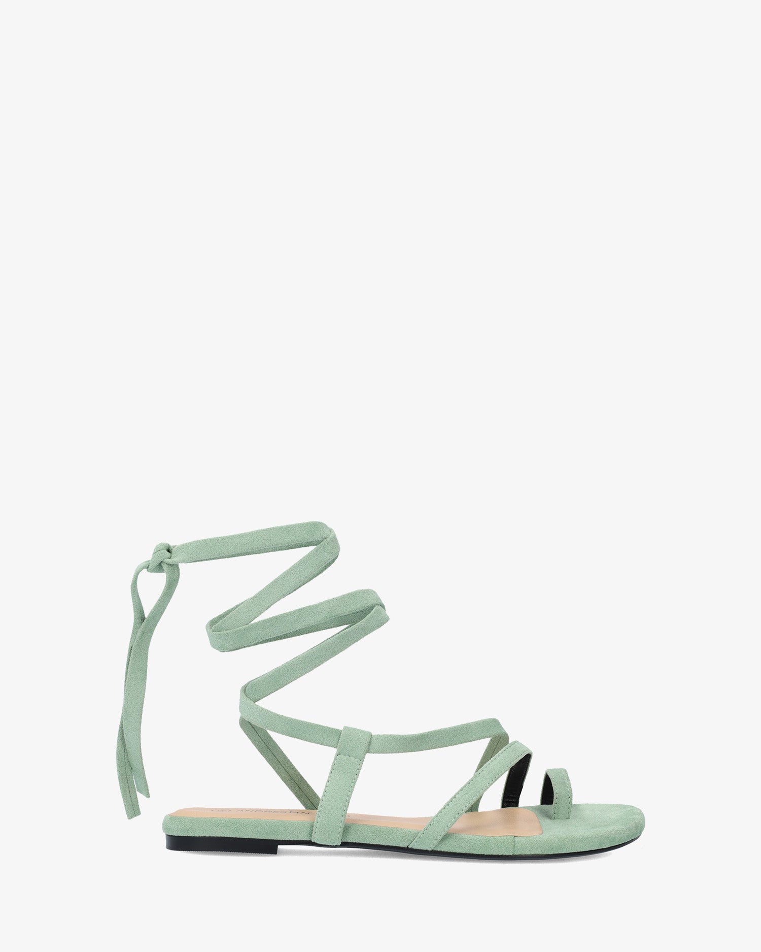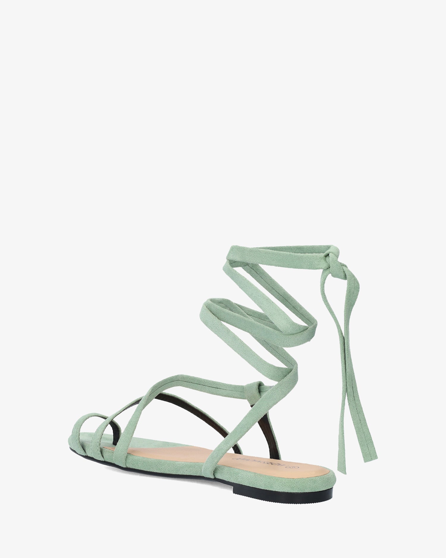 Sandalia plana en símil ante de color Menta y horma de ancho especial. Diseño destalonado con tira de dedo y tiras cruzadas en el empeine al tono. Cierre de cordones atados alrededor del tobillo al tono. Puntera redondeada y abierta. Tallas grandes de la 42 a la 45.