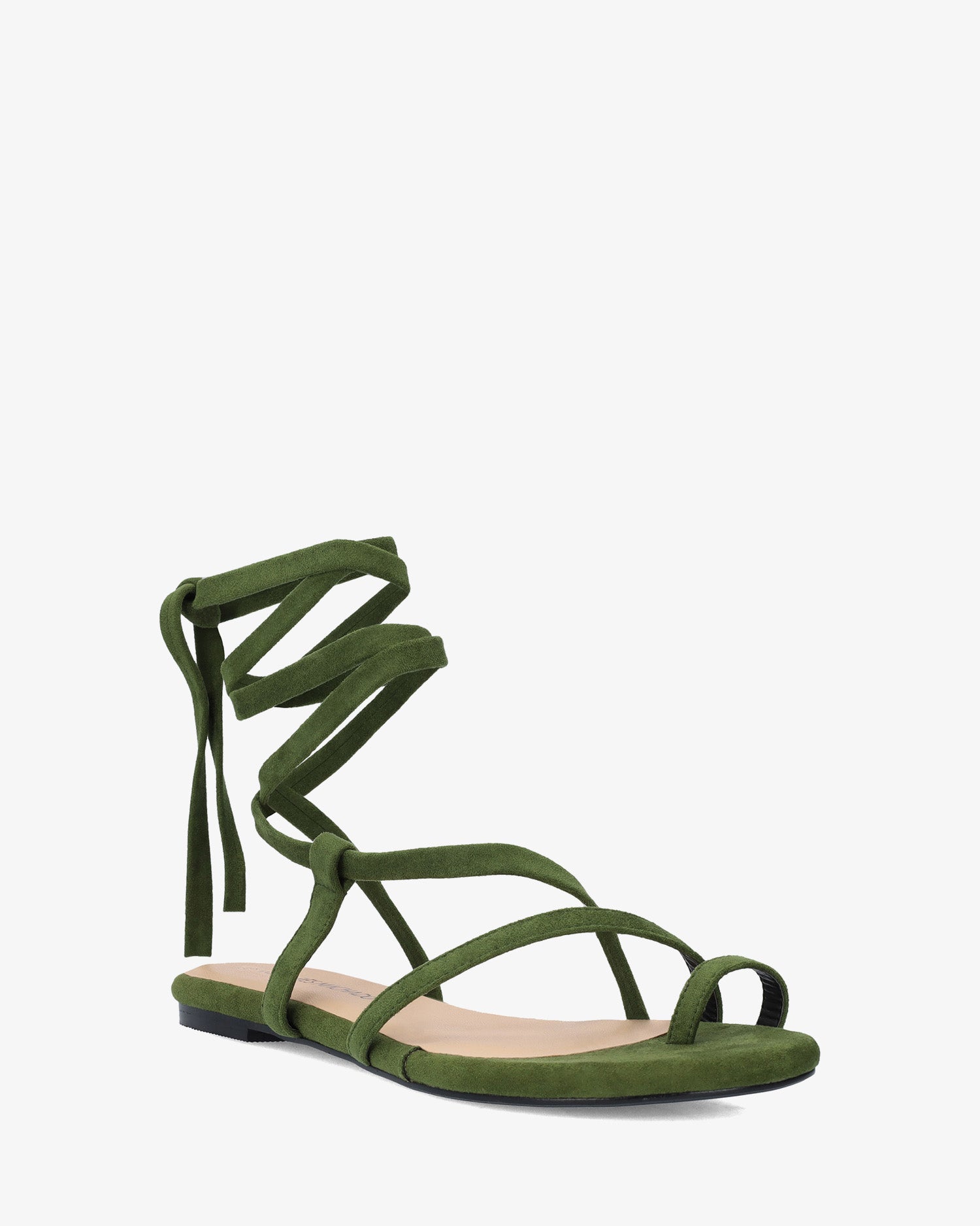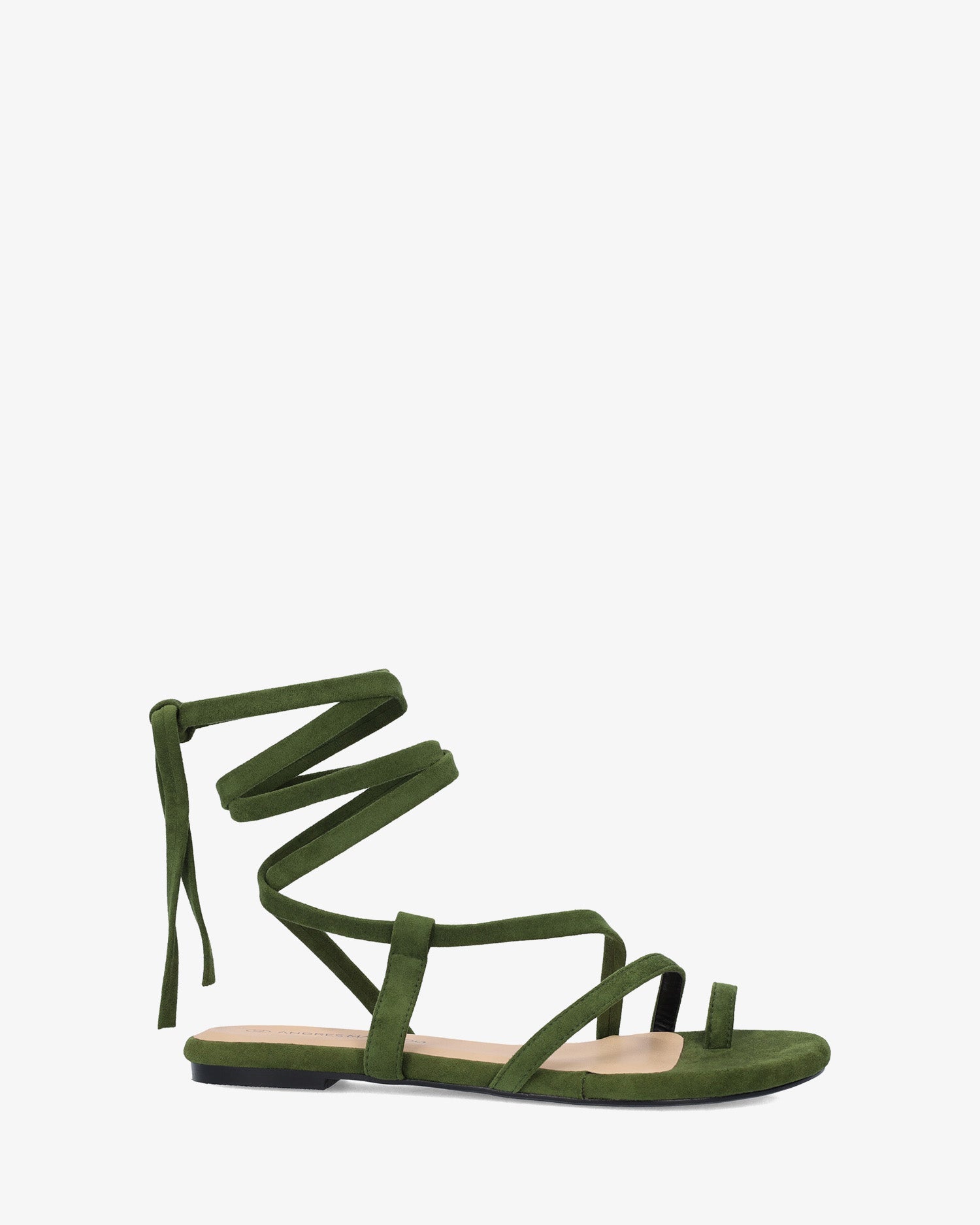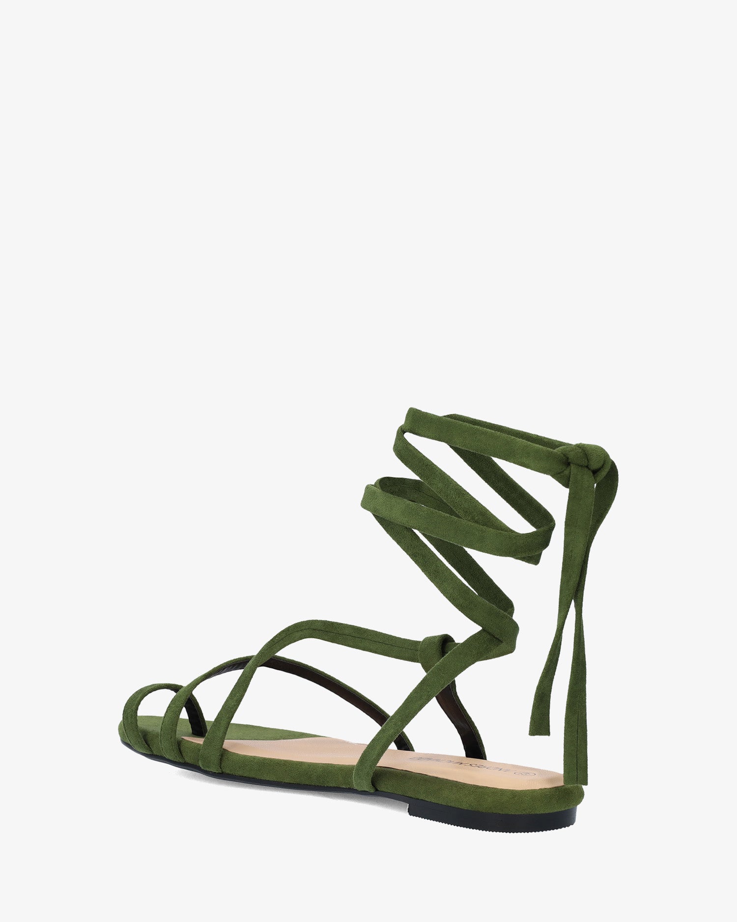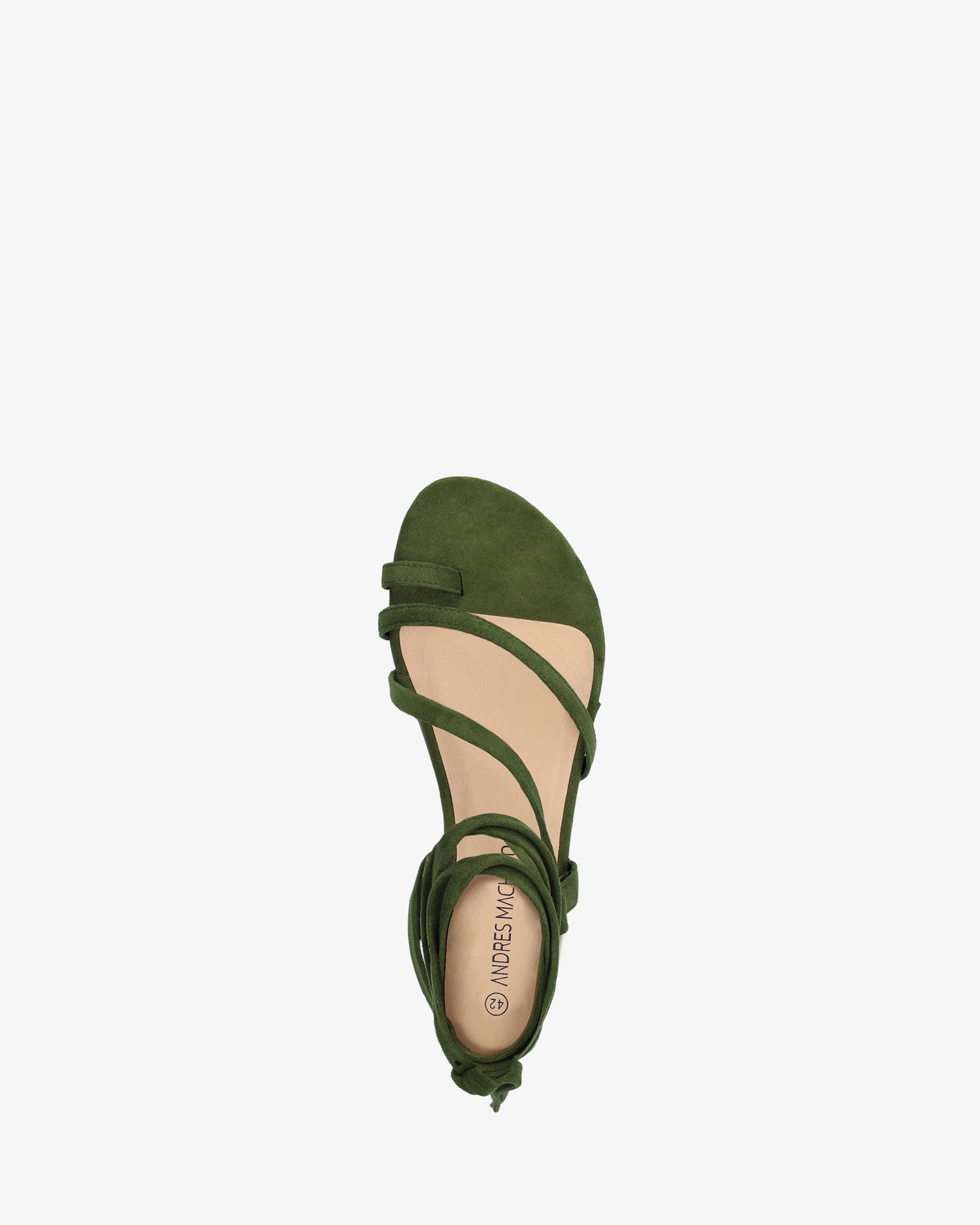 Sandalia plana en símil ante de color Pino y horma de ancho especial. Diseño destalonado con tira de dedo y tiras cruzadas en el empeine al tono. Cierre de cordones atados alrededor del tobillo al tono. Puntera redondeada y abierta. Tallas grandes de la 42 a la 45.