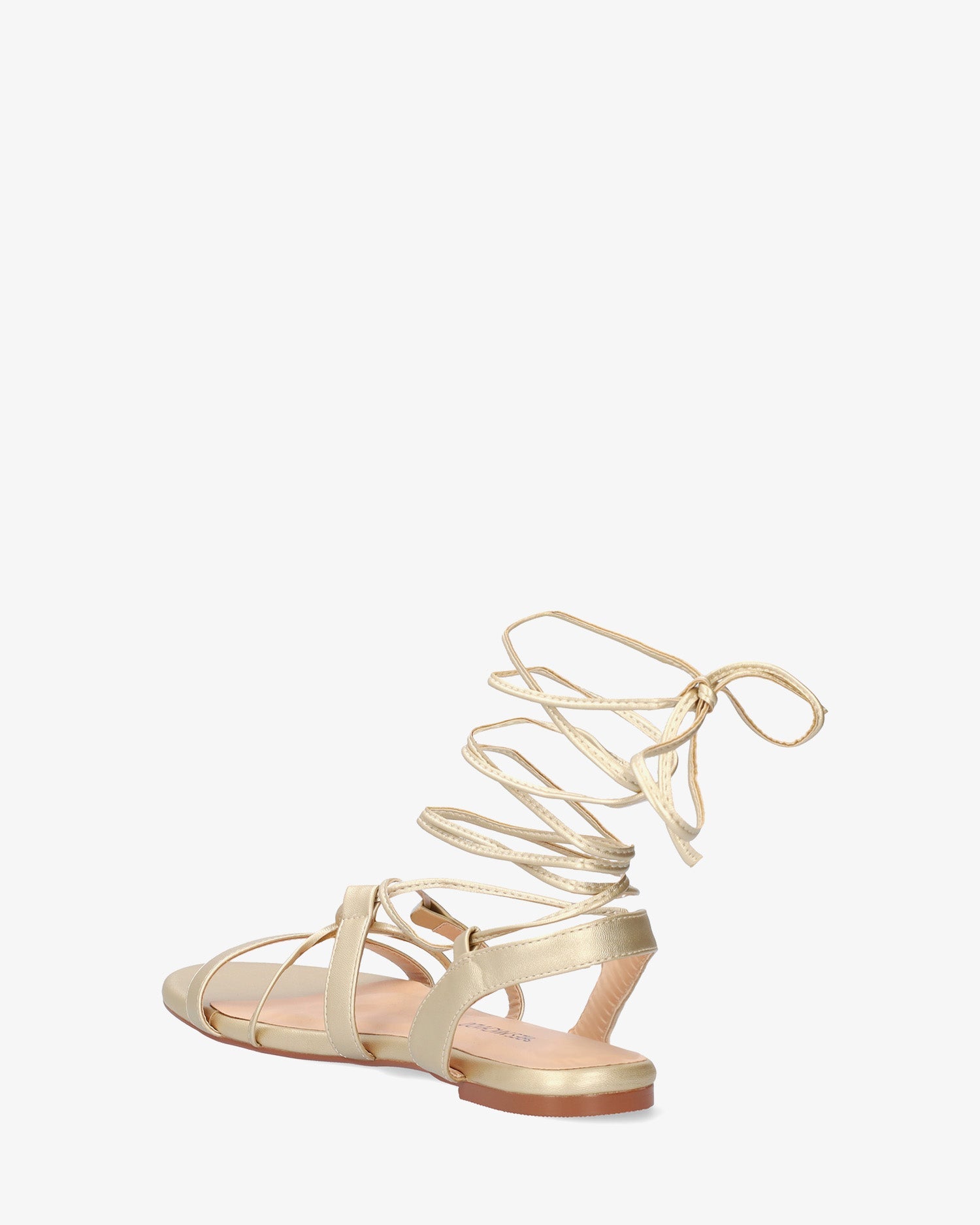 Sandalias planas en soft color Oro y horma de ancho especial. Diseño destalonado con tiras finas delanteras y sobre el empeine sujetadas por tiras laterales. Cierre con tiras envolventes en el tobillo. Punta abierta y redondeada. Tacón de 2 cm para las tallas pequeñas de la 32 a la 32 y de las tallas grandes de la 42 a la 45.