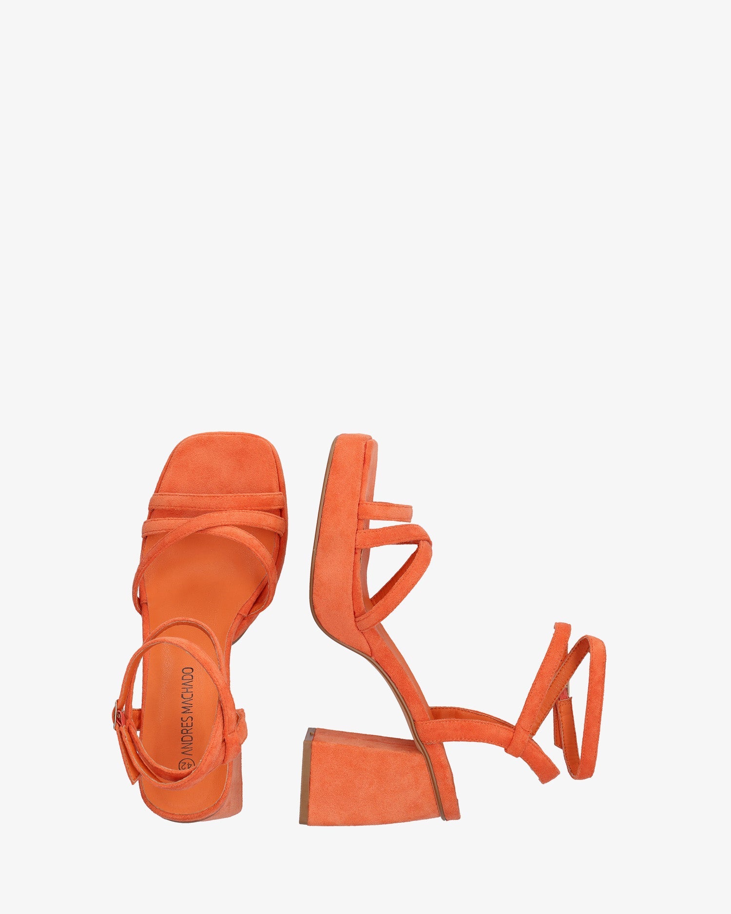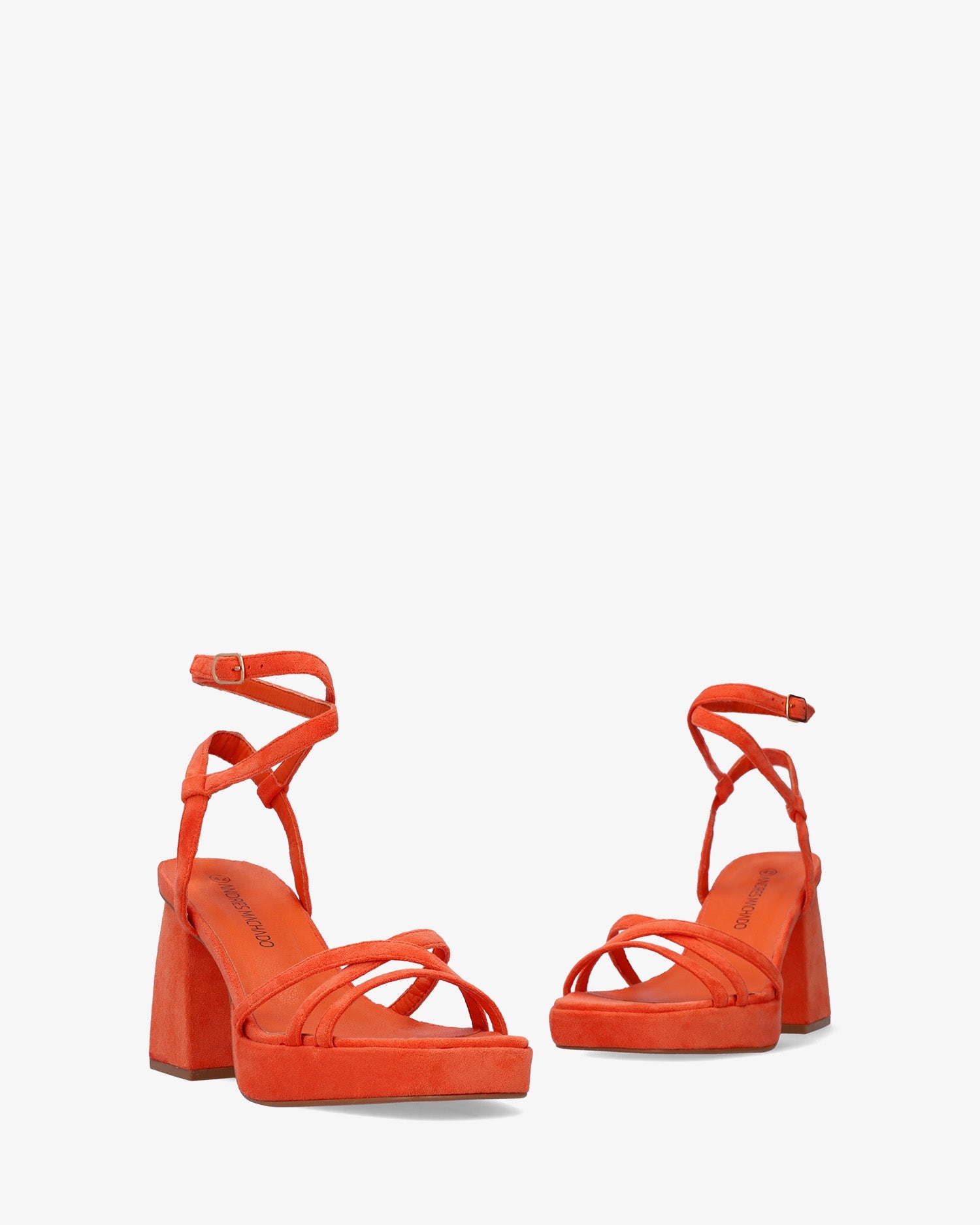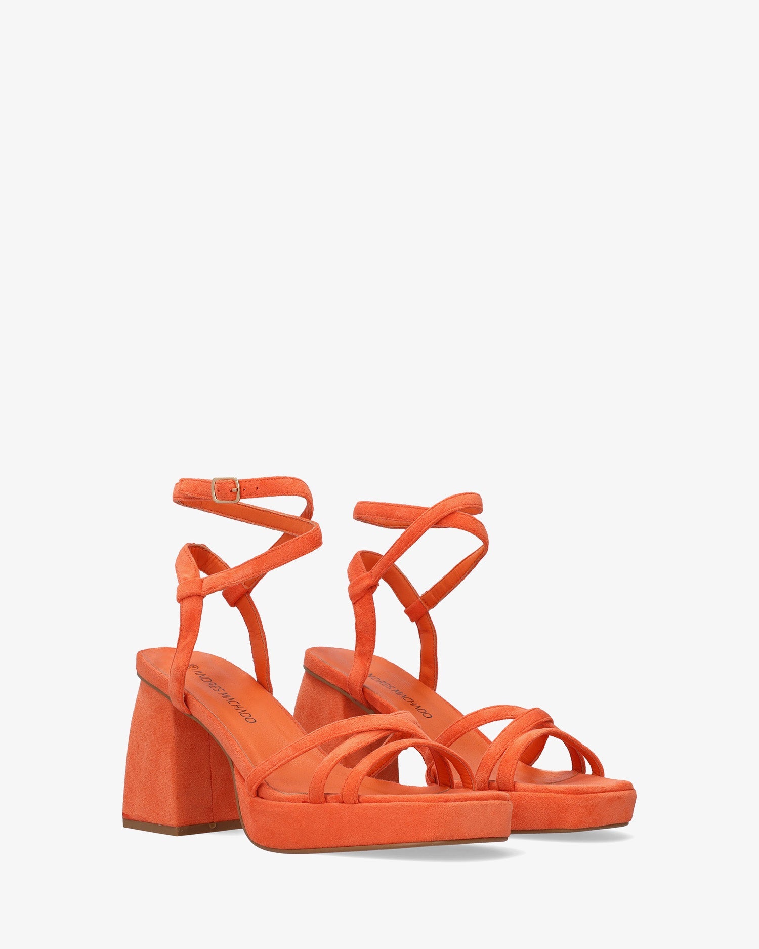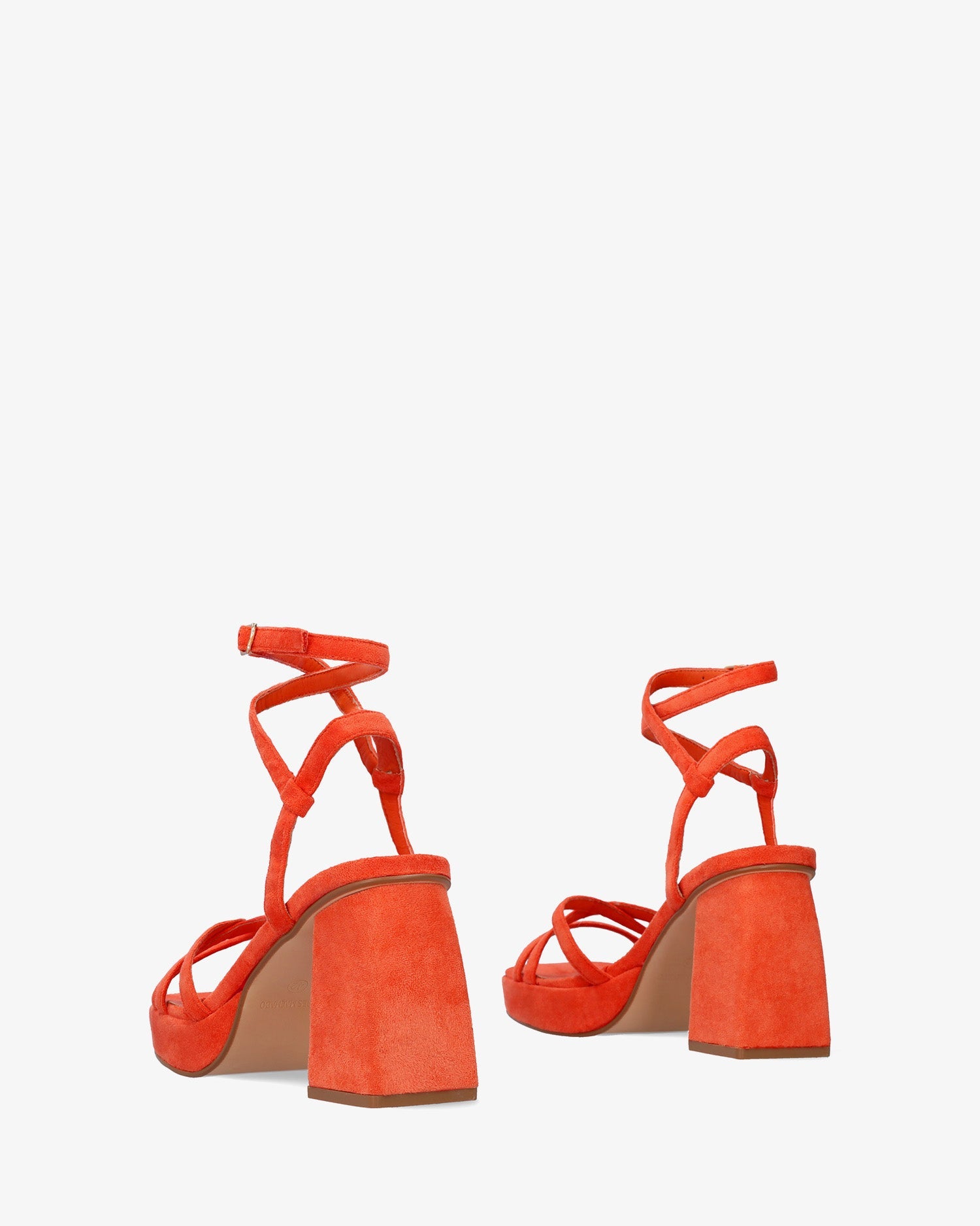 Sandalias en símil ante color Naranja con tacón cuadrado y plataforma. Diseño destalonado con tiras finas entrelazadas al tono en la parte delantera. Cierre de hebilla metálica con tiras envolventes en el tobillo. Punta abierta y cuadrada. Tacón de 10,5 cm y plataforma de 2,5 cm para las tallas pequeñas de la 32 a la 35. Tacón de 11 cm y plataforma de 2,5 cm para las tallas grandes de la 42 a la 45.