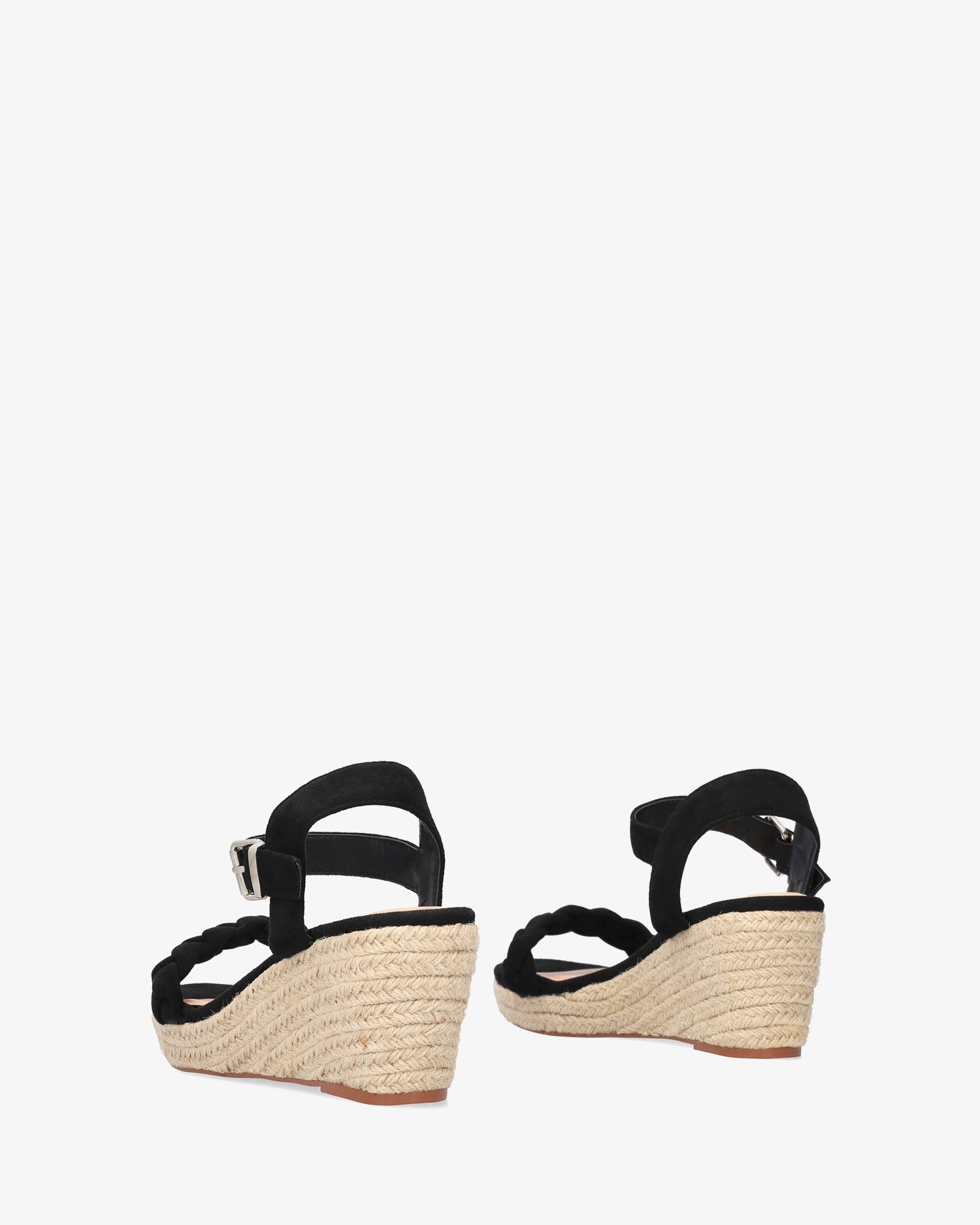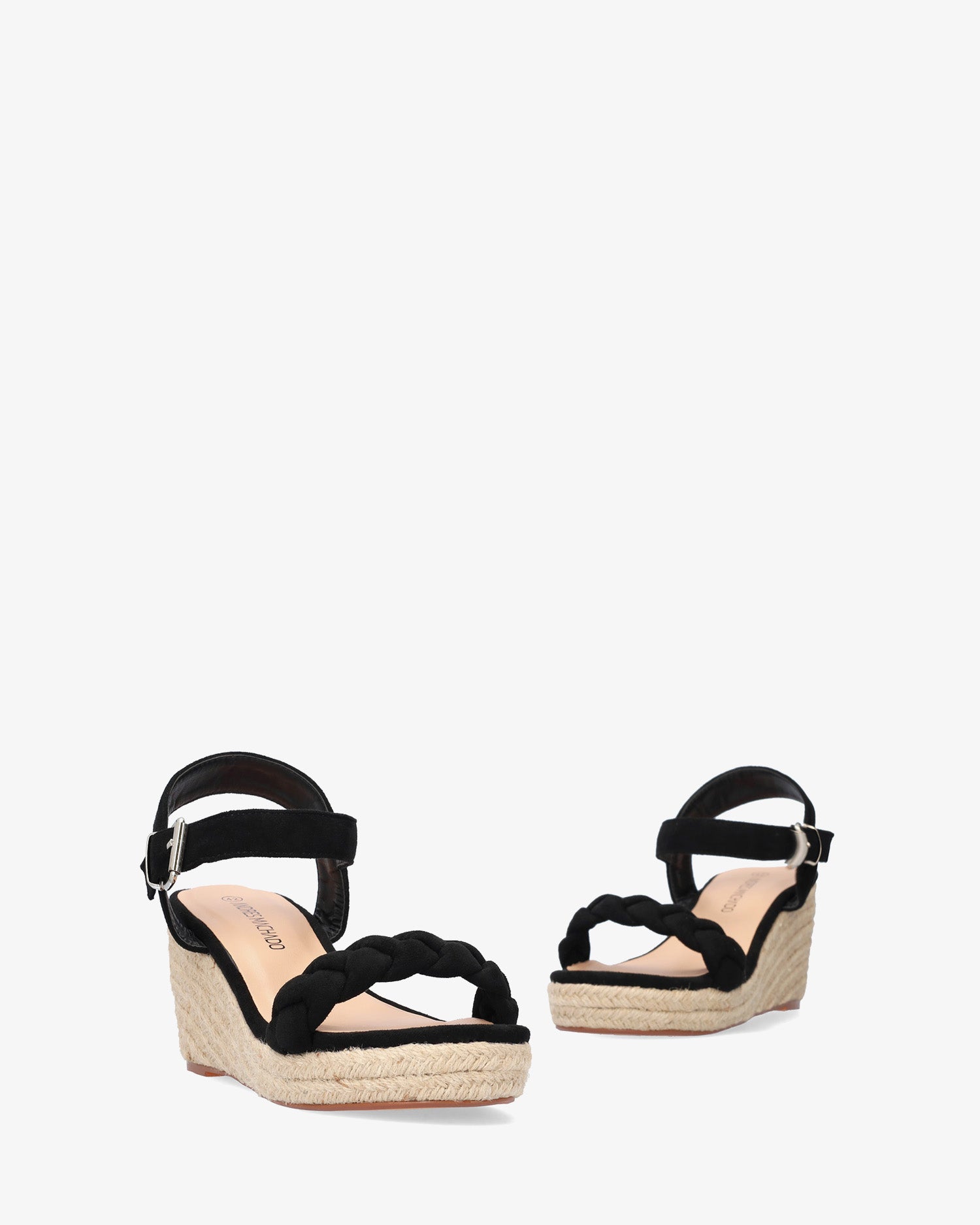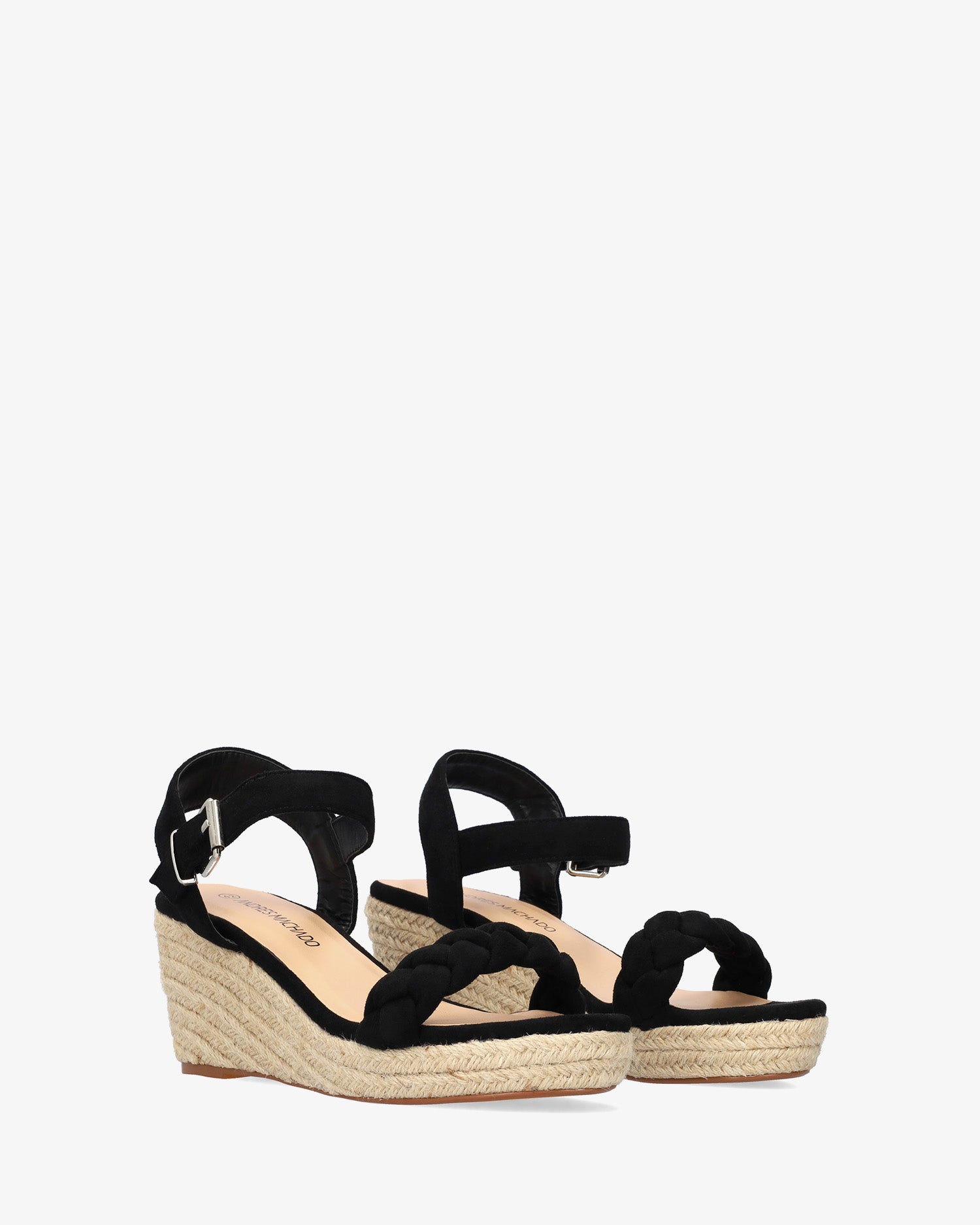 Sandalias en símil ante de color Negro con cuña. Diseño destalonado y tira ancha trenzada al tono en la parte delantera. Cierre con hebilla metálica con tira ancha alrededor del tobillo. Puntera abierta. Cuñas y plataforma delantera en yute. Cuña de 7 cm y plataforma de 2,5 cm para las tallas pequeñas de la 32 a la 35. Cuña de 8,5 cm y plataforma de 3 cm para las tallas grandes de la 42 a la 45. Este modelo puede tener una variación de medidas respecto al estandar, te recomendamos que revises los cms de la plantilla o suela interior.