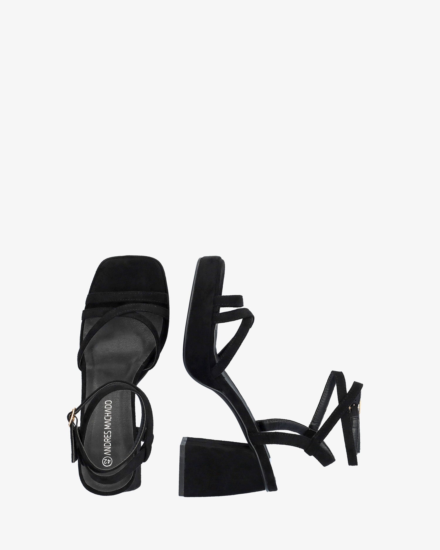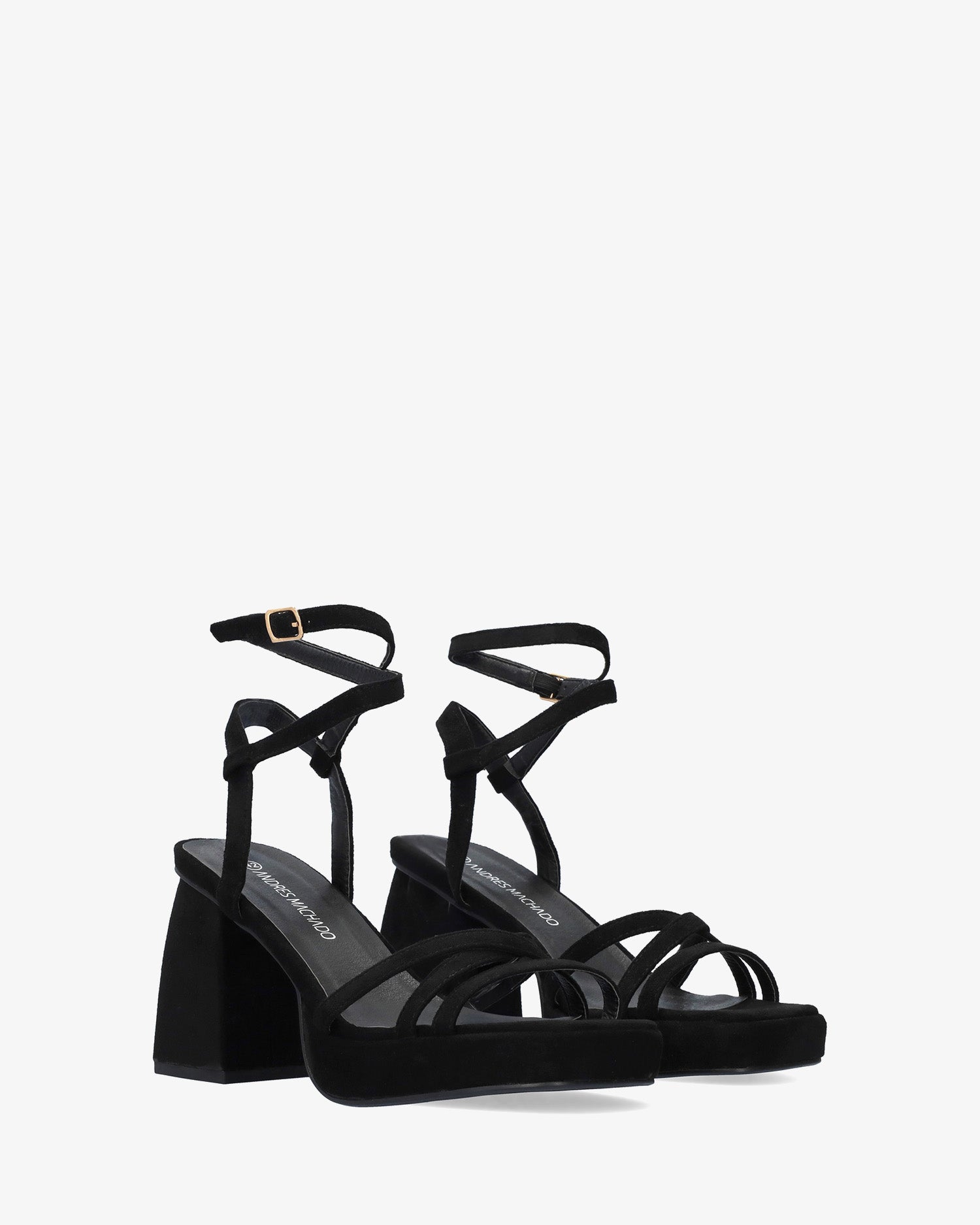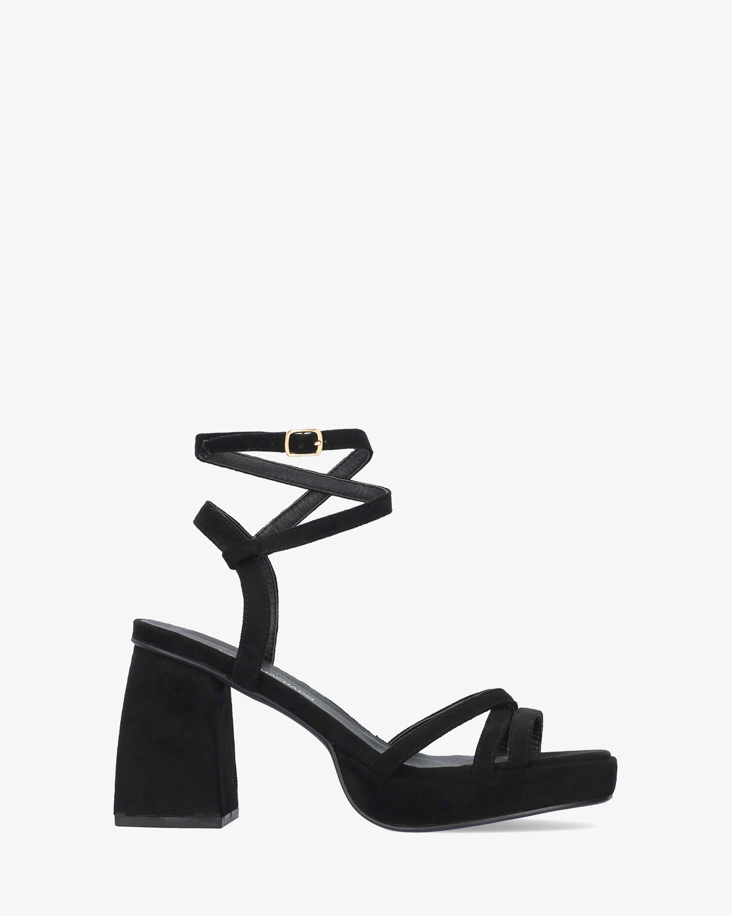 Sandalias en símil ante color Negro con tacón cuadrado y plataforma. Diseño destalonado con tiras finas entrelazadas al tono en la parte delantera. Cierre de hebilla metálica con tiras envolventes en el tobillo. Punta abierta y cuadrada. Tacón de 10,5 cm y plataforma de 2,5 cm para las tallas pequeñas de la 32 a la 35. Tacón de 11 cm y plataforma de 2,5 cm para las tallas grandes de la 42 a la 45.