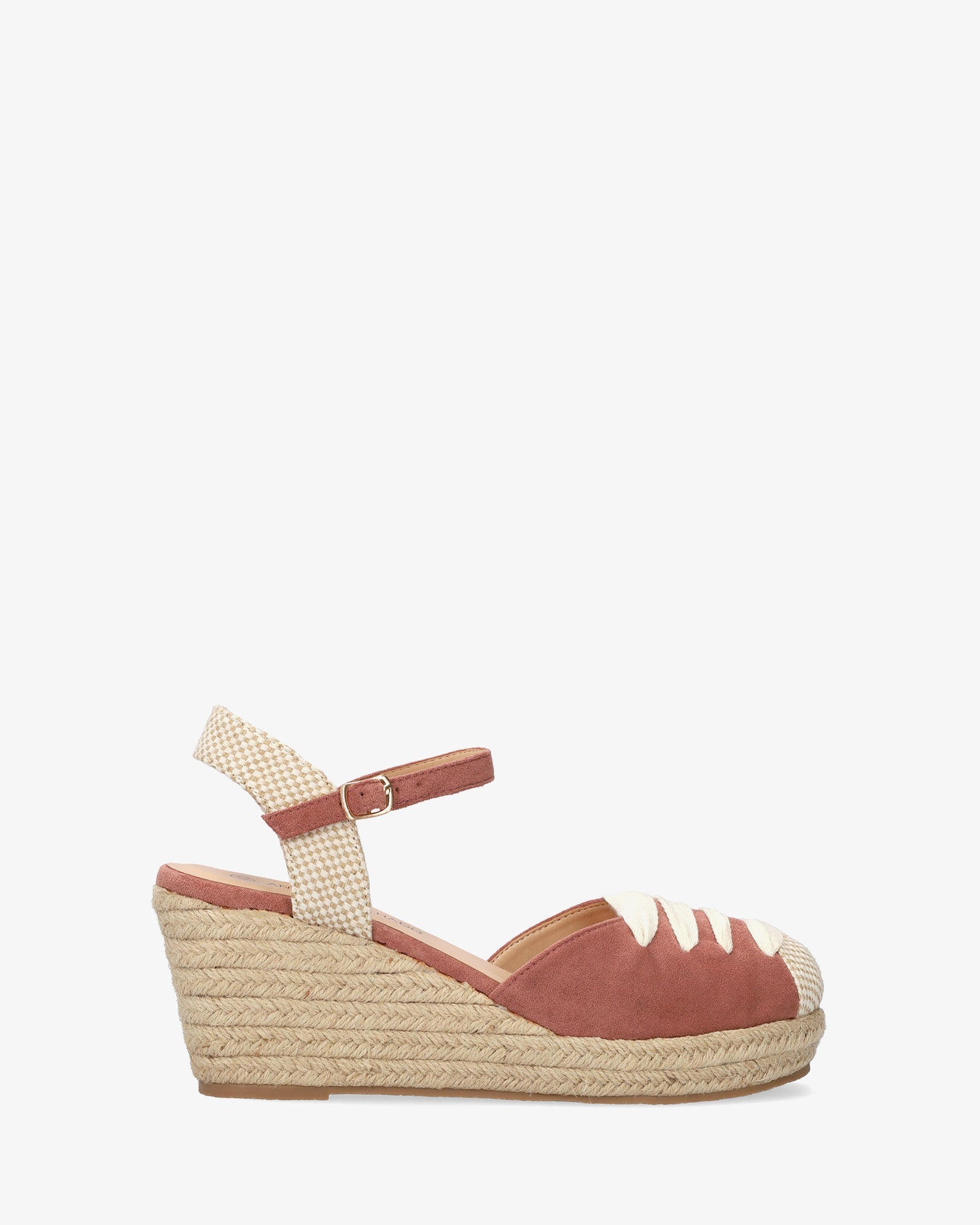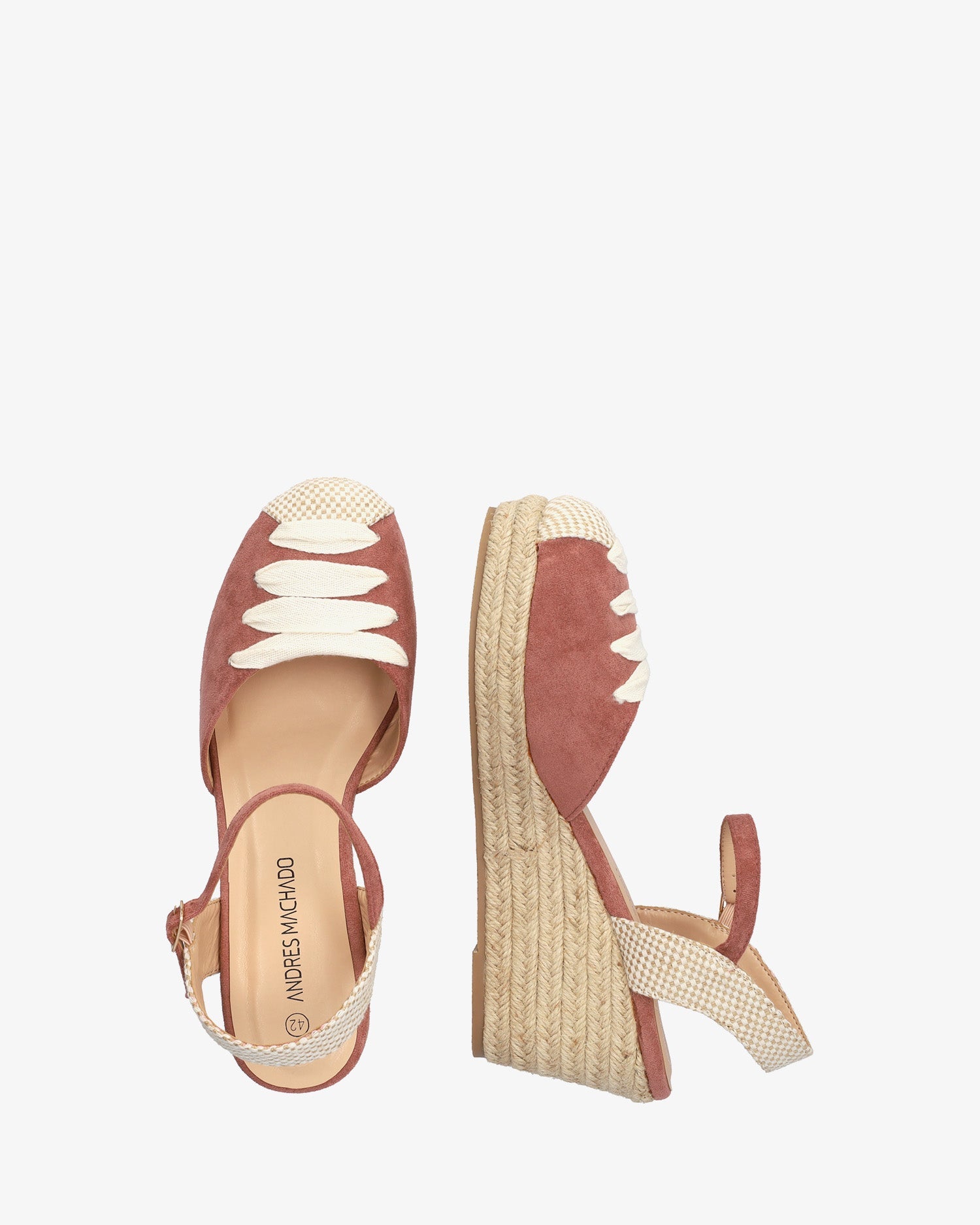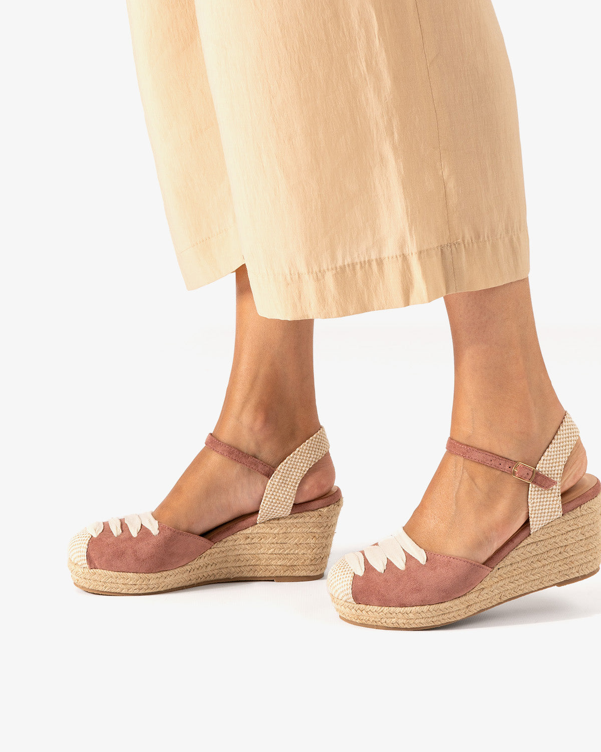 Sandalia con cuña en yute en símil de ante en color Rosa. Diseño destalonado con punta redondeada y cerrada, con detalle de tejido y decorada con cordones anchos en parte delantera. Cierre mediante hebilla metálica con pulsera al tono, para mejor sujeción al tobillo. Cuña y plataforma delantera en yute. Cuña de 7 cm y plataforma de 2 cm para las tallas pequeñas de la 32 a la 35. Cuña de 8 cm y plataforma de 2,5 cm para las tallas grandes de la 42 a la 46.