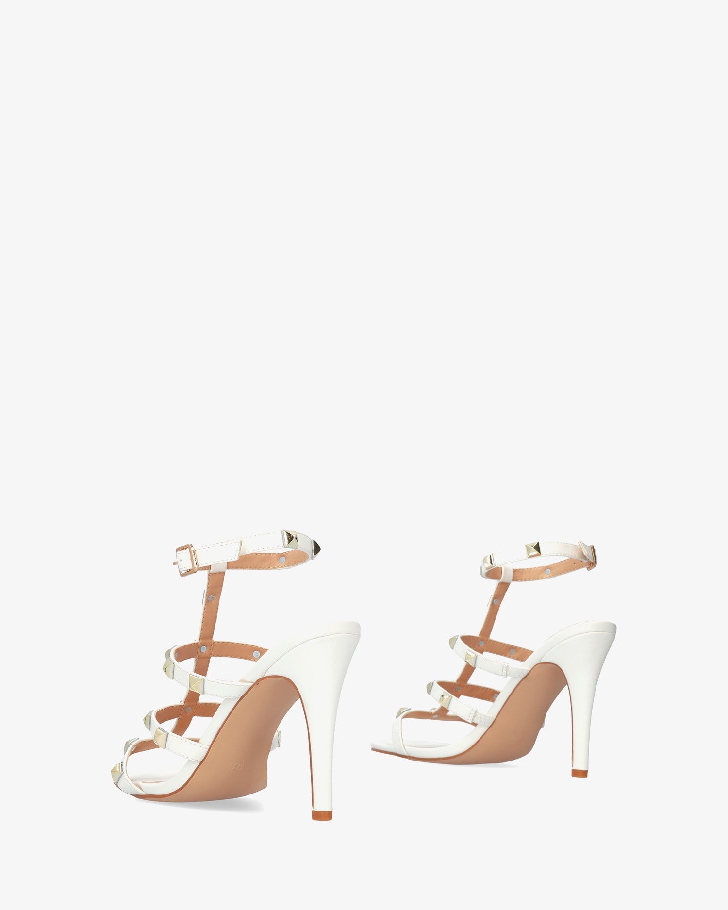 Sandalias en soft color Blanco con tacón alto. Diseño destalonado con tres tiras finas en la parte delantera y empeine al tono. Detalle con remaches dorados en todas las tiras. Cierre de hebilla metálica con pulsera en el tobillo. Puntera abierta y cuadrada. Tacón de 10,5 cm para las tallas pequeñas de la 32 a la 35. Tacón de 12 cm para las tallas grandes de la 42 a la 45.