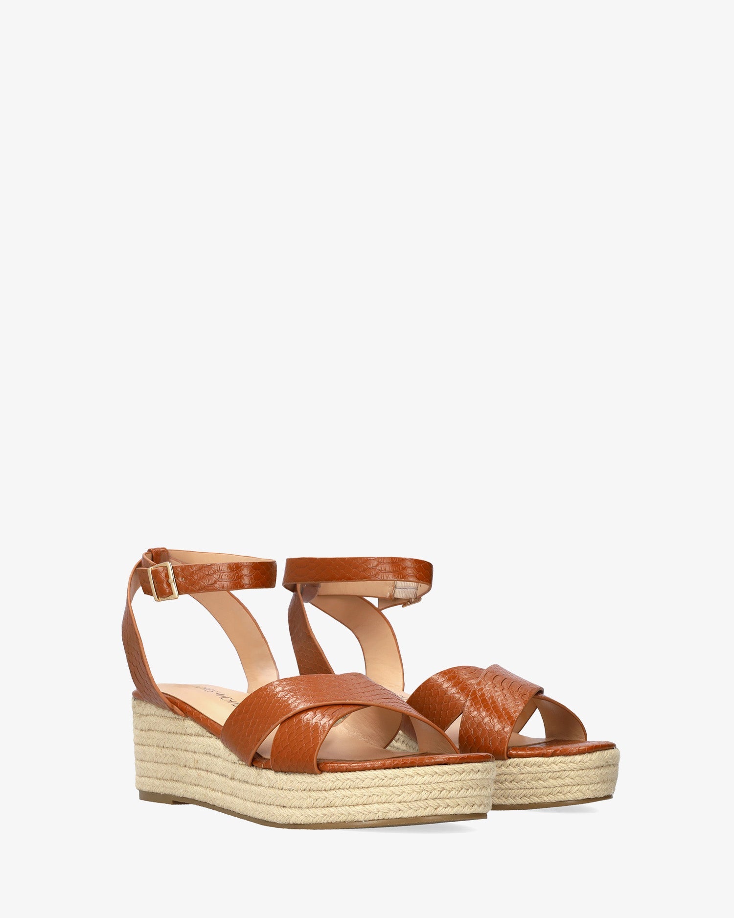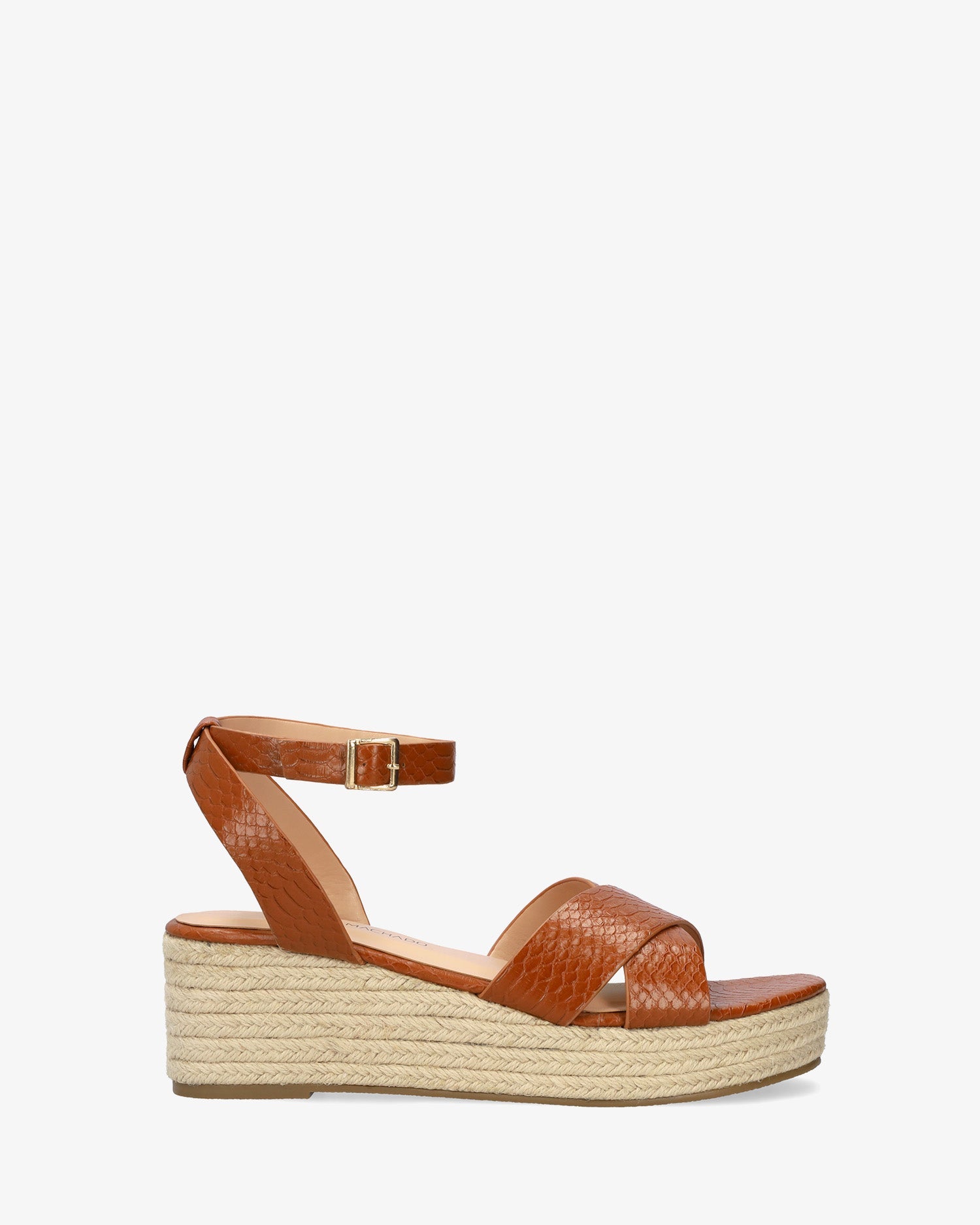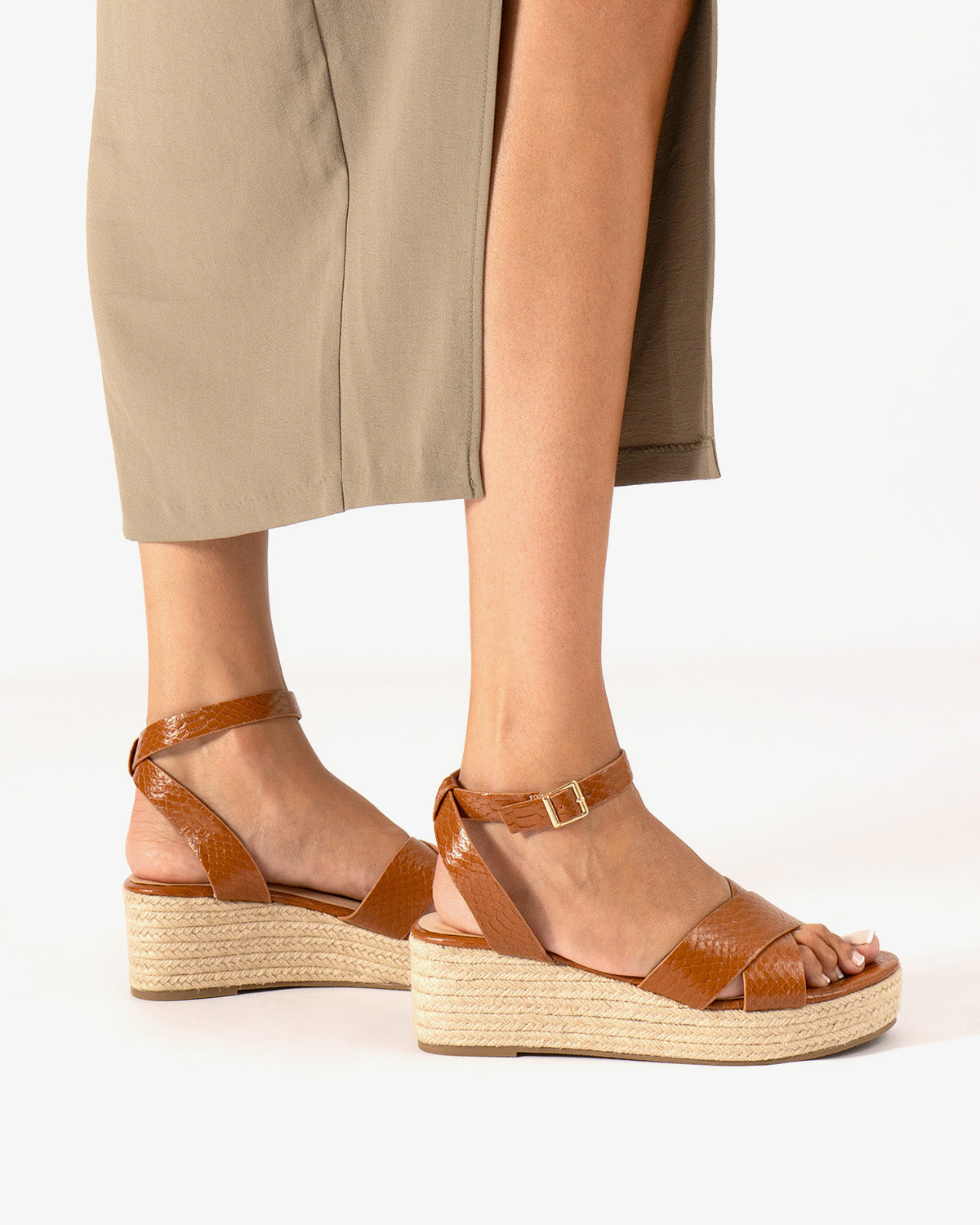 Sandalia con cuña en yute en soft coco de color Marrón. Diseño destalonado con tiras anchas cruzadas al tono en parte delantera.Cierre con hebilla metálica y ajuste trasero para mejor sujeción al tobillo. Punta abierta y redondeada. Cuña y plataforma delantera en yute. Cuña de 6 cm y plataforma de 3 cm para las tallas pequeñas de la 32 a la 35. Cuña de 6,5 cm y plataforma de 3 cm para las tallas grandes de la 42 a la 46.