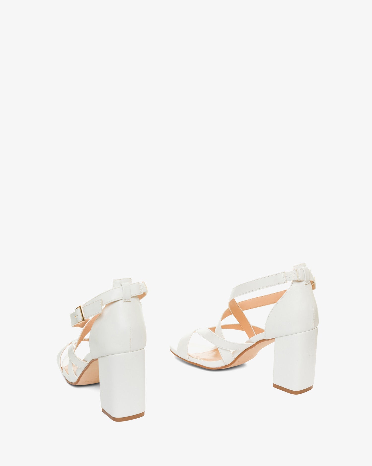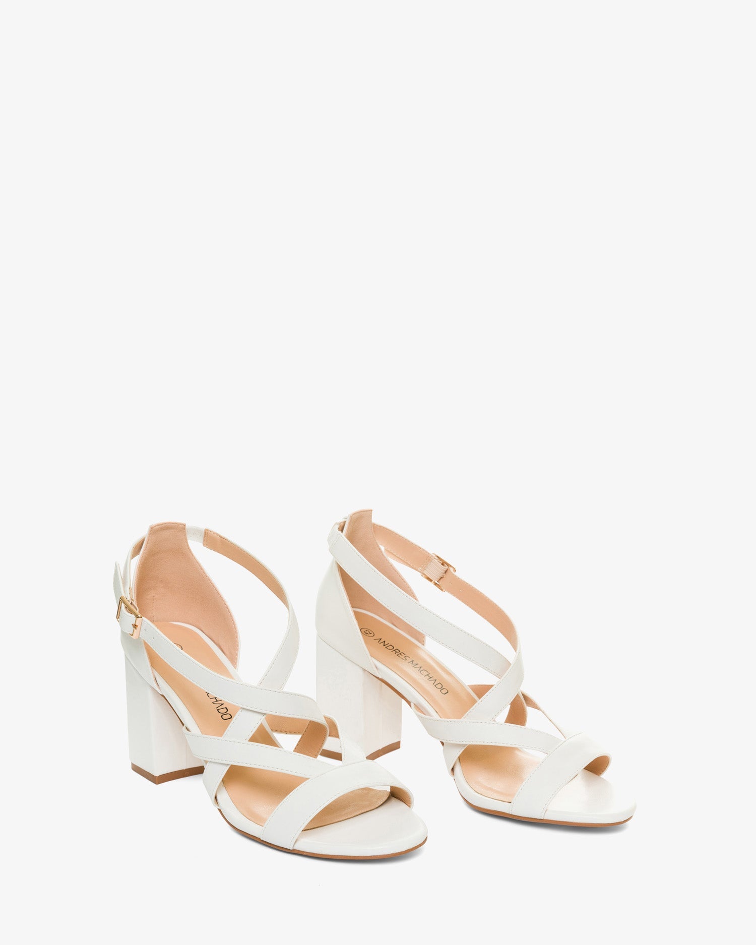 Sandalias con tacón alto cuadrado en soft color Blanco. Talonera cubierta con tiras cruzadas sobre el empeine al tono. Cierre con hebilla metálica al tobillo. Puntera redondeada y abierta. Tacón de 7 cm para las tallas pequeñas de la 32 a la 35. Tacón de 9 cm para las tallas grandes de la 42 a la 45.