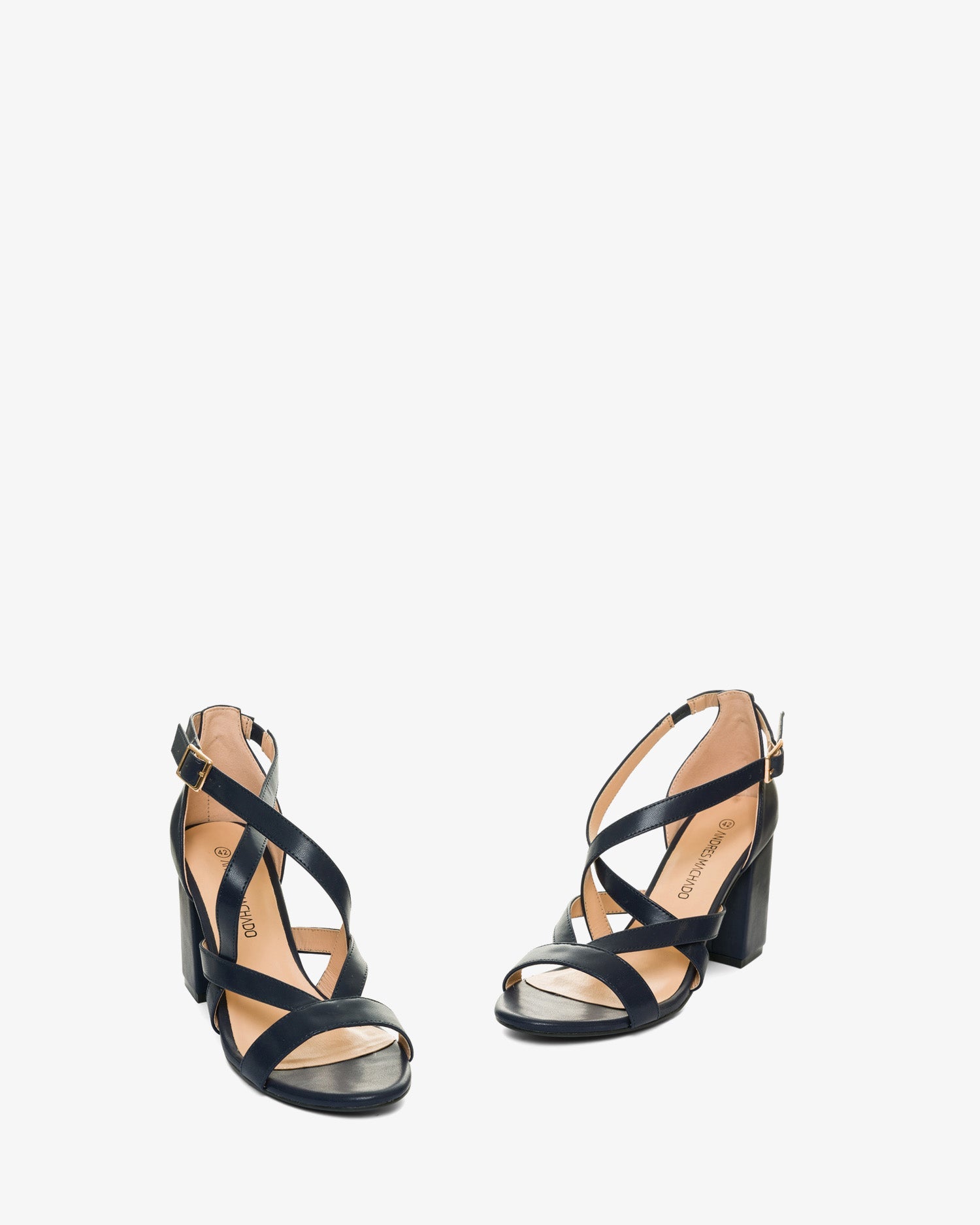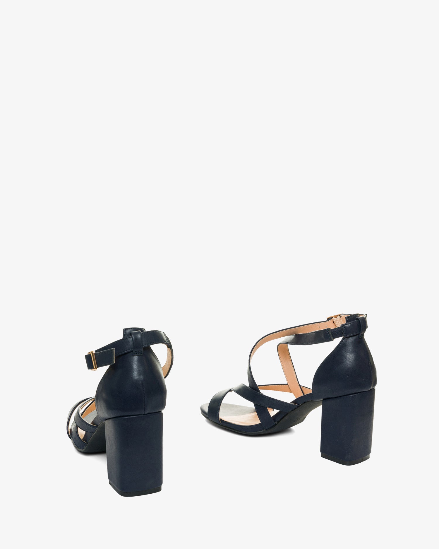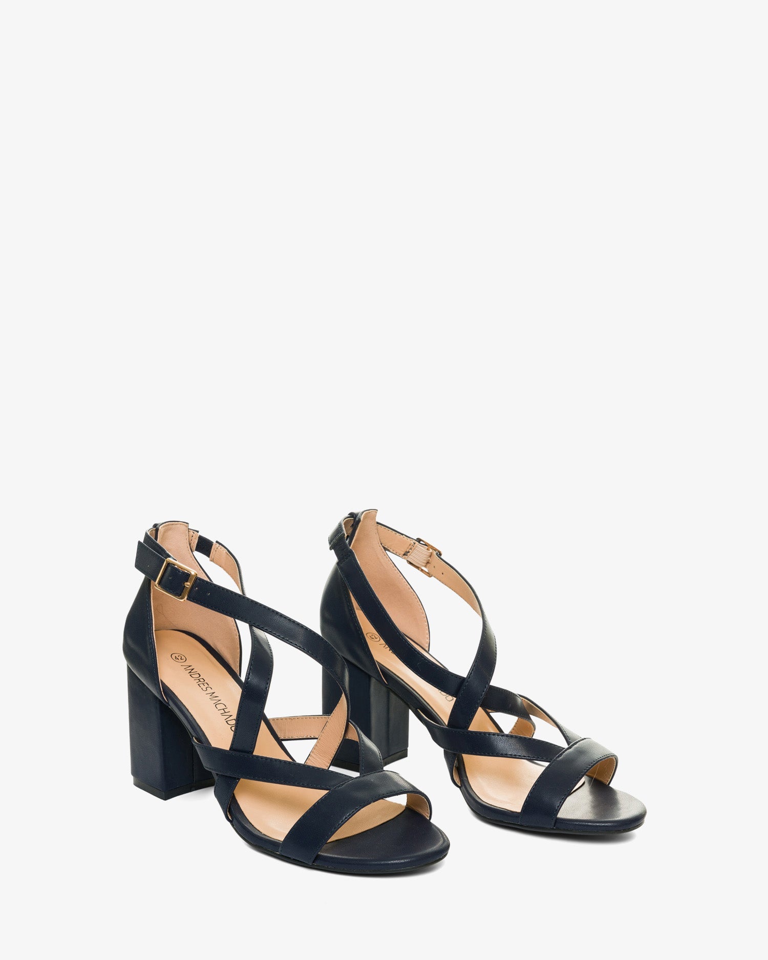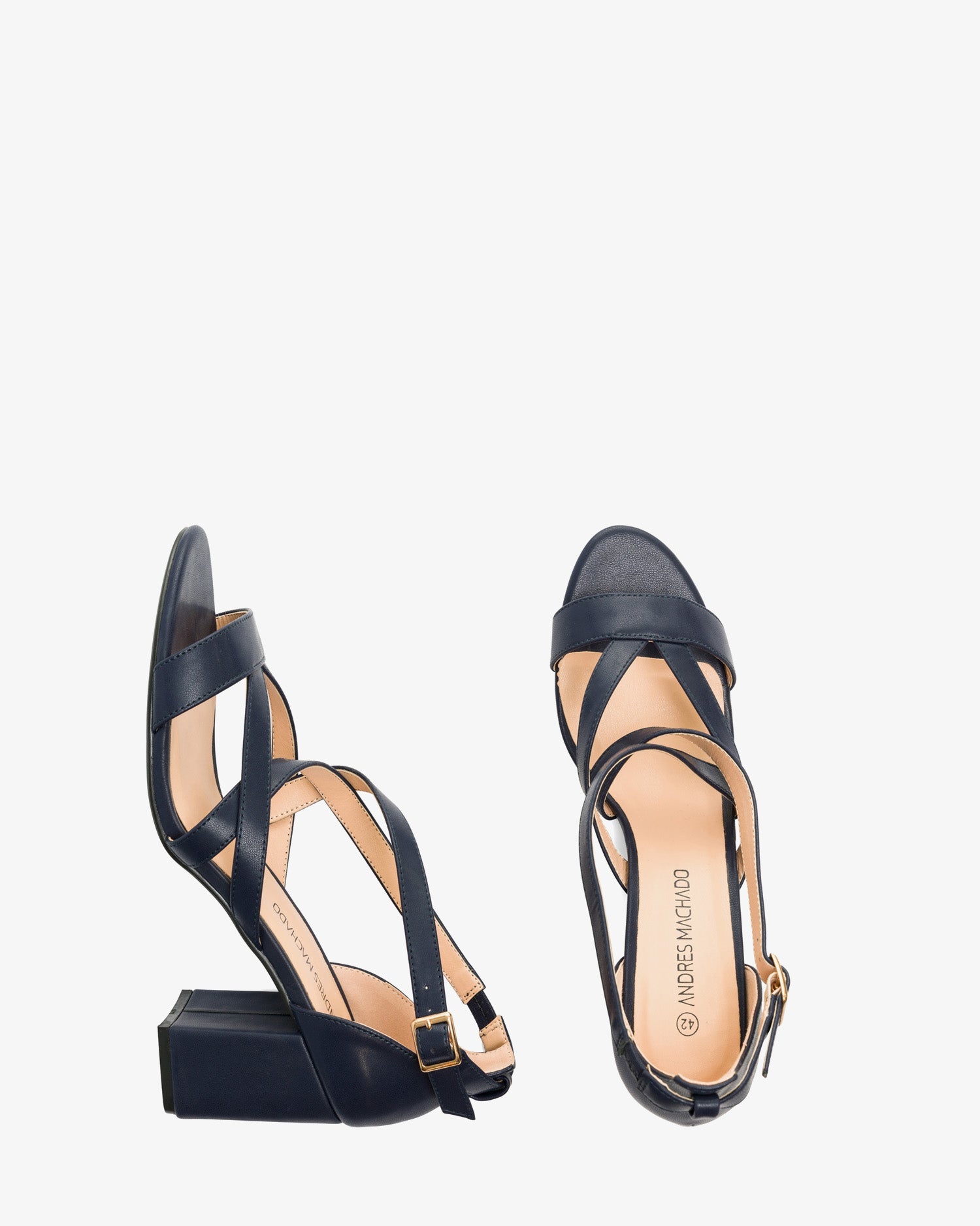 Sandalias con tacón alto cuadrado en soft color Marino. Talonera cubierta con tiras cruzadas sobre el empeine al tono. Cierre con hebilla metálica al tobillo. Puntera redondeada y abierta. Tacón de 7 cm para las tallas pequeñas de la 32 a la 35. Tacón de 9 cm para las tallas grandes de la 42 a la 45.