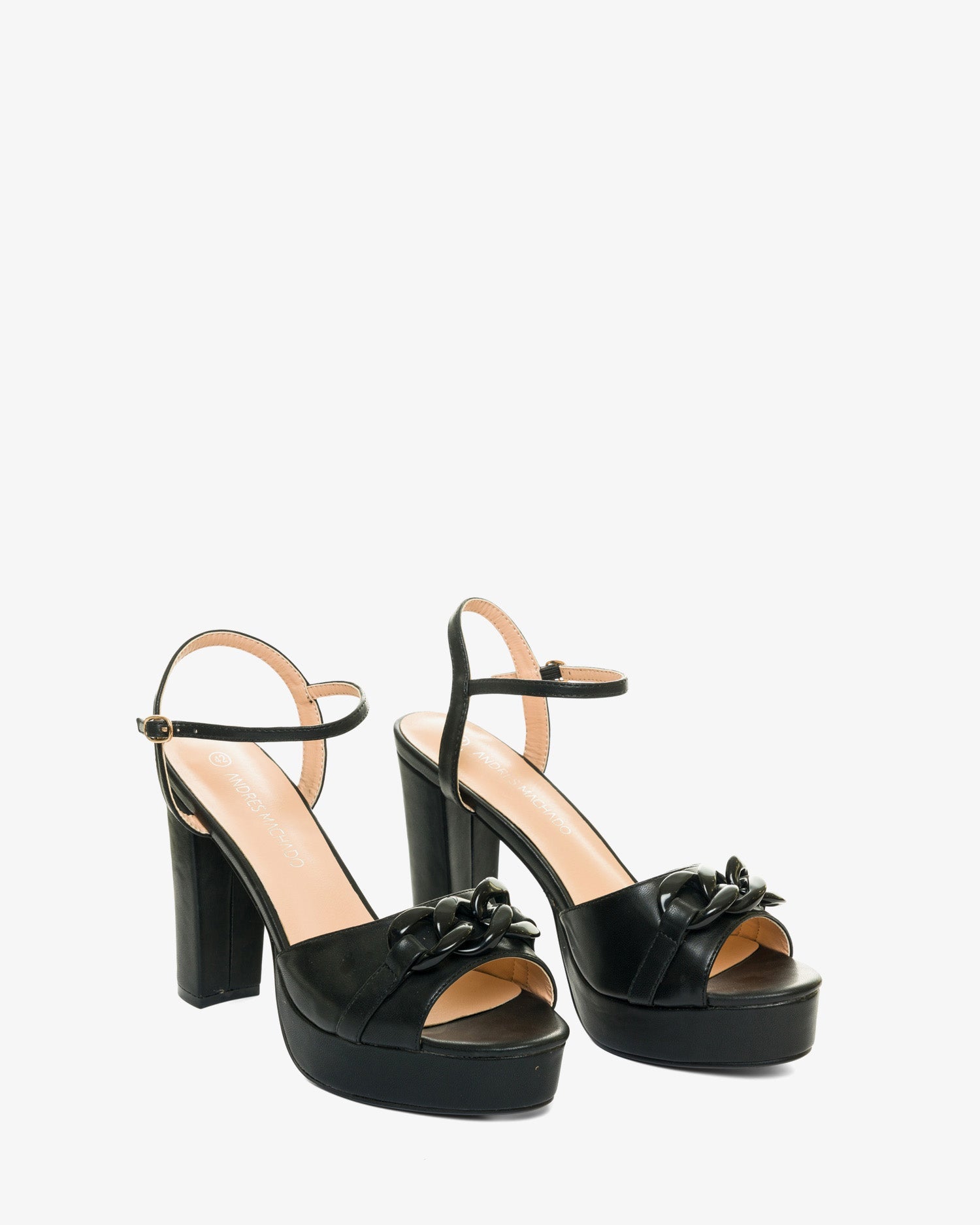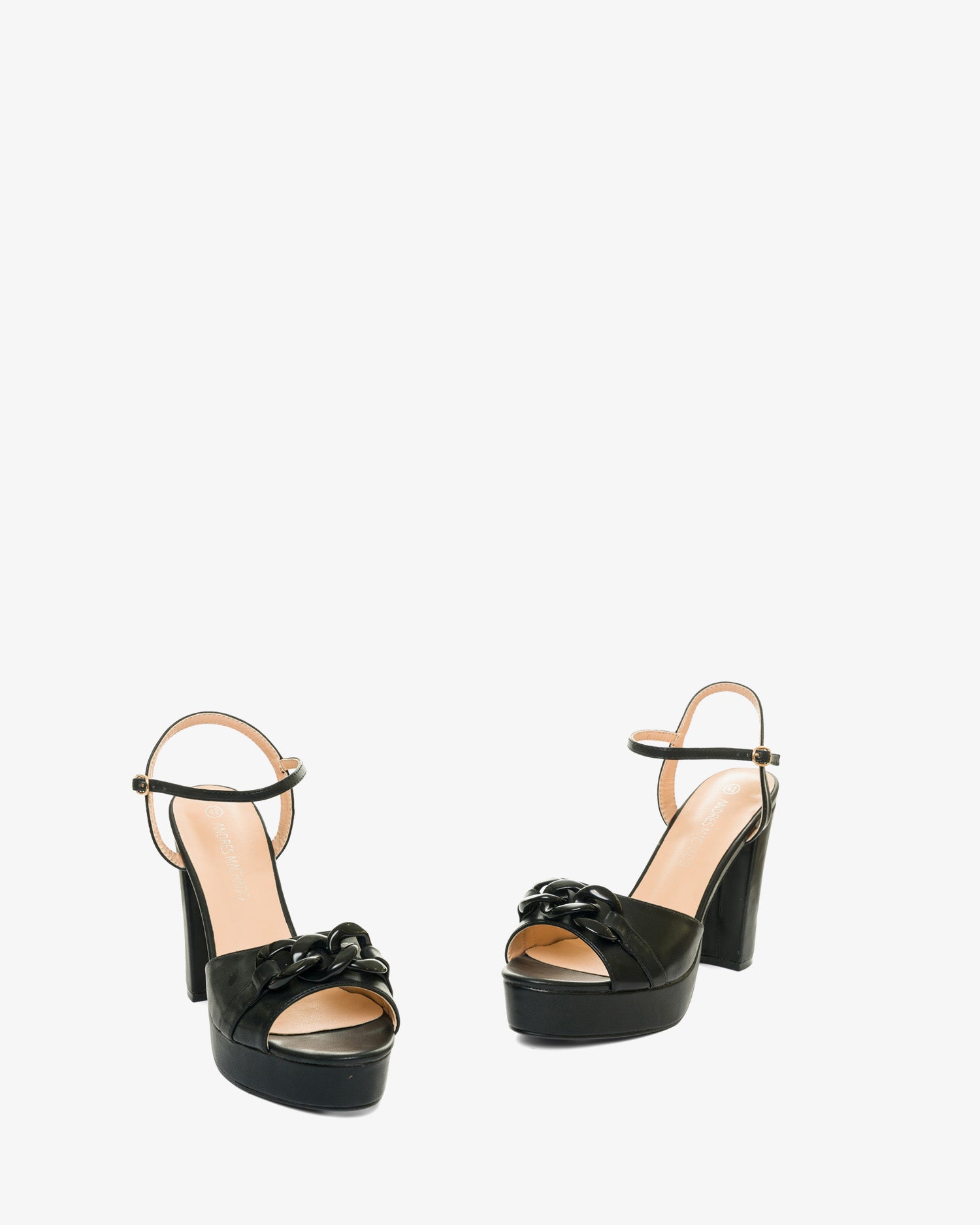 Sandalias con tacón alto en soft color Negro. Diseño destalonado con tira ancha y detalle con cadena de eslabones en la puntera al tono. Cierre de hebilla con pulsera alrededor del tobillo. Puntera redondeada y abierta. Plataforma forrada al tono de 3cm de alto y tacón recto y ancho al tono de 11 cm para las tallas pequeñas de la 32 a la 35. Plataforma forrada al tono de 3cm de alto y tacón recto y ancho al tono de 12cm para las tallas grandes de la 42 a la 45.