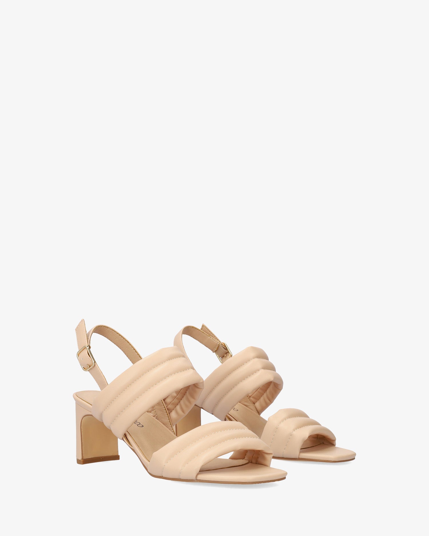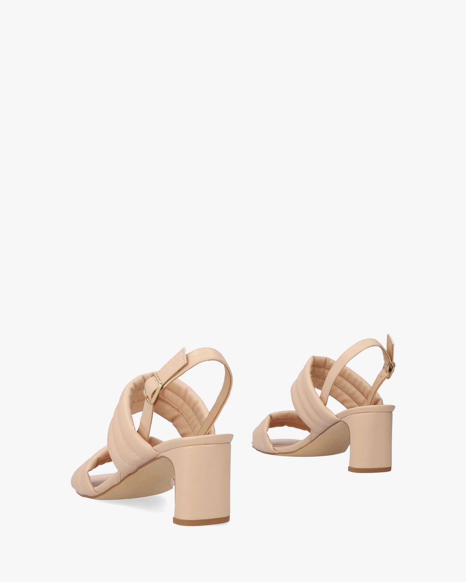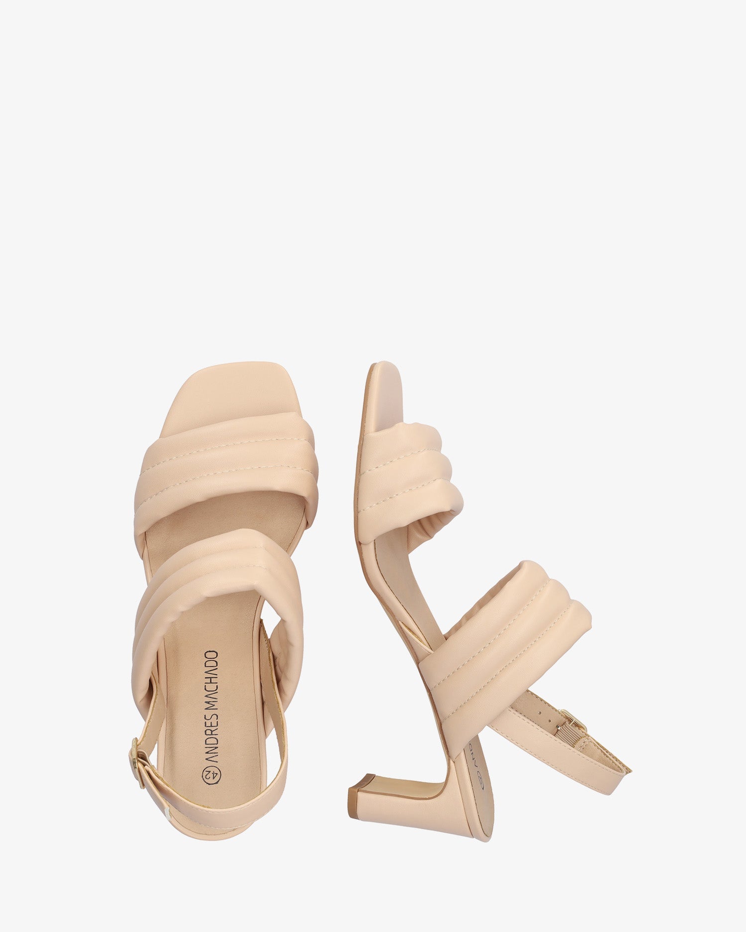 Sandalias en soft color Crema con tacón semi-cuadrado. Diseño destalonado con tiras anchas en relieve con pespunte en la parte delantera y en el empeine al tono. Punta abierta y cuadrada. Cierre de hebilla metálica alrededor del tobillo. Tacón de 7,5 cm para las tallas pequeñas de la 32 a la 35. Tacón de 8 cm para las tallas grandes de la 42 a la 45.