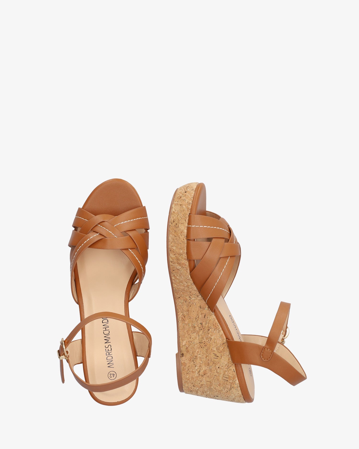 Sandalias en soft de color Marrón con cuña forrado en corcho. Diseño destalonado con tiras delanteras cruzadas y detalle hilo cosido tono beige. Cierre de hebilla metálica con tira al tono en el tobillo. Puntera abierta. Cuñas y plataforma delantera forrado en corcho. Cuña de 7 cm y plataforma de 2 cm para las tallas pequeñas de la 32 a la 35. Cuña de 8 cm y plataforma de 2,5 cm para las tallas grandes de la 42 a la 45. Este modelo calza pequeño, se recomienda coger una talla más de la habitual.
