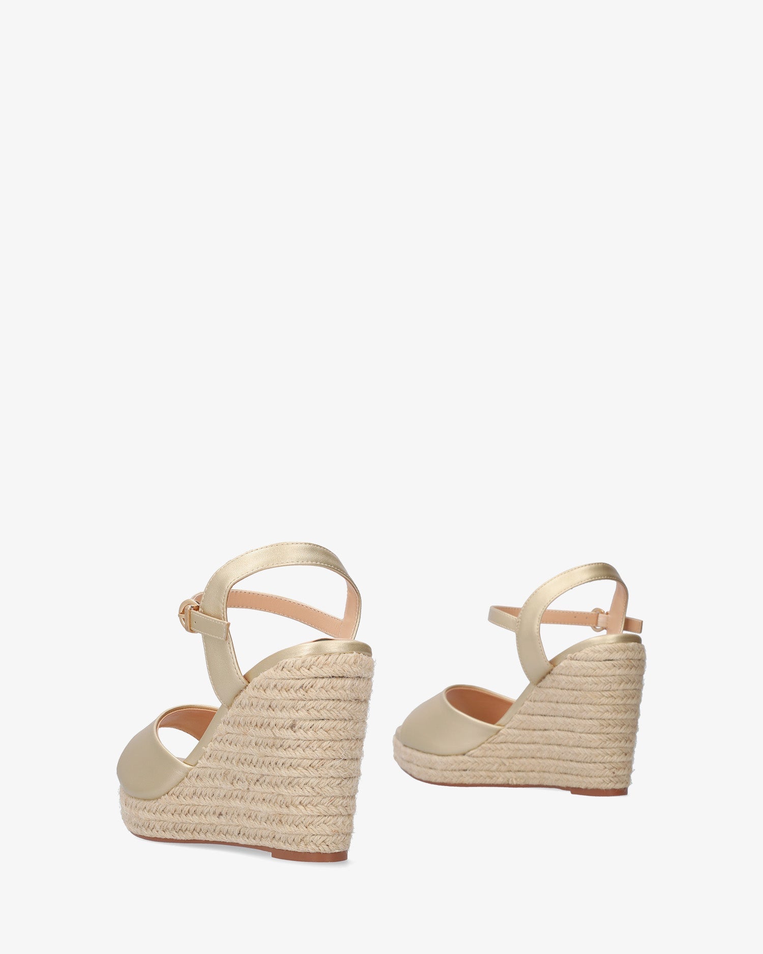 Sandalias en soft de color Oro con cuña. Diseño destalonado de tira ancha en la parte delantera. Cierre de hebilla metálica con tira al tono en el tobillo. Puntera abierta. Cuñas y plataforma delantera en yute. Cuña de 10 cm y plataforma de 2,5 cm para las tallas pequeñas de la 32 a la 35. Cuña de 11,5 cm y plataforma de 3 cm para las tallas grandes de la 42 a la 45. Calza estrecho. Te recomendamos coger una talla más si tienes el pie ancho o estás entre dos tallas.