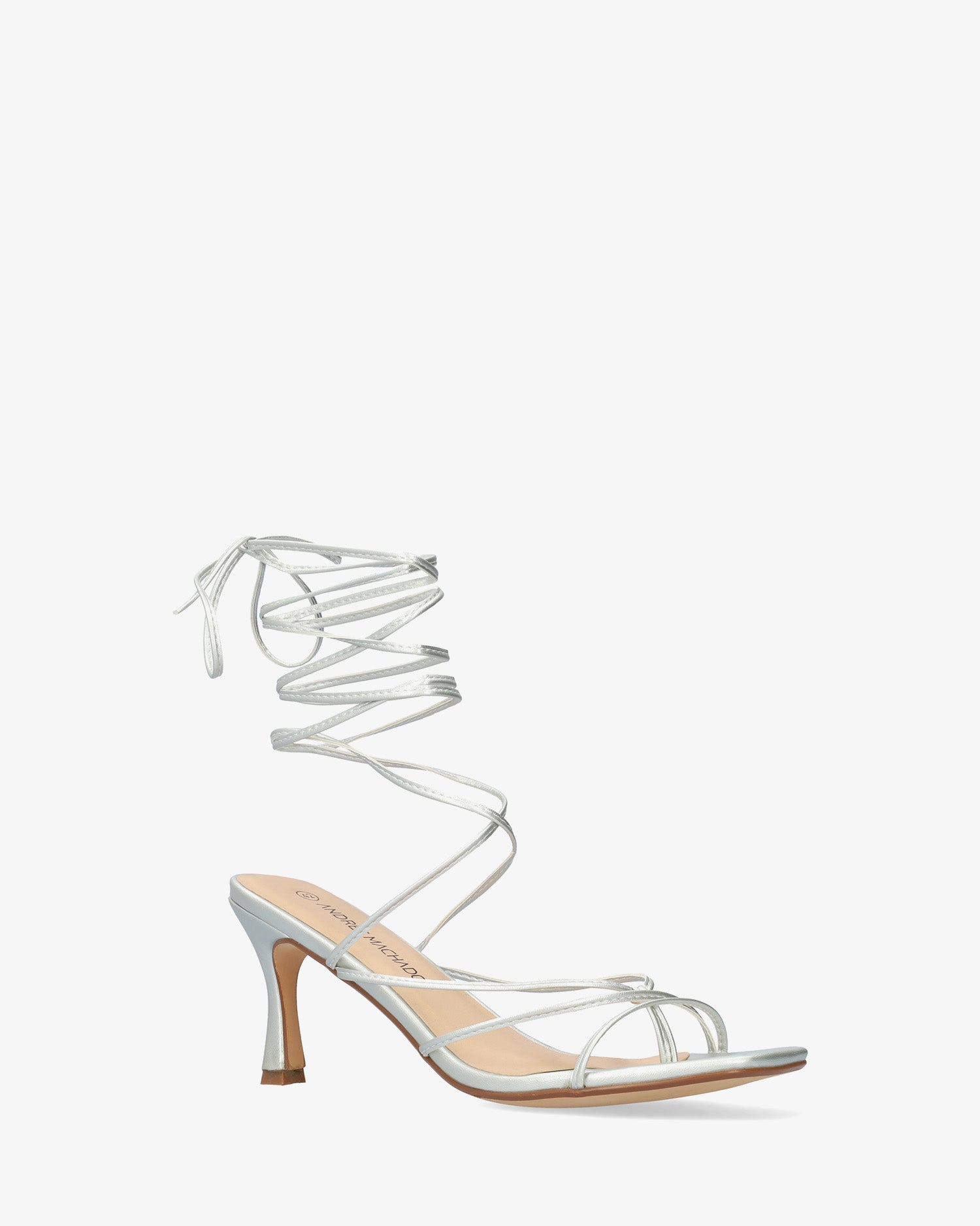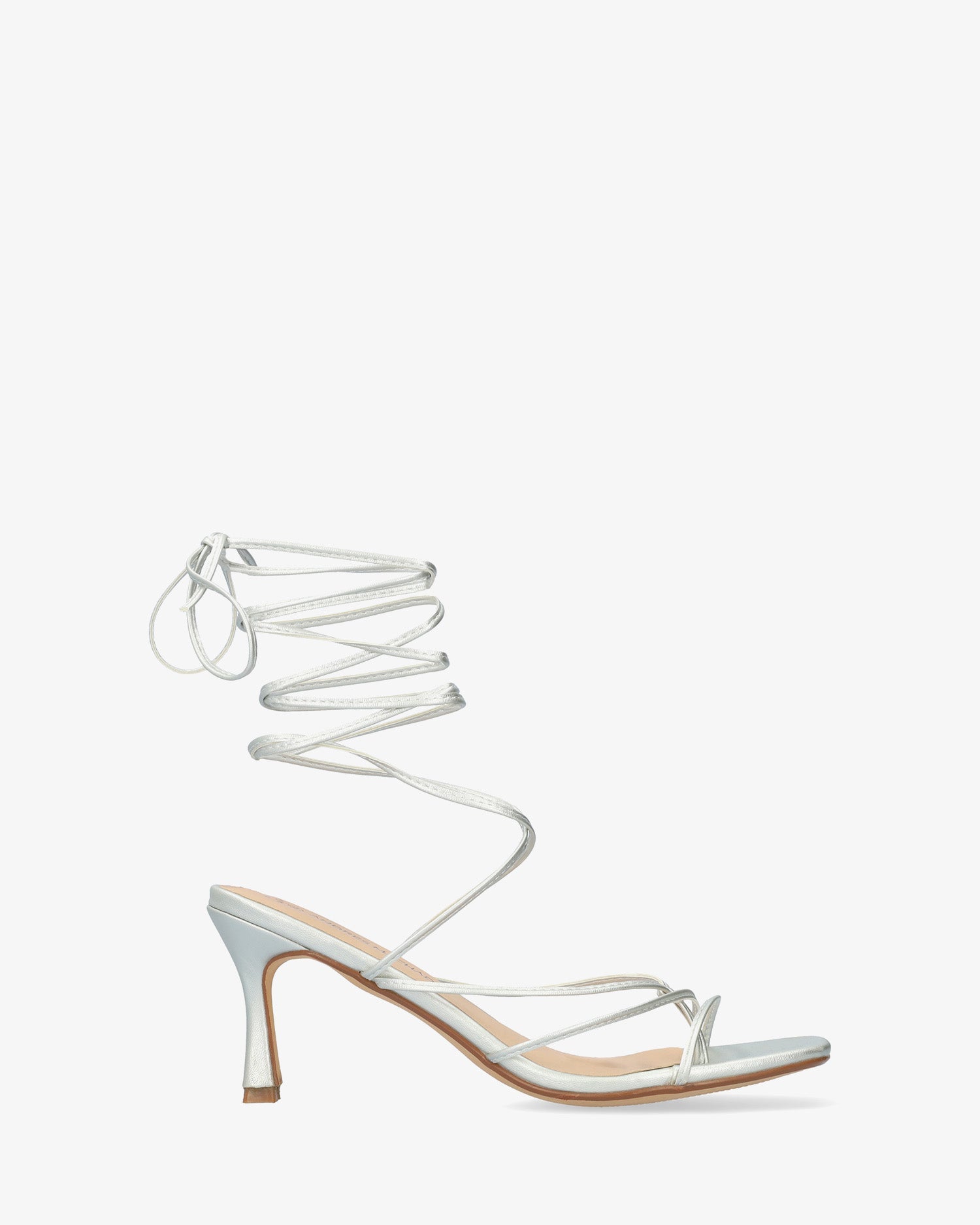 Sandalias en soft color Plata con tacón Kitten. Diseño destalonado con tiras entrelazadas en el tobillo y tiras delanteras de dedo en forma V invertida en el empeine. Puntera abierta y cuadrada. Tacón de 7,5 cm para las tallas pequeñas de la 32 a la 35. Tacón de 9 cm para las tallas grandes de la 42 a la 45.