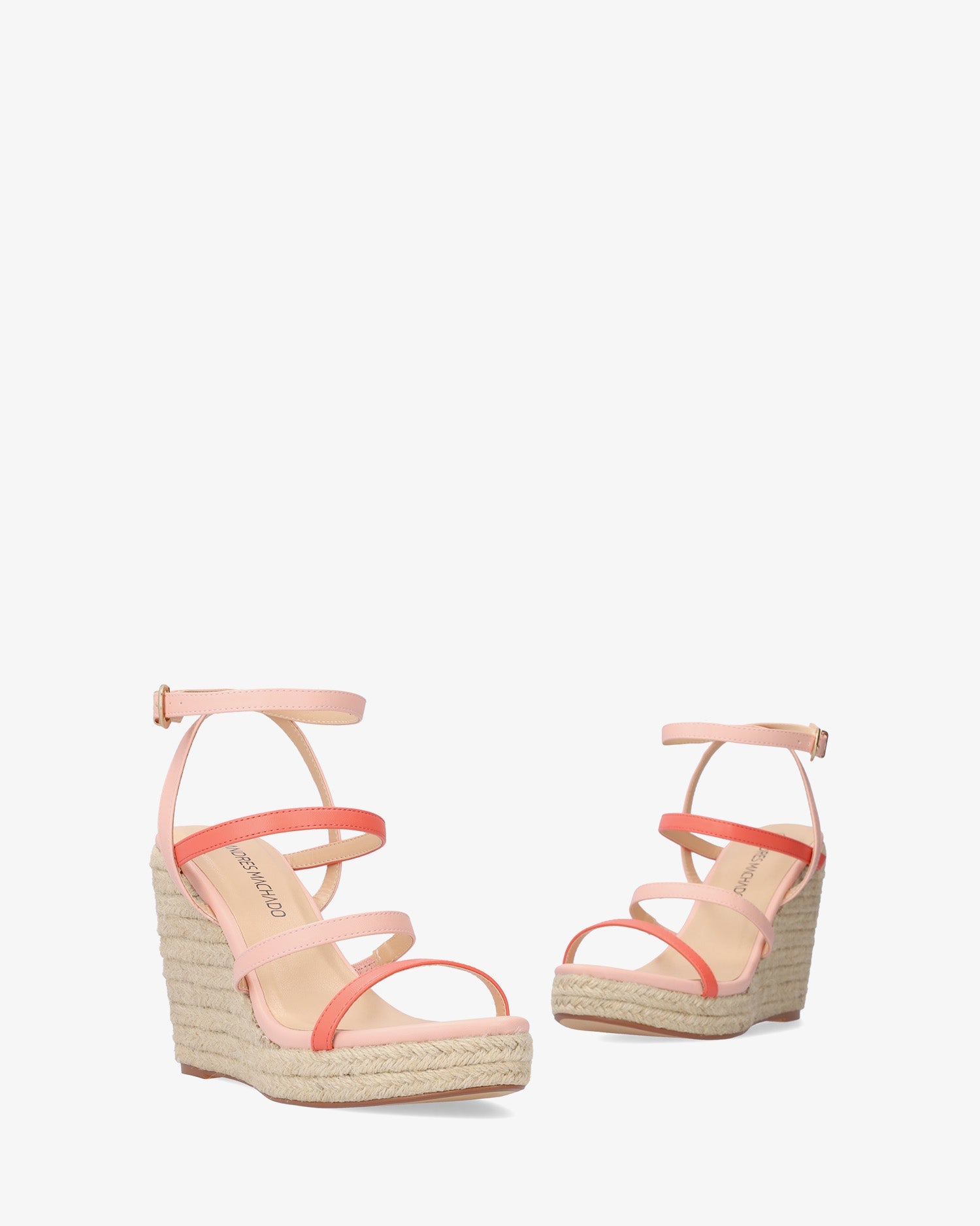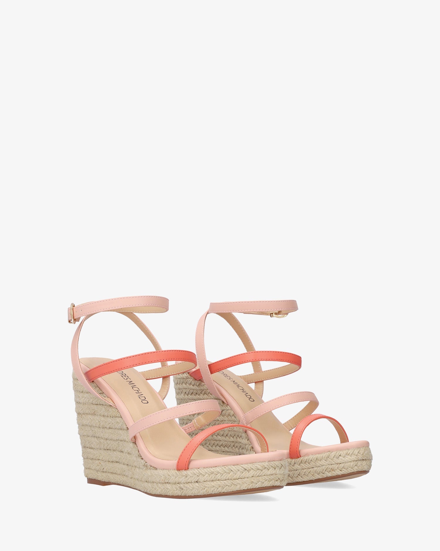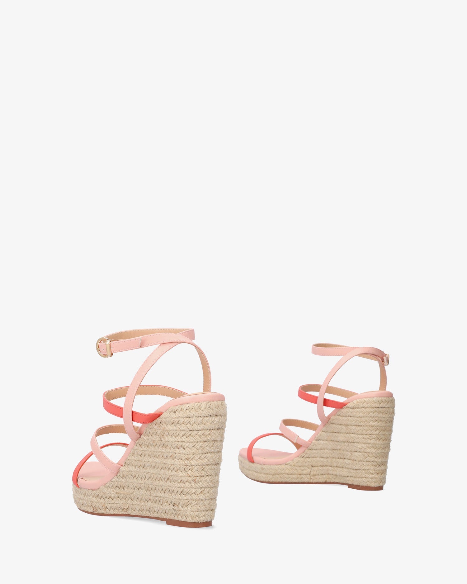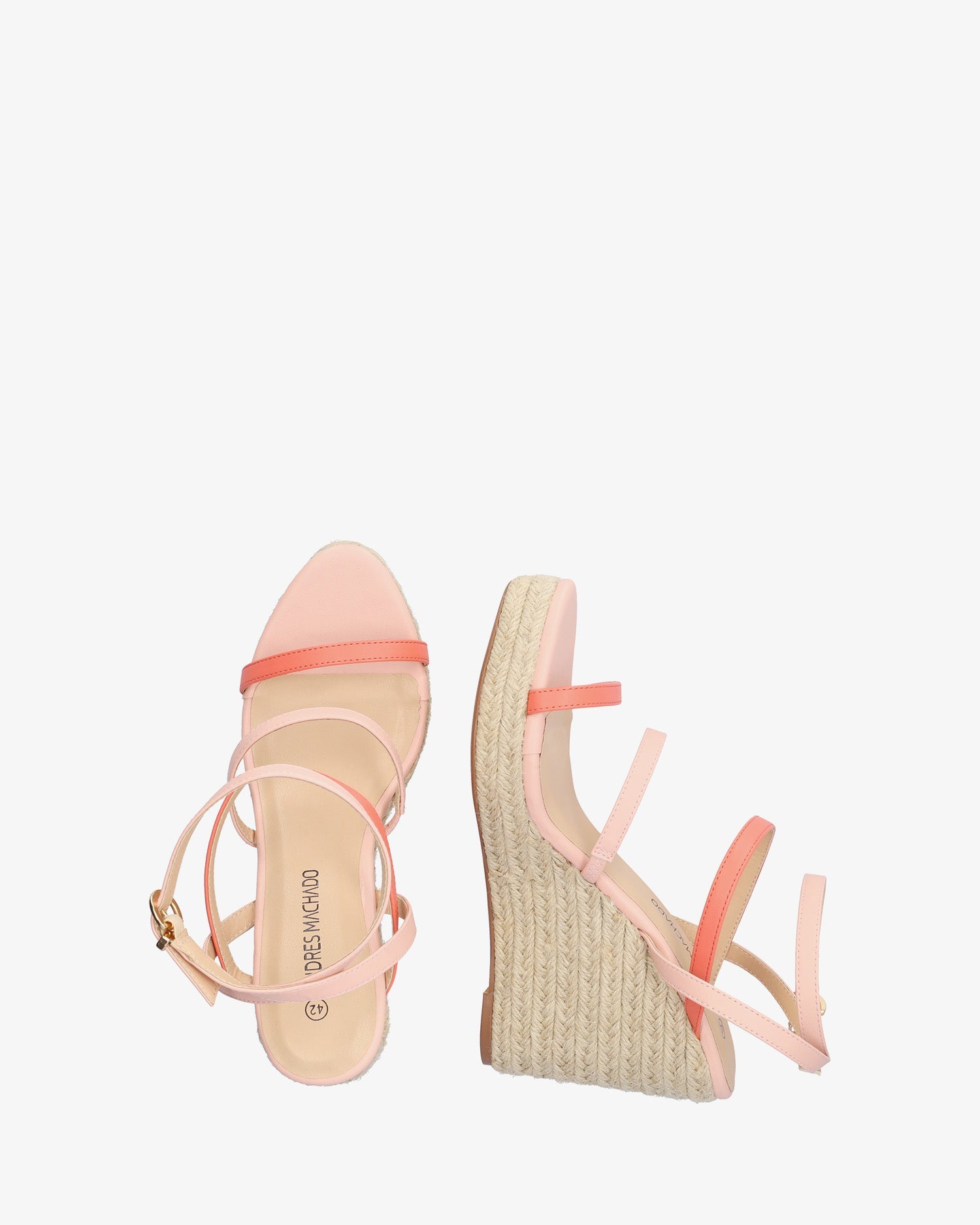 Sandalias en soft de color Salmón con cuña. Diseño destalonado con 3 tiras finas en parte delantera y empeine de color salmón y maquillaje. Cierre de hebilla con pulsera al tono en el tobillo. Puntera abierta. Cuñas y plataforma delantera en yute. Cuña de 10,5 cm y plataforma de 2,5 cm para las tallas pequeñas de la 32 a la 35. Cuña de 11,5 cm y plataforma de 3 cm para las tallas grandes de la 42 a la 45.